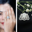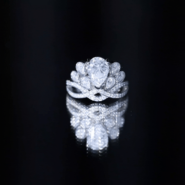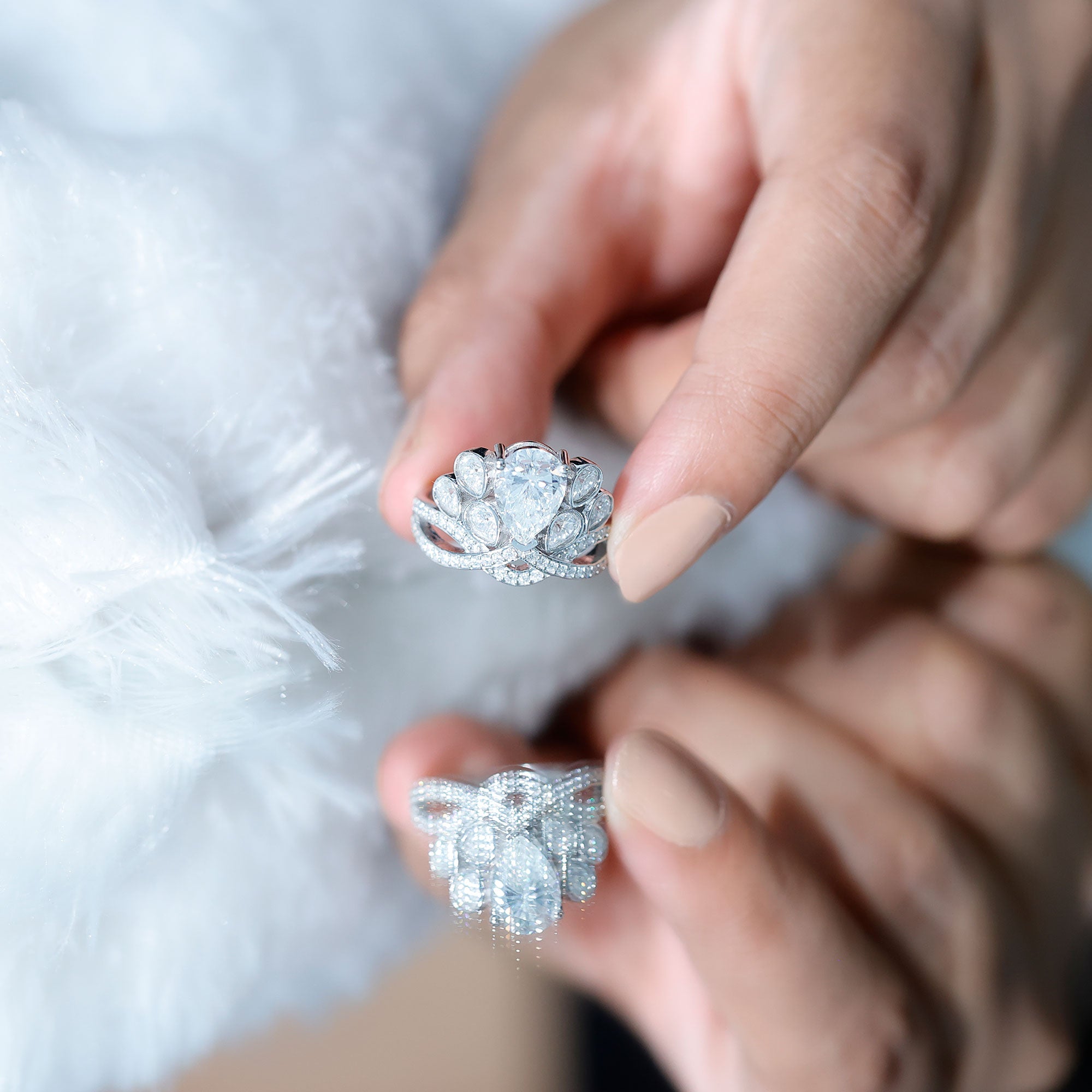 Looking for something to astonish your lady, we got your back with this Moissanite Statement Engagement Ring. It features a 7X10 MM Pear Shape Moissanite securely placed in Prong Setting and handcrafted with 14K White Gold Plated Silver. The center stone is adorned with smaller pear shape Moissanite on both sides, giving the look of a crown to the ring, the shank of the ring is adorned with petite stones beautifying the grace of the ring. This Crown Ring will not only surprise your special one but also honor her for their unconditional love. With the D-Vs1 quality of Moissanite, this gorgeous ring offers unmatchable shine making it perfect for the special day. This Cocktail Ring will be delivered to you in a premium quality velvet pouch.