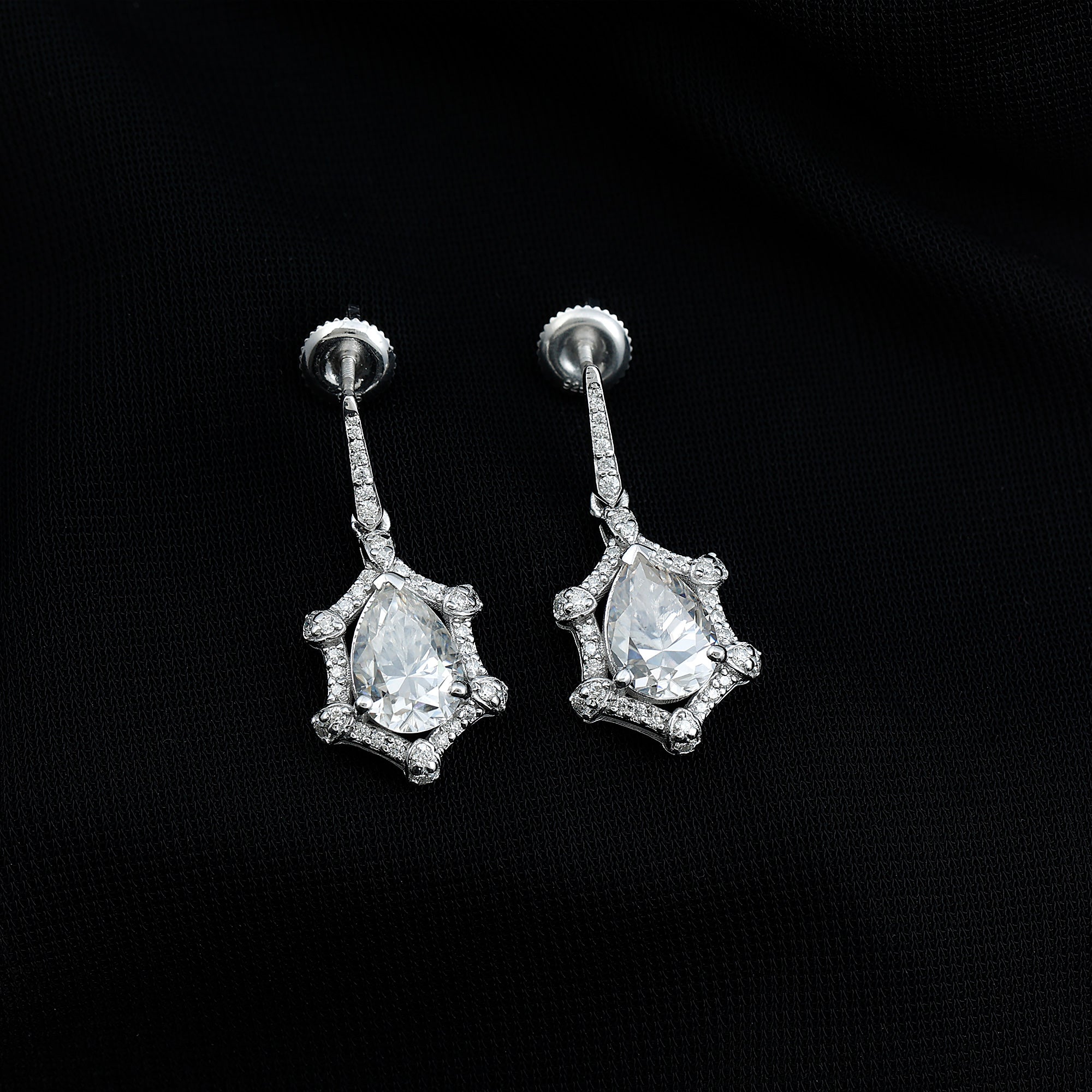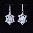 Brighten up your big day with the timeless sparkle of these stunning Wedding Drop Earrings. Featuring a beautiful 7X10 MM pear shaped moissanite in the center set in prong setting, these Silver Drop Earrings are designed to capture the light and everyones attention. Surrounding the center stone is a delicate halo of shimmering round cut stones, adding a vintage style touch to the overall design. Handcrafted in 14k White Gold Plated Silver and comes with secure screw back closure that ensures they stay comfortable in place throughout all your celebrations. Perfect for brides who dream of combining old world charm with modern sparkle, these Moissanite Earrings are a classic choice to complete your special look.
