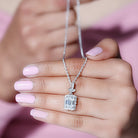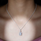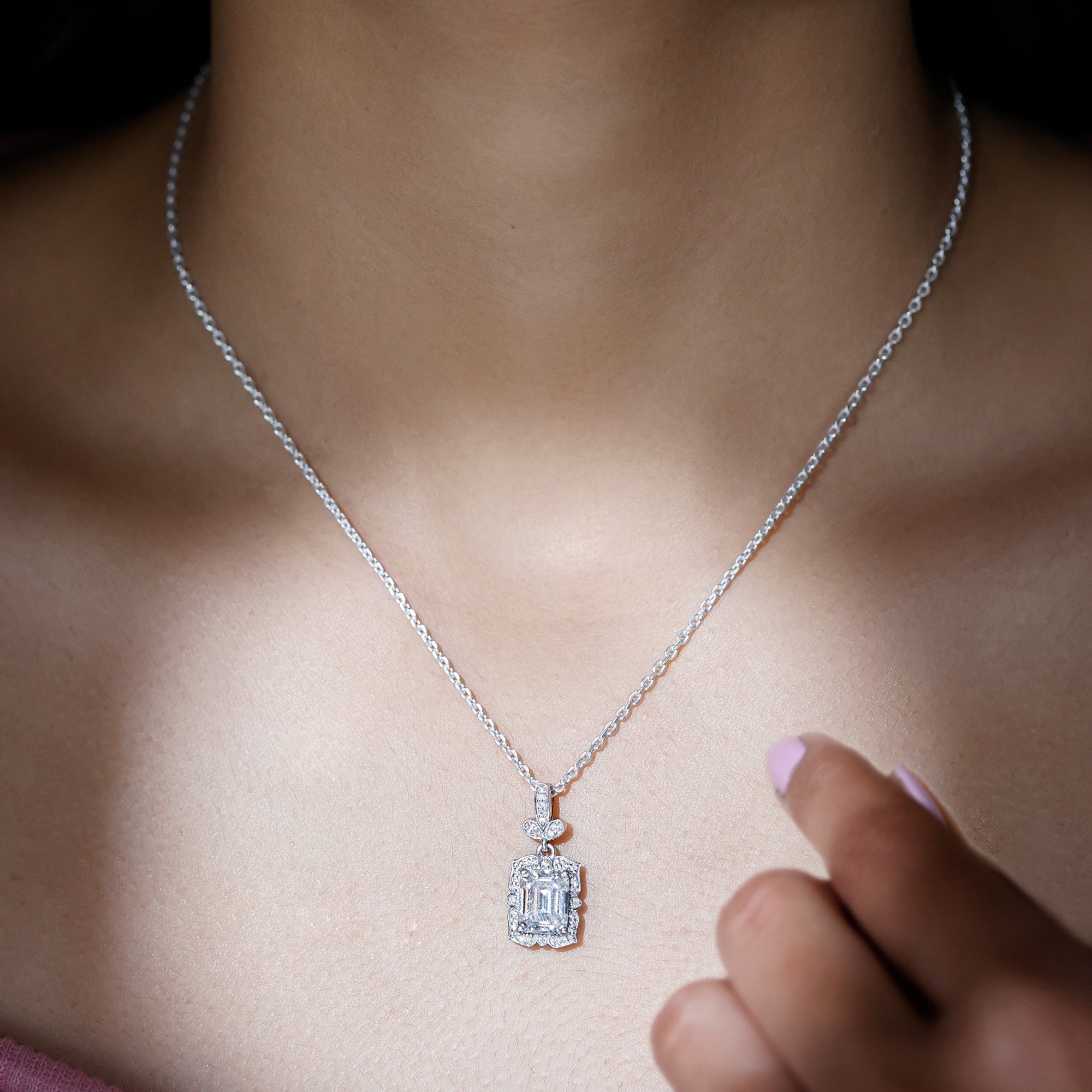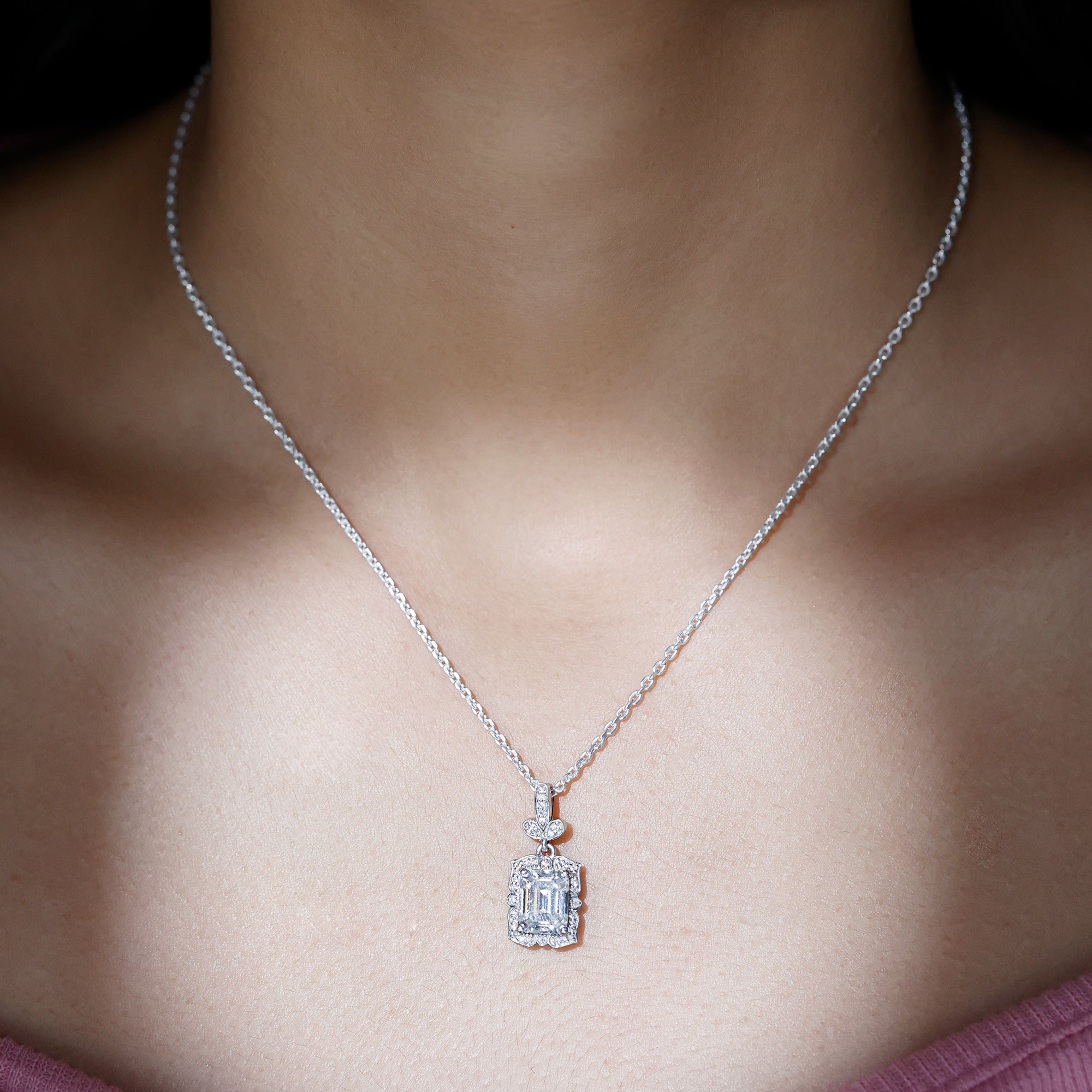 This Moissanite Pendant Necklace is the classic choice to complete your look for a special day. The pendant is crafted with 14K White Gold Plated Silver and features a 7X9 MM Emerald Cut Moissanite securely placed in Prong Setting and surrounded with smaller Moissanite. This large Pendant dangles with a stone-studded standard bail and hangs from a sturdy cable chain. This Art Deco Necklace is a thoughtful gift for your beloved on a special occasion. This Vintage Pendant Necklace will be delivered to you in a signature velvet pouch with a certificate of authenticity.