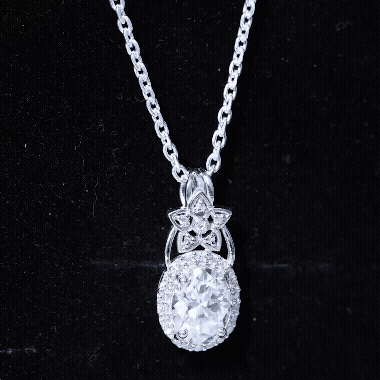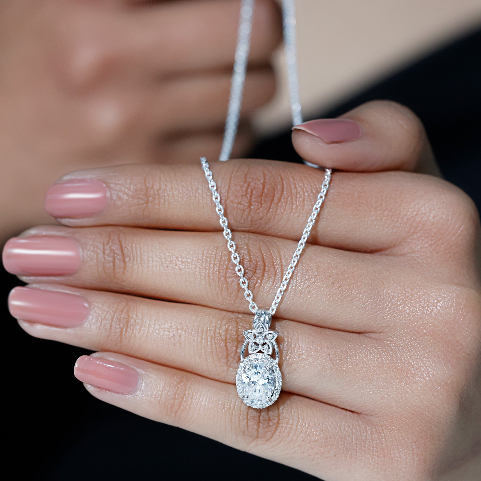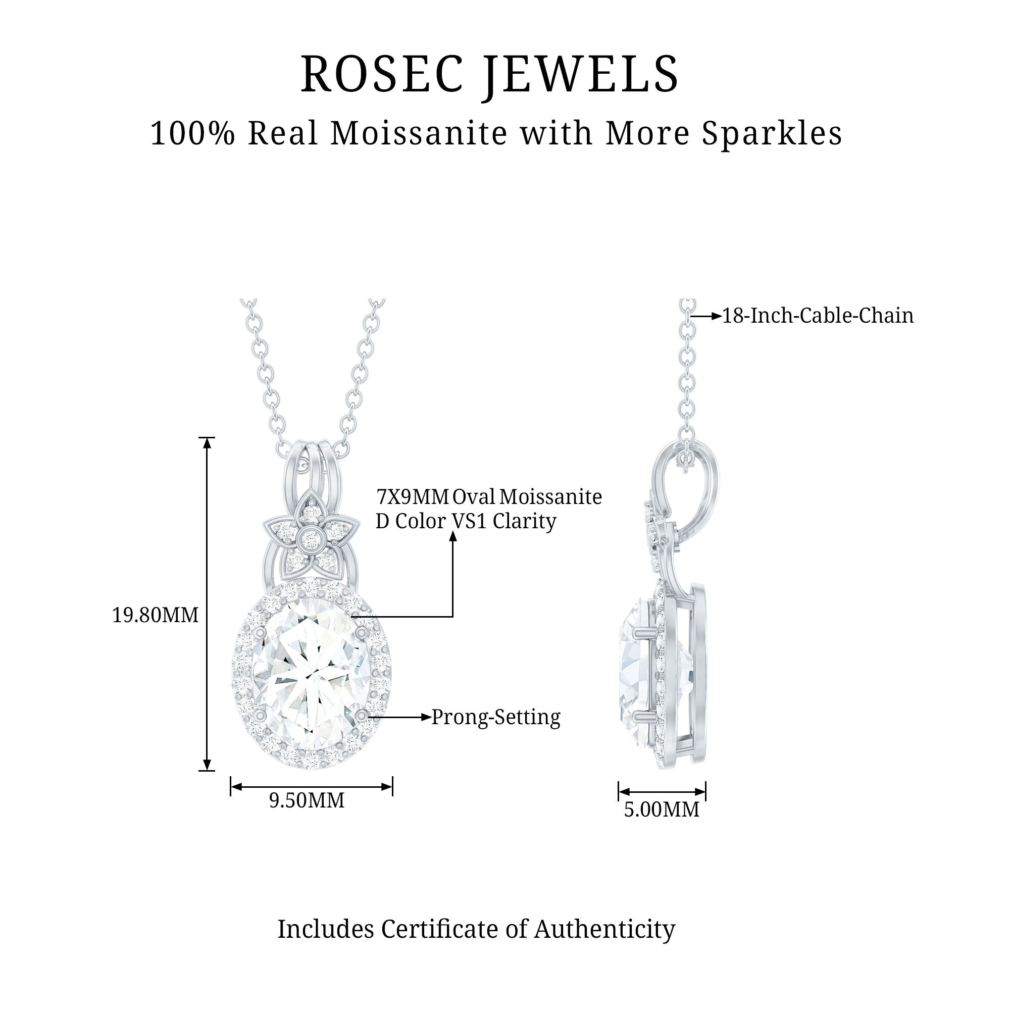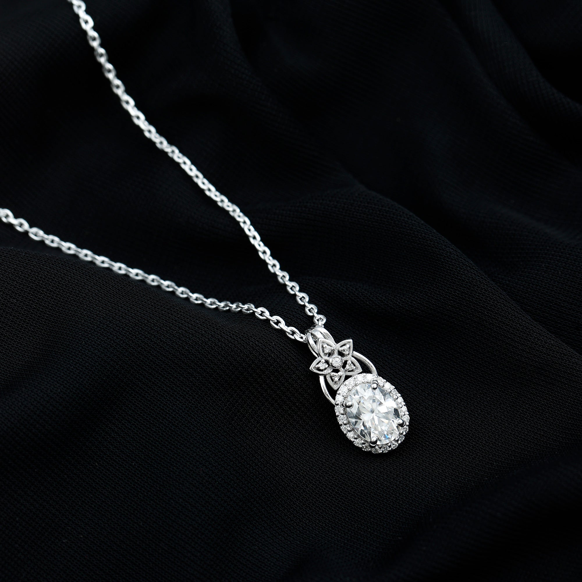 This Vintage inspired Moissanite Pendant is all you want to complete your look for a special day. The Pendant features a 7X9 MM Oval Shape Moissanite securely placed in prong setting and encircled by a smaller halo of Moissanite stones and accentuated with a stone studded floral motif. This Vintage Pendant Necklace beholds the shine of D-VS1 Quality Moissanite and dangles in a silver cable chain, which can be adjusted as per style. This Oval Necklace can be a perfect choice of gift for your beloved on their special day. The pendant will be shipped to you in premium packaging.