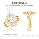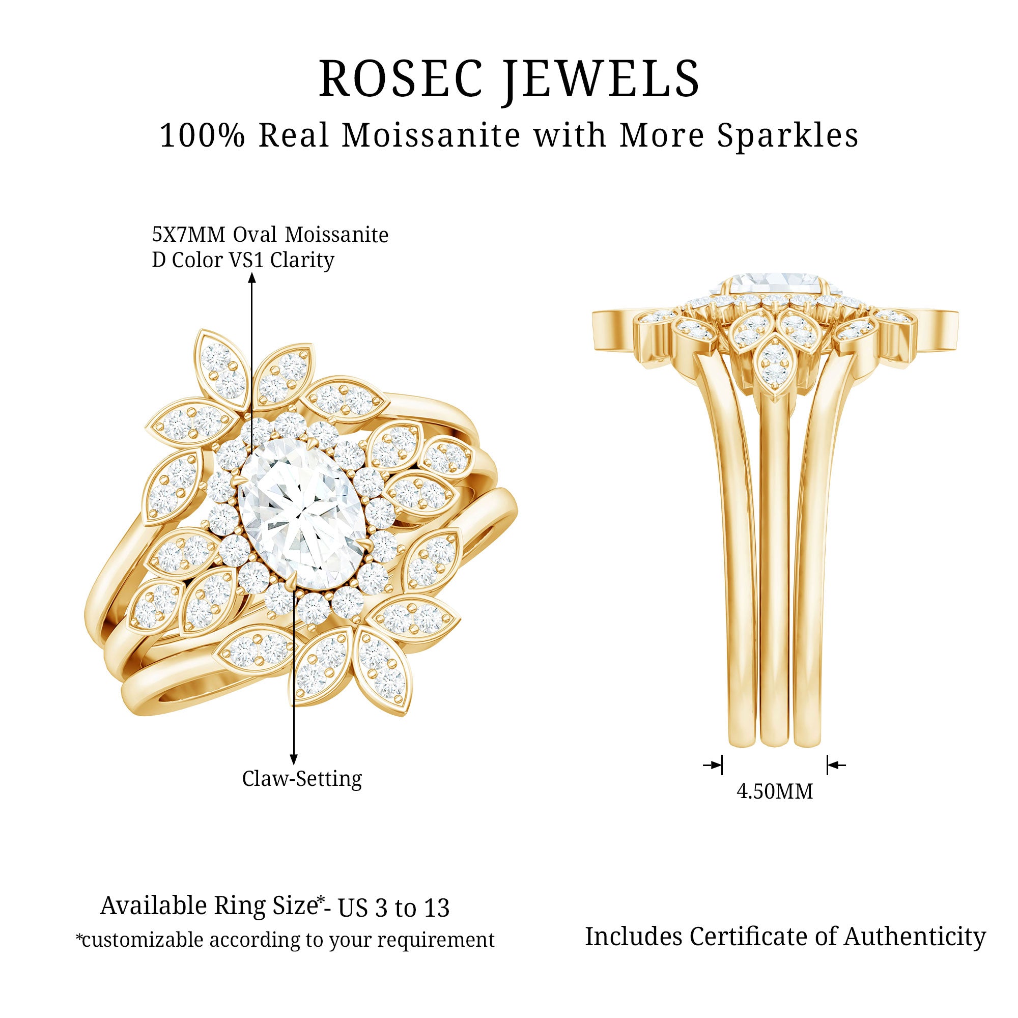 Infuse your love story with timeless elegance and floral inspired beauty through this exquisite Moissanite Wedding Ring Set. Designed for the bride who adores vintage romance with a hint of whimsy, this 3 Piece Bridal Set radiates charm and sophistication. At its heart lies a 5X7 MM oval cut moissanite, secured in a graceful claw setting and encircled by a sparkling halo. Leaf-like side stone detailing enhances the organic, nature-inspired design, blending flower power aesthetics with heirloom appeal. The engagement ring is flanked by two matching curved ring guards, each adorned with shimmering round moissanite stones over delicate marquise motifs. These bands wrap the center ring with seamless brilliance, creating a cohesive and dazzling look that is hard to miss. Whether worn all together for a bold statement or individually for a timeless vibe, this versatile Vintage Bridal Ring Set offers endless styling possibilities. Handcrafted with precision, this Oval Wedding Set pairs romantic design with modern craftsmanship. Elegant, radiant, and full of meaning, this floral bridal ring set is the perfect way to celebrate your unique love story. From YES to I DO and every moment in between, let this set be a lasting symbol of nature, love, and beauty blooming together forever.