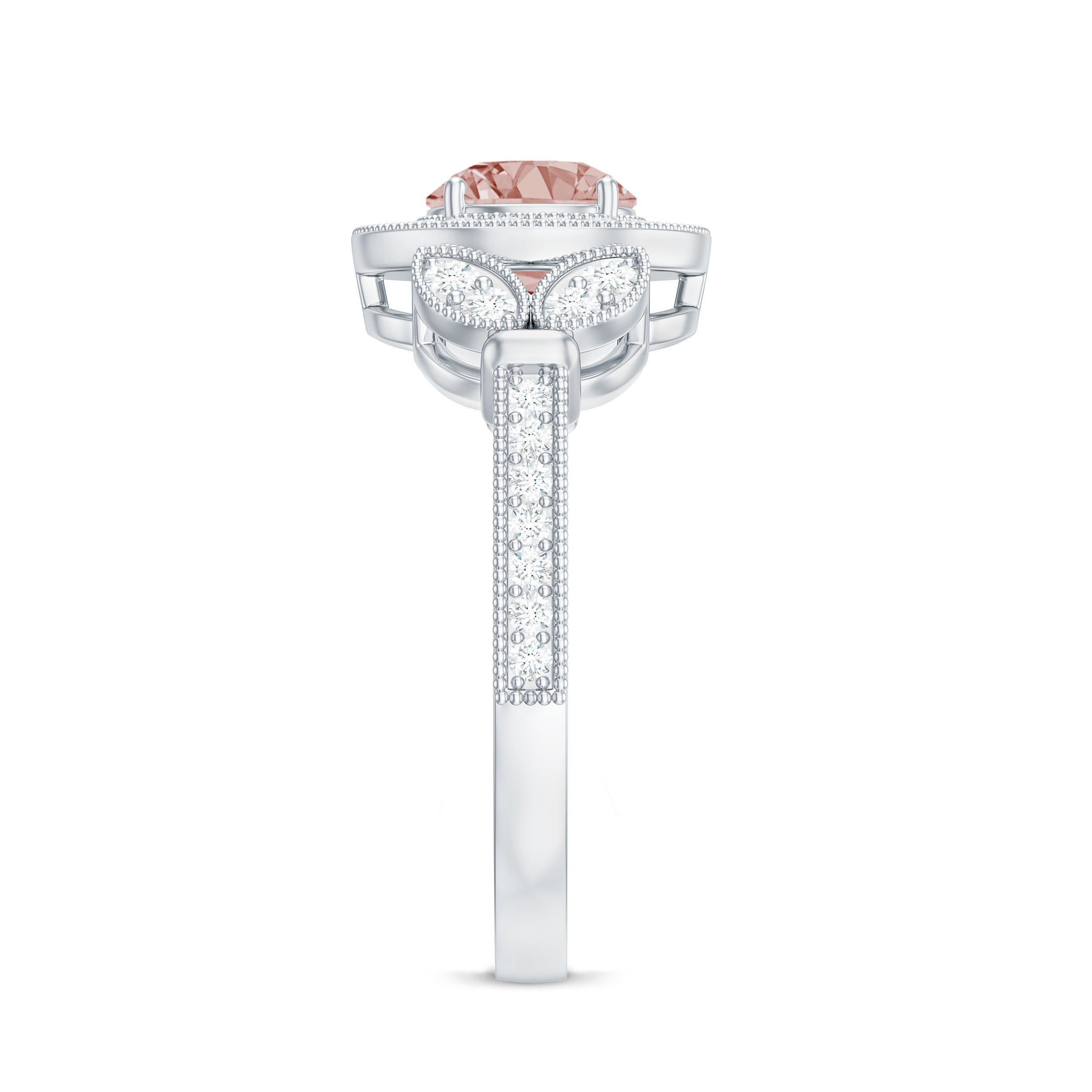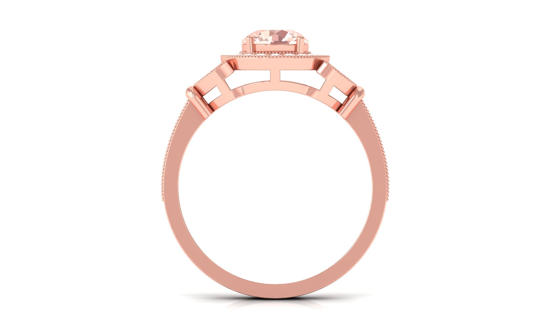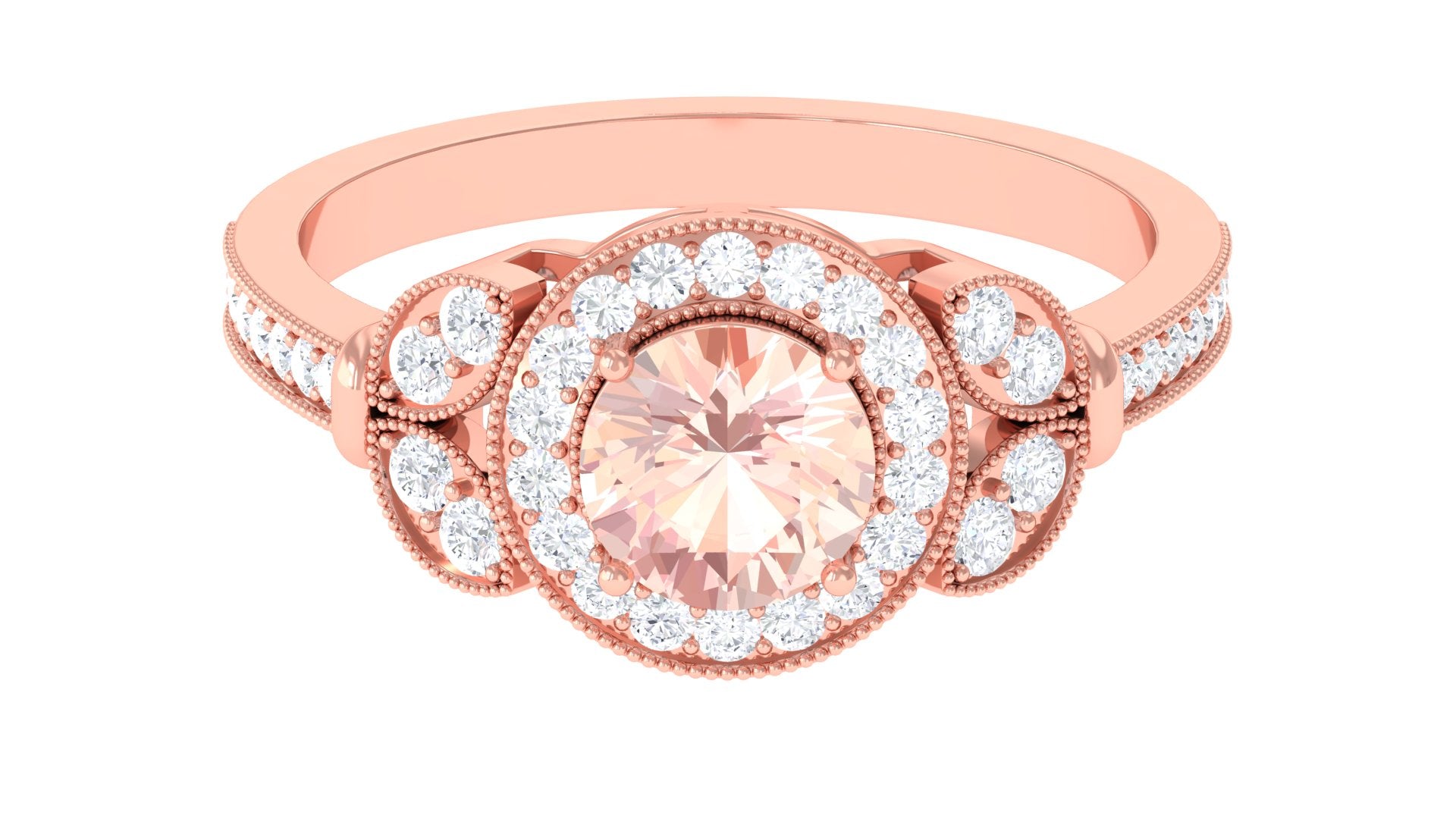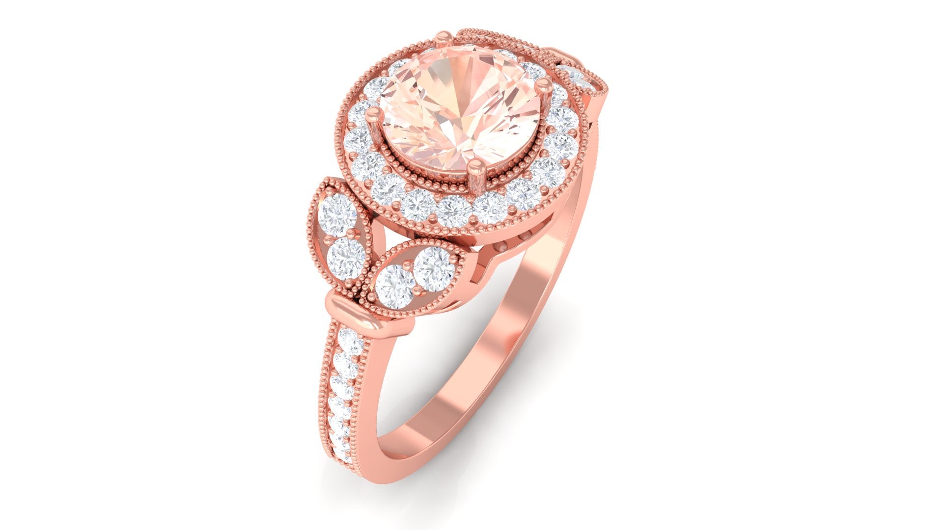 The fire and brilliance of Morganite Engagement Ring will forever shines through in every way, Our Vintage Engagement Ring gives you extra ordinary feel on your big day. This Morganite Vintage Engagement Ring is embellished with Round Shape Morganite in Prong Setting with Diamond Accent and Gold Beaded Details.
