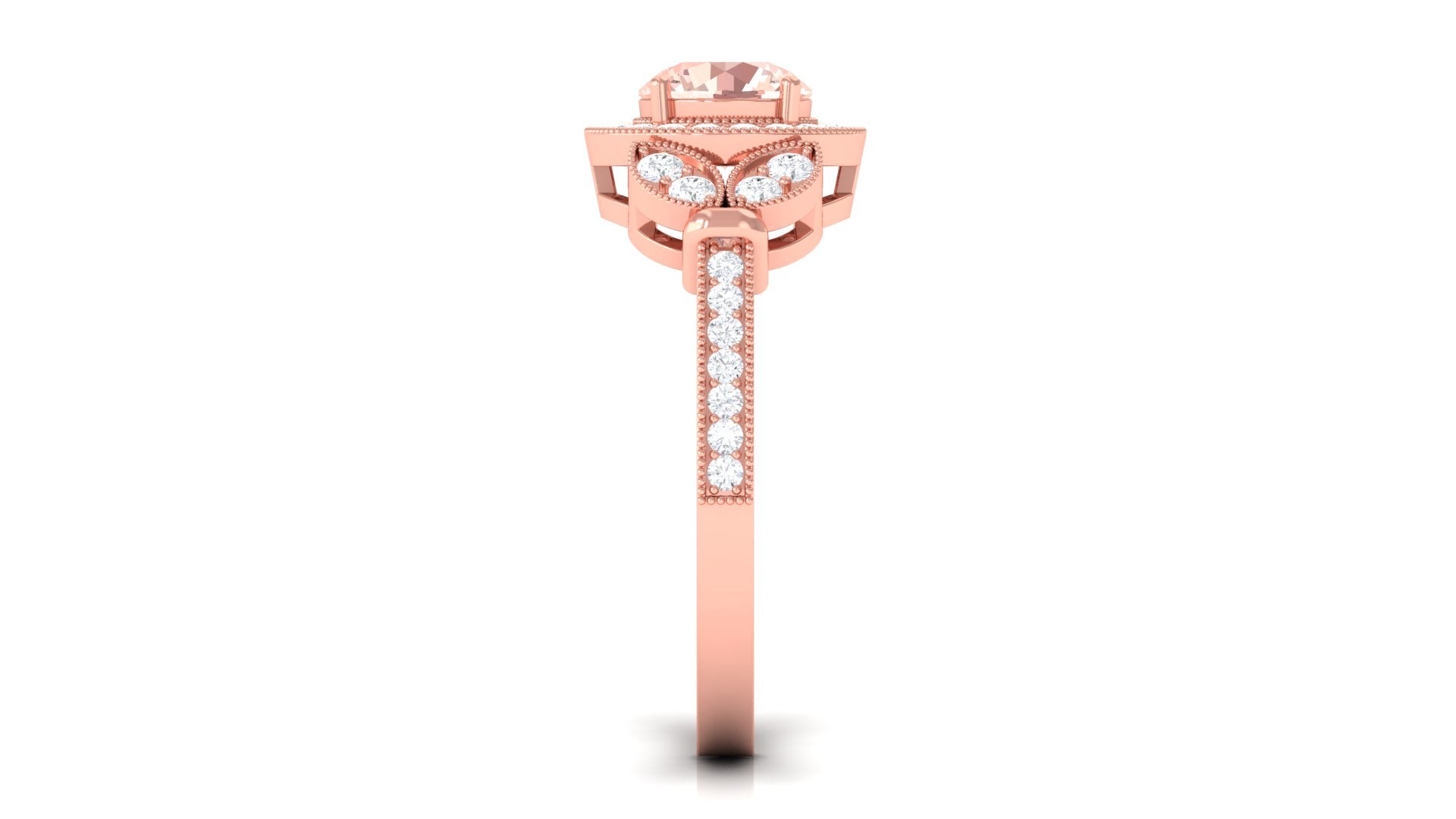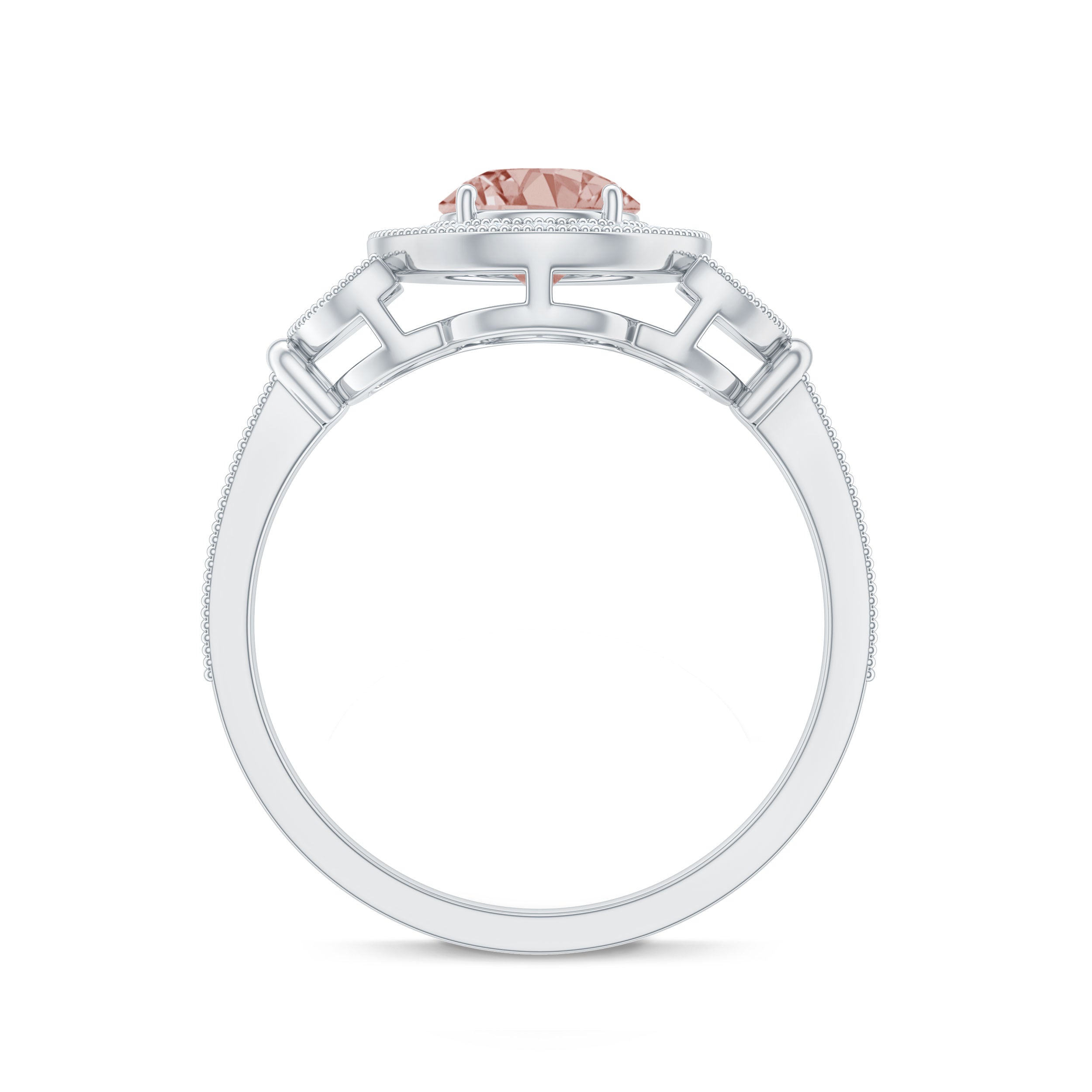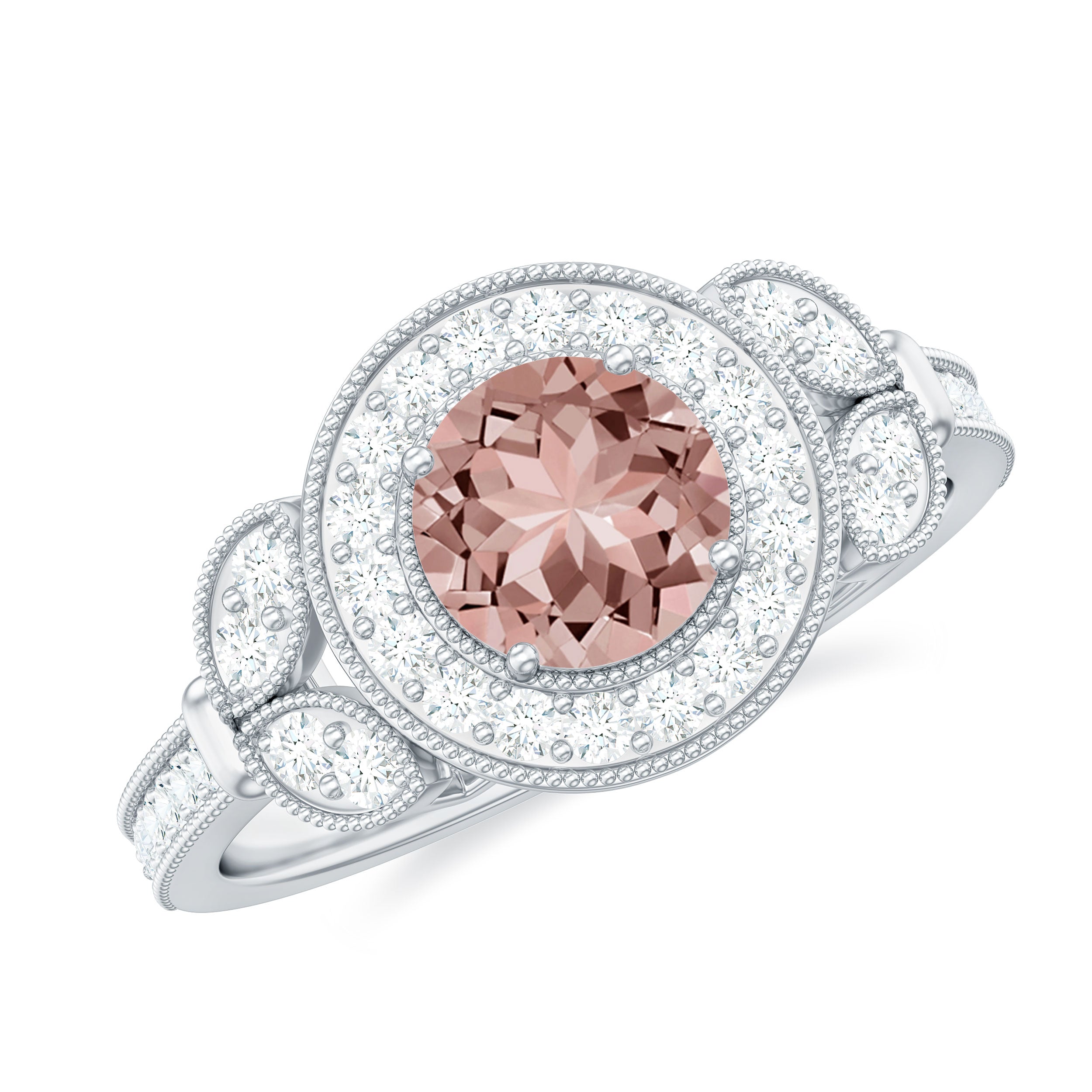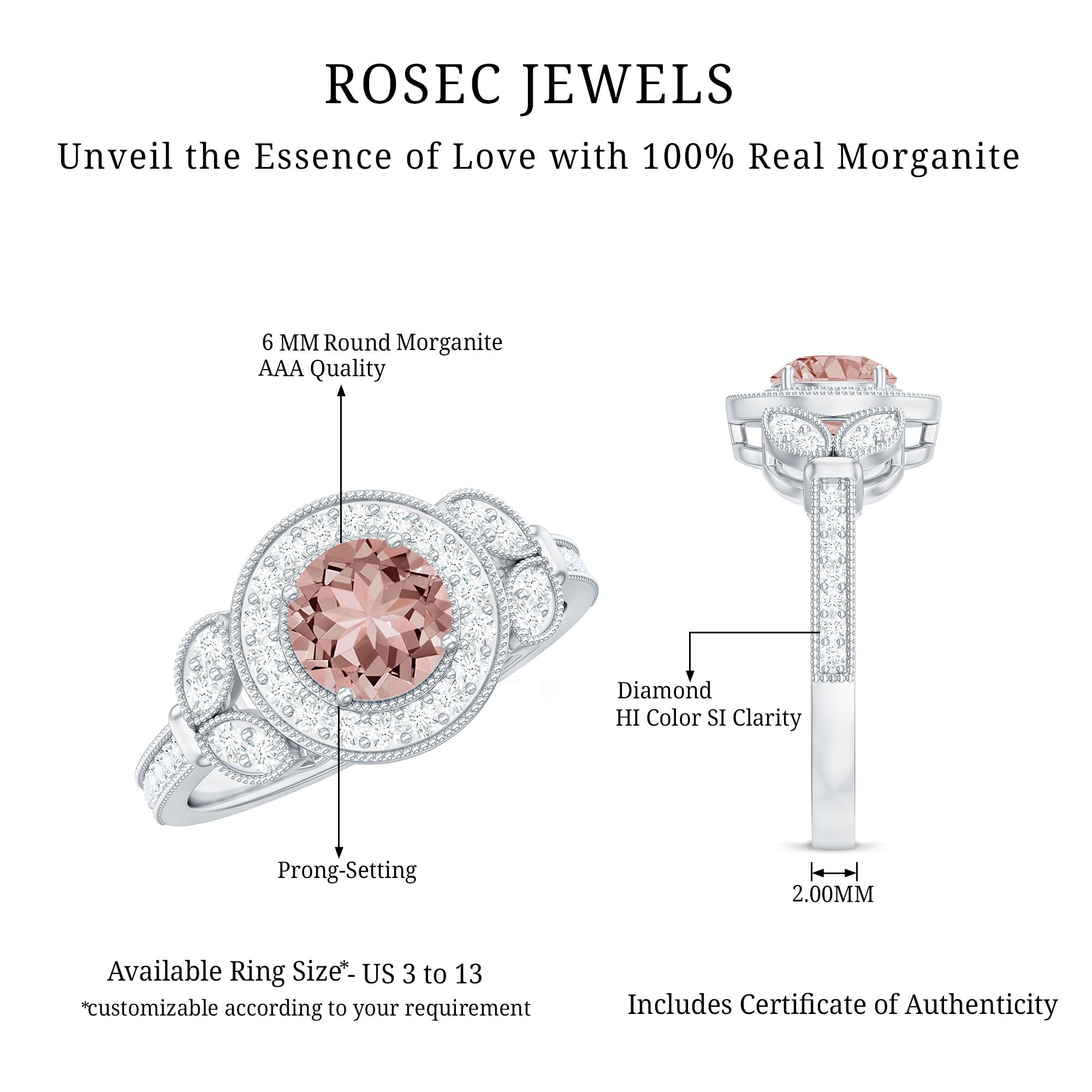 The fire and brilliance of Morganite Engagement Ring will forever shines through in every way, Our Vintage Engagement Ring gives you extra ordinary feel on your big day. This Morganite Vintage Engagement Ring is embellished with Round Shape Morganite in Prong Setting with Diamond Accent and Gold Beaded Details.