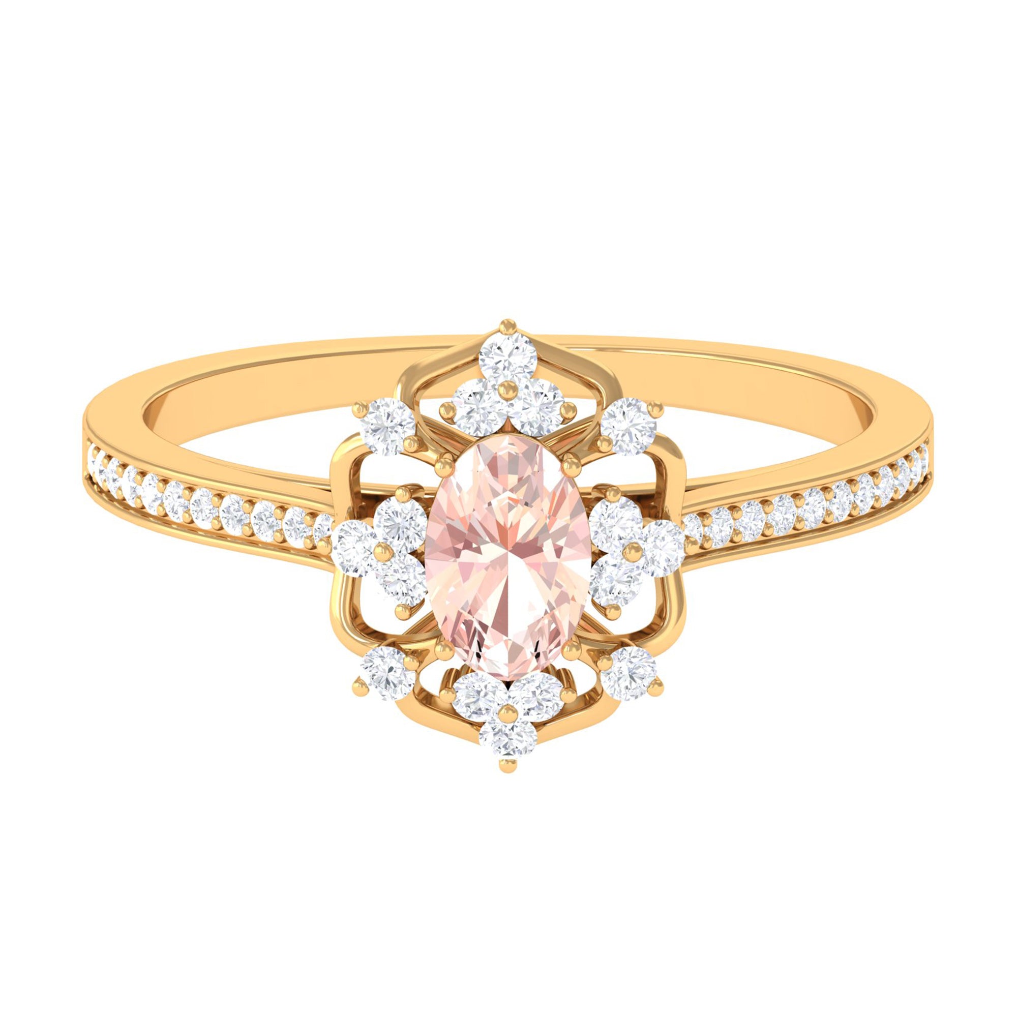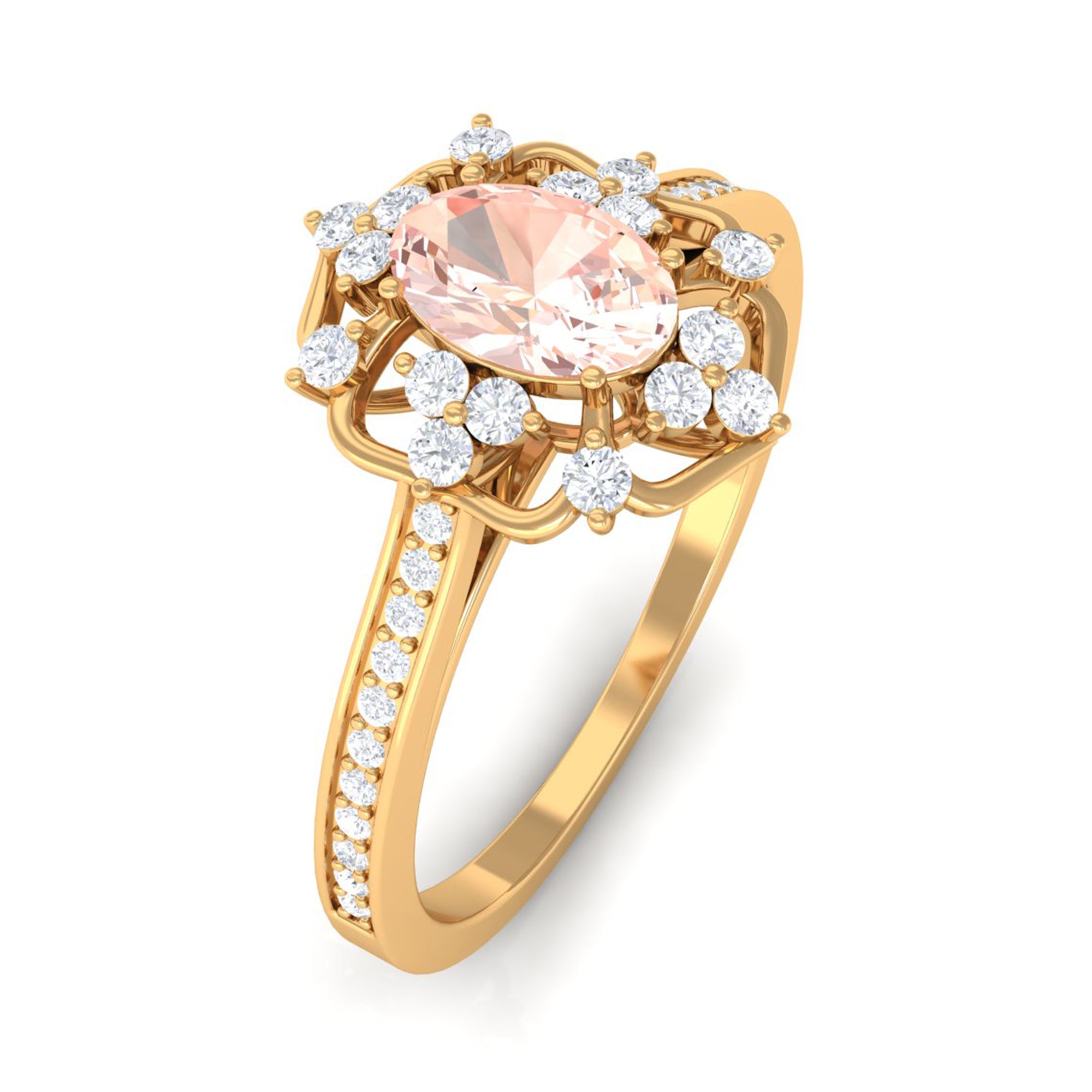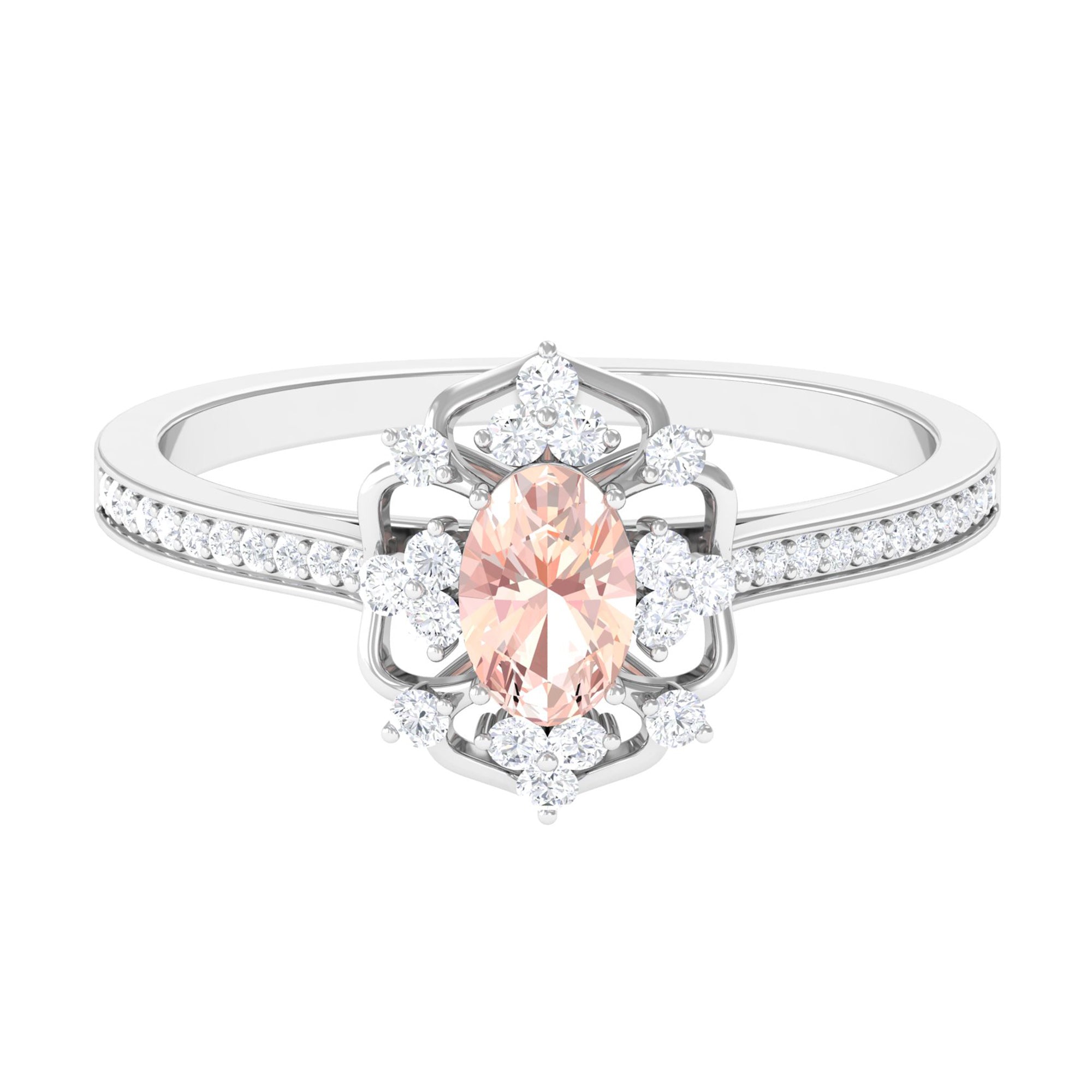 A center oval morganite, round Diamond, and intricate motifs are put together to create this engagement ring that gives off a vintage inspired elegance. The gemstones are brilliantly held in prongs, that beautify the overall design of the ring. The shank is studded with pave set round Diamond for a touch of extravagance. The blush pink hue of morganite makes it a delightful sight to hold on to for the rest of your life.