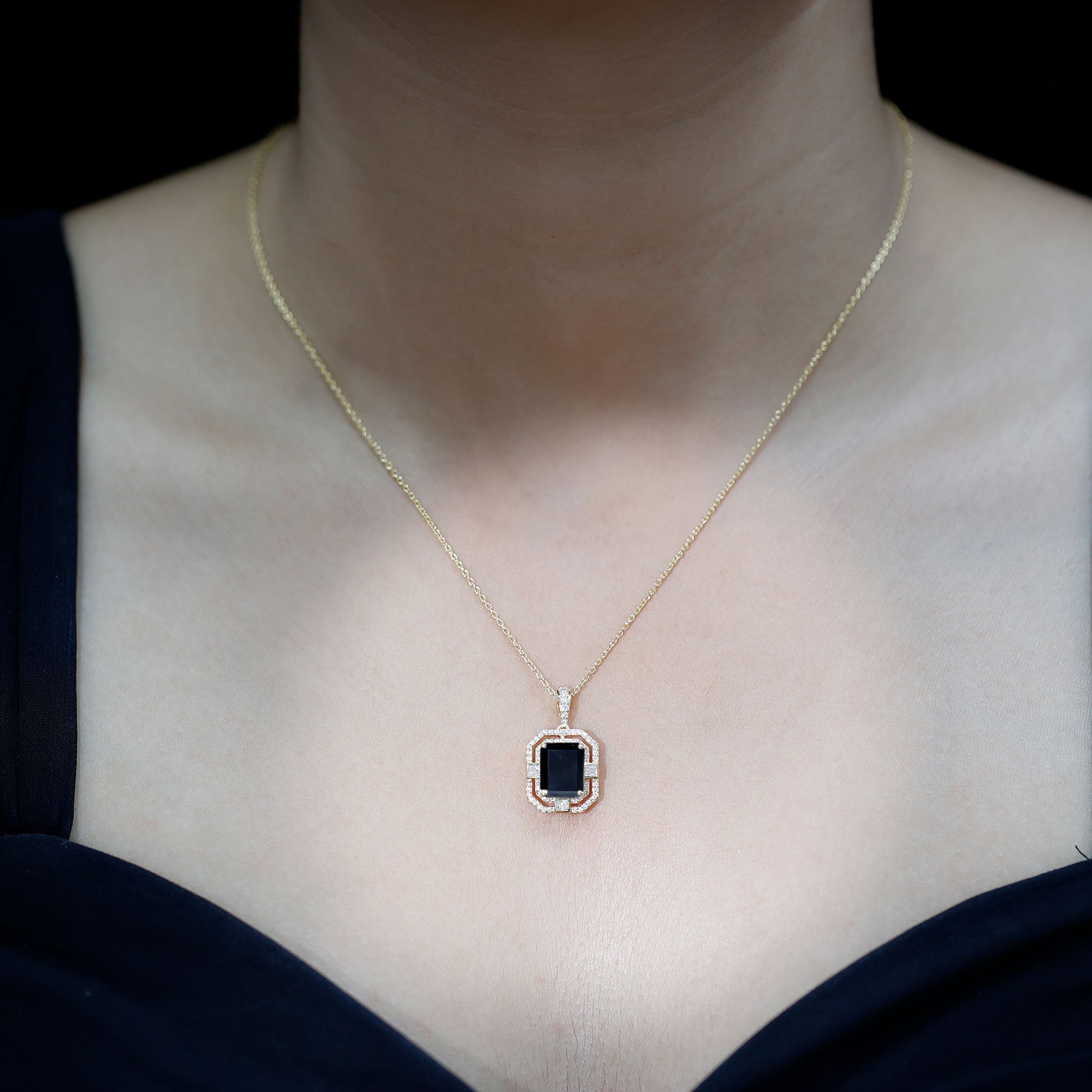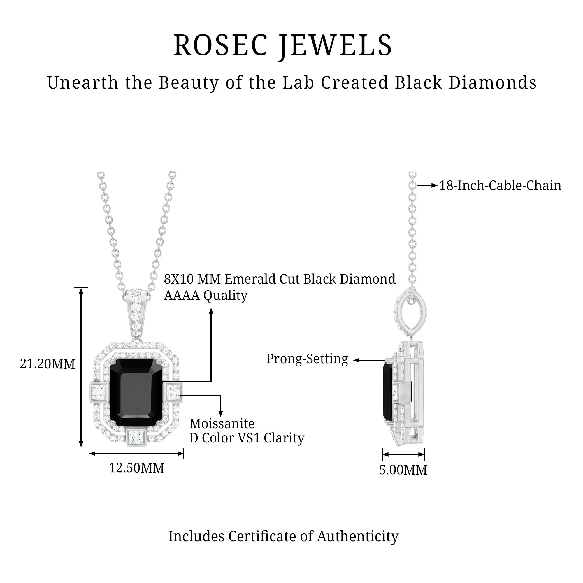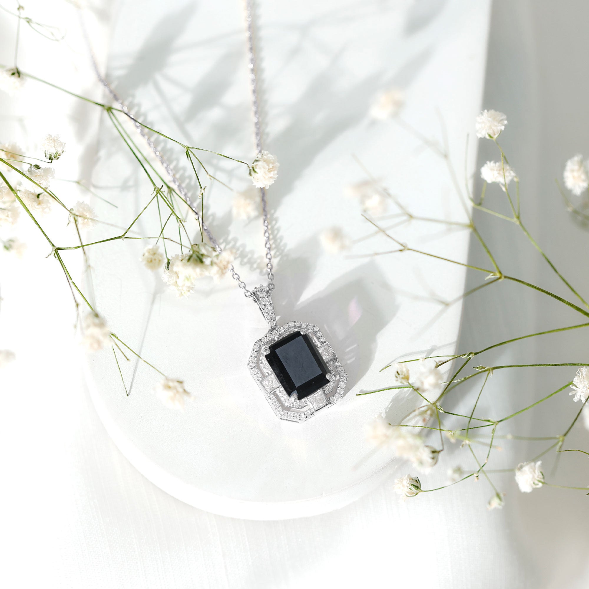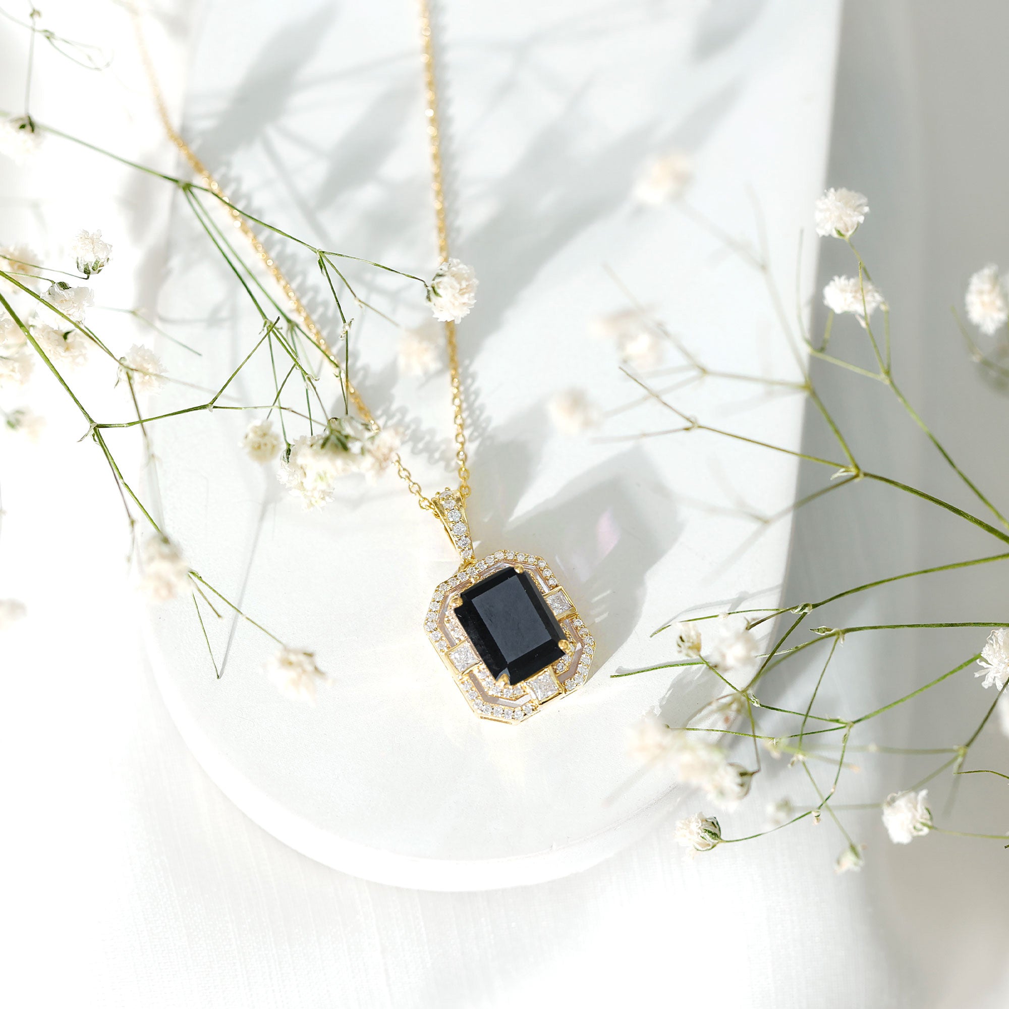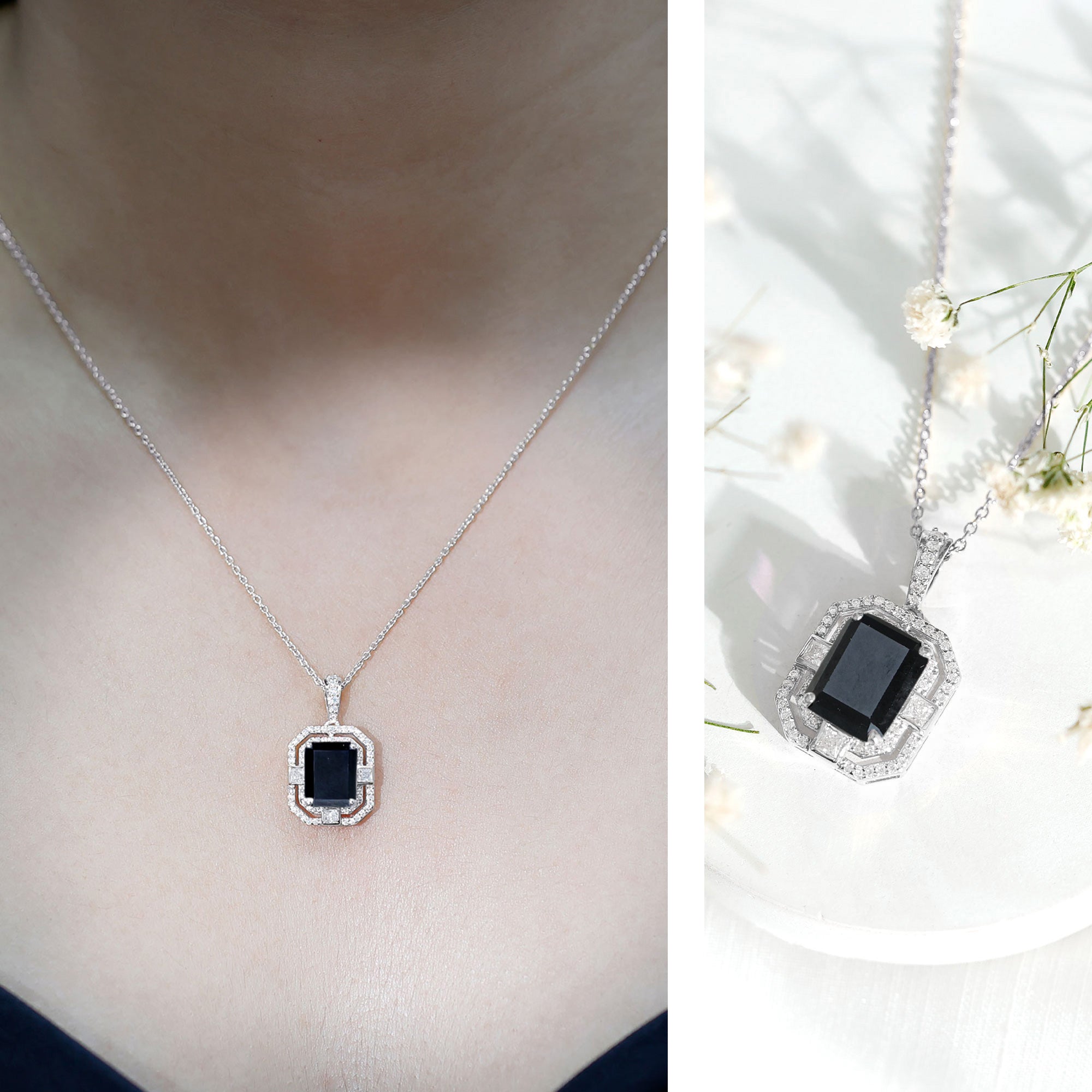 Upgrade your elegance with the enchanting Vintage Inspired Halo Pendant. The exquisite Octagon Cut Created Black Diamond, encircled by sparkling Moissanite stones, exudes vintage charm. Set securely in a Prong Setting, this necklace adds sophistication and allure to any outfit.