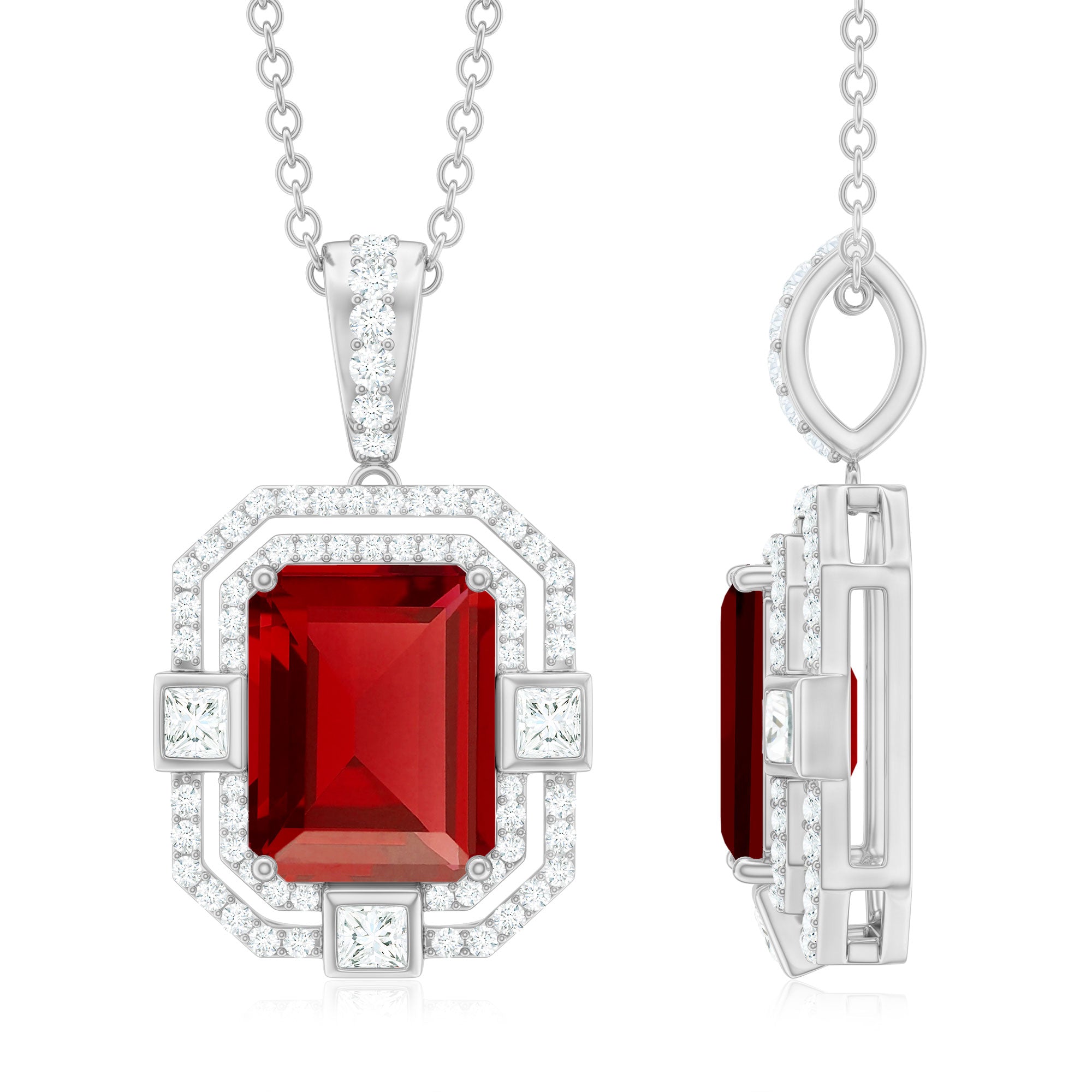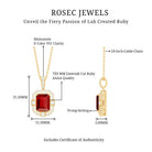 Enhance the allure of your neckline with the captivating Created Ruby Pendant. The pendant showcases a stunning Octagon Cut Created Ruby held in place by a secure Prong Setting, adorned with shimmering Round and Princess Cut Moissanite stones that evoke a vintage-inspired charm. Elevate your beauty with this exquisite Pendant Necklace, adding a touch of sophistication and elegance to any outfit.