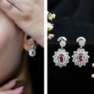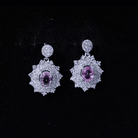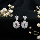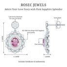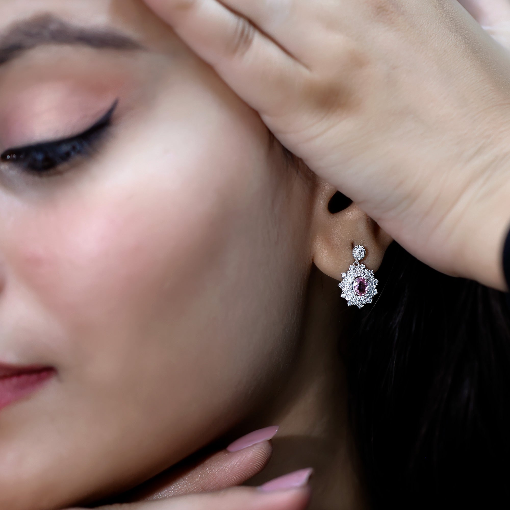 Designed to celebrate timeless elegance with a bold twist, these Vintage Wedding Earrings are perfect for the bride who cherishes old world charm but embraces her own style. Inspired by vintage patterns, this pair makes a stunning statement for weddings, anniversaries, or grand celebrations. Crafted in 14k white gold plated silver, these Bridal Earrings for Wedding feature a 4X5 MM oval cut natural pink sapphire at the center, held securely in claw setting that lets the stone shine at every angle. Surrounding the center stone is a sparkling halo of round lab grown diamonds, each precisely placed to reflect the light beautifully and create a radiant finish. What truly sets these Sapphire and Diamond Earrings apart is the intricate petal like halo design, which gives the earrings a vintage inspired look. Every petal is detailed with a combination of round brilliant lab diamonds and fine beaded accents, adding depth and an antique feel. At the top of the Statement Earrings, a smaller diamond studded round shape connects to the drop. The screw back closure offers both security and comfort, allowing you to wear these earrings all day and night without worry. Add them to your collection today and make every moment sparkle with elegance.