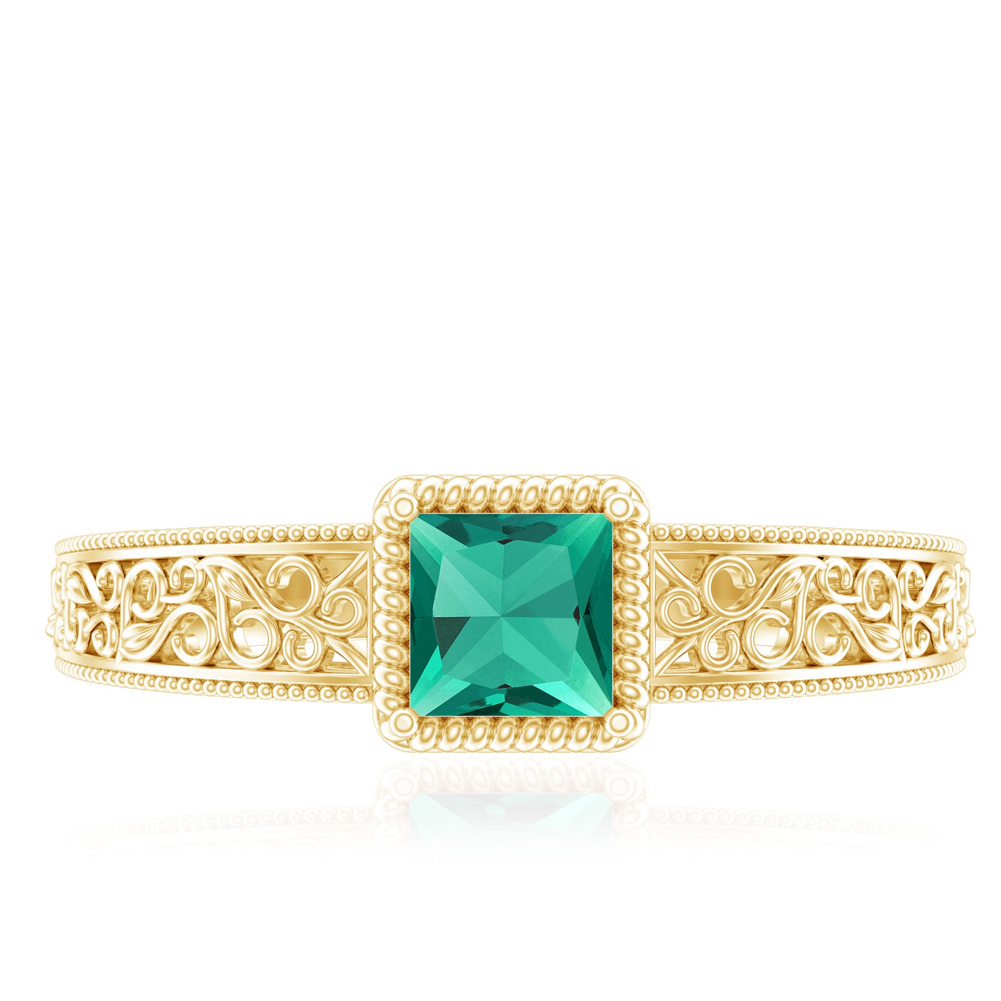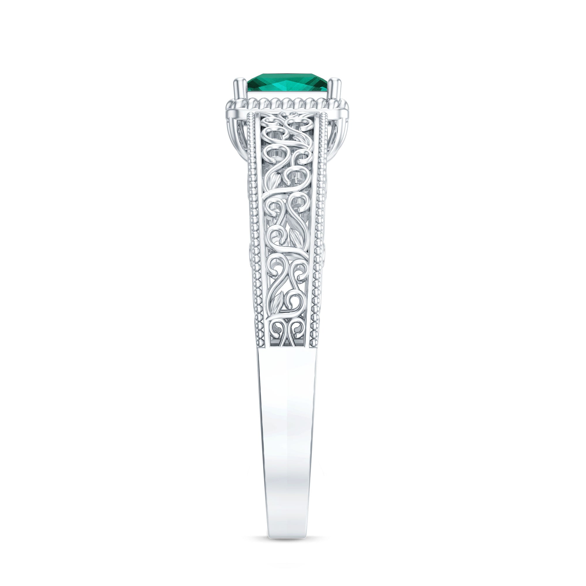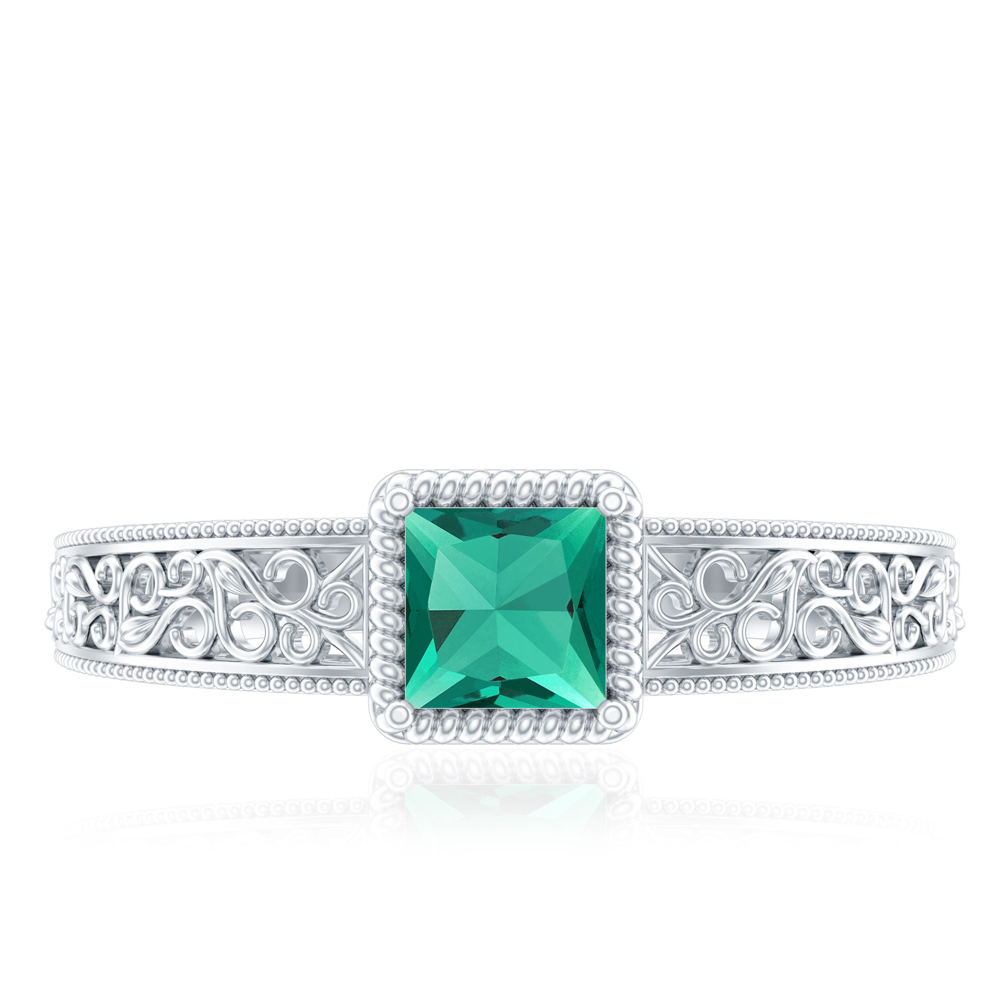 Vintage Inspired Princess Cut Lab Grown Emerald Promise Ring with Filigree Details