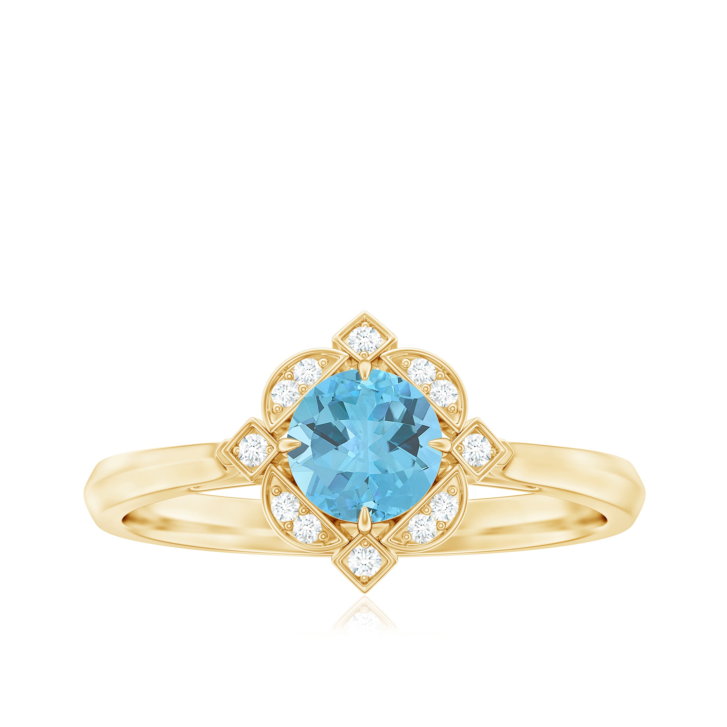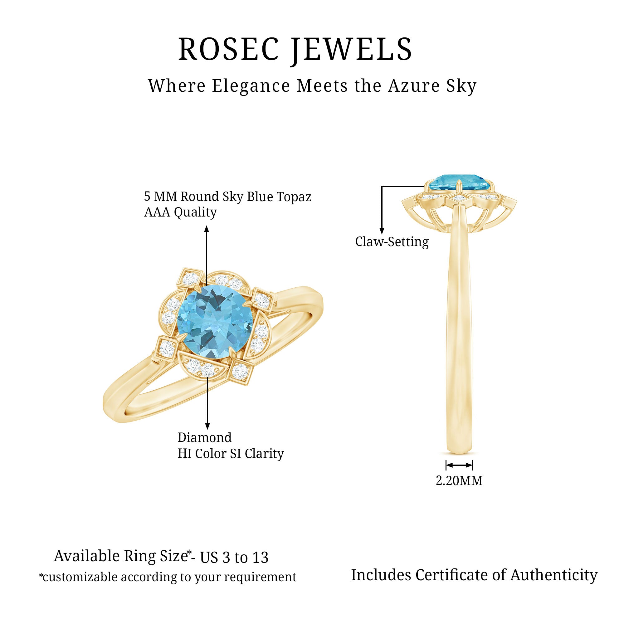 Make a timeless statement with this Sky Blue Topaz Classic Vintage Ring. Featuring a Round Shape Sky Blue Topaz surrounded by a sparkling halo of Diamond stones, this ring is perfect for anniversaries or any other special occasion. Embrace your inner queen and add this beautiful piece to your jewelry collection.