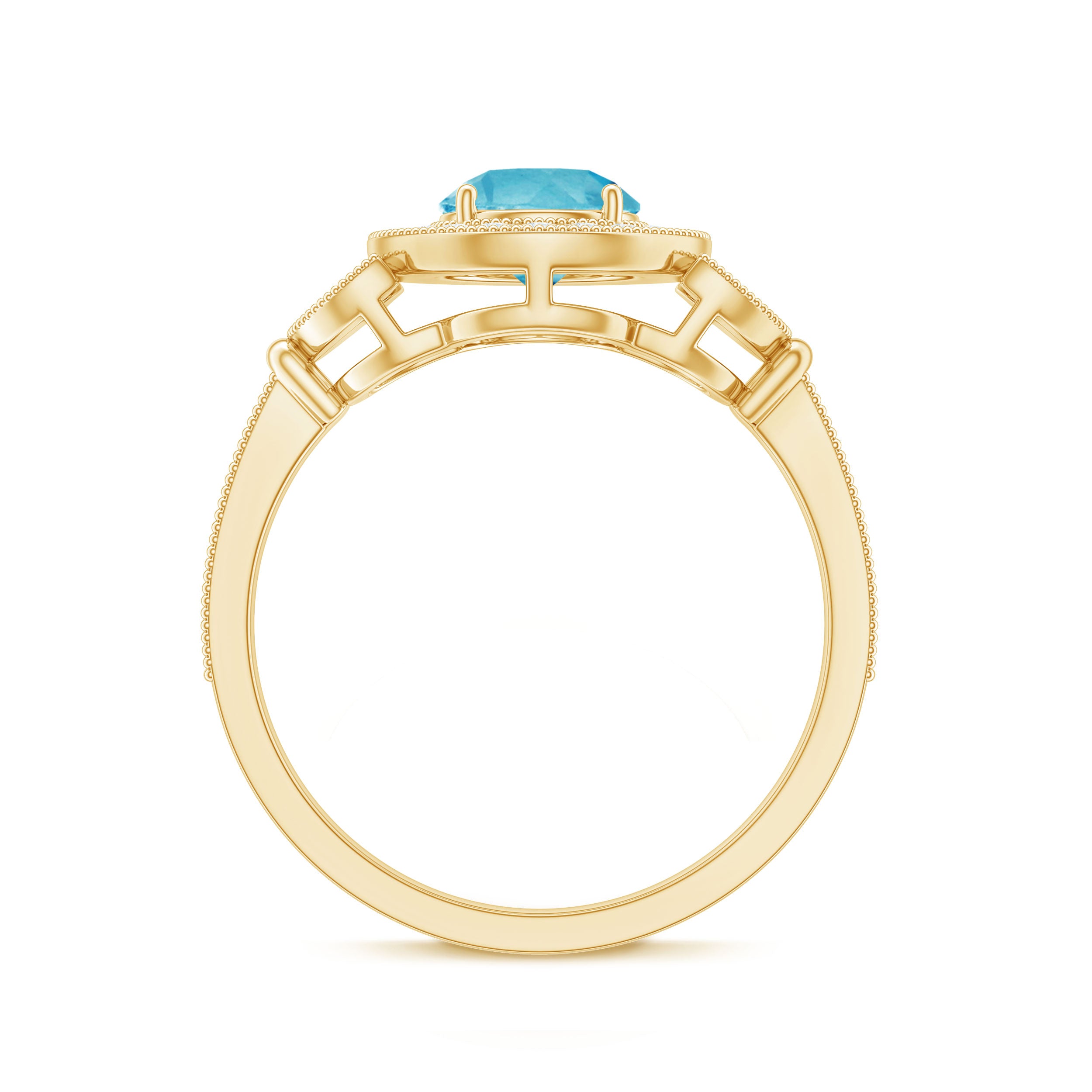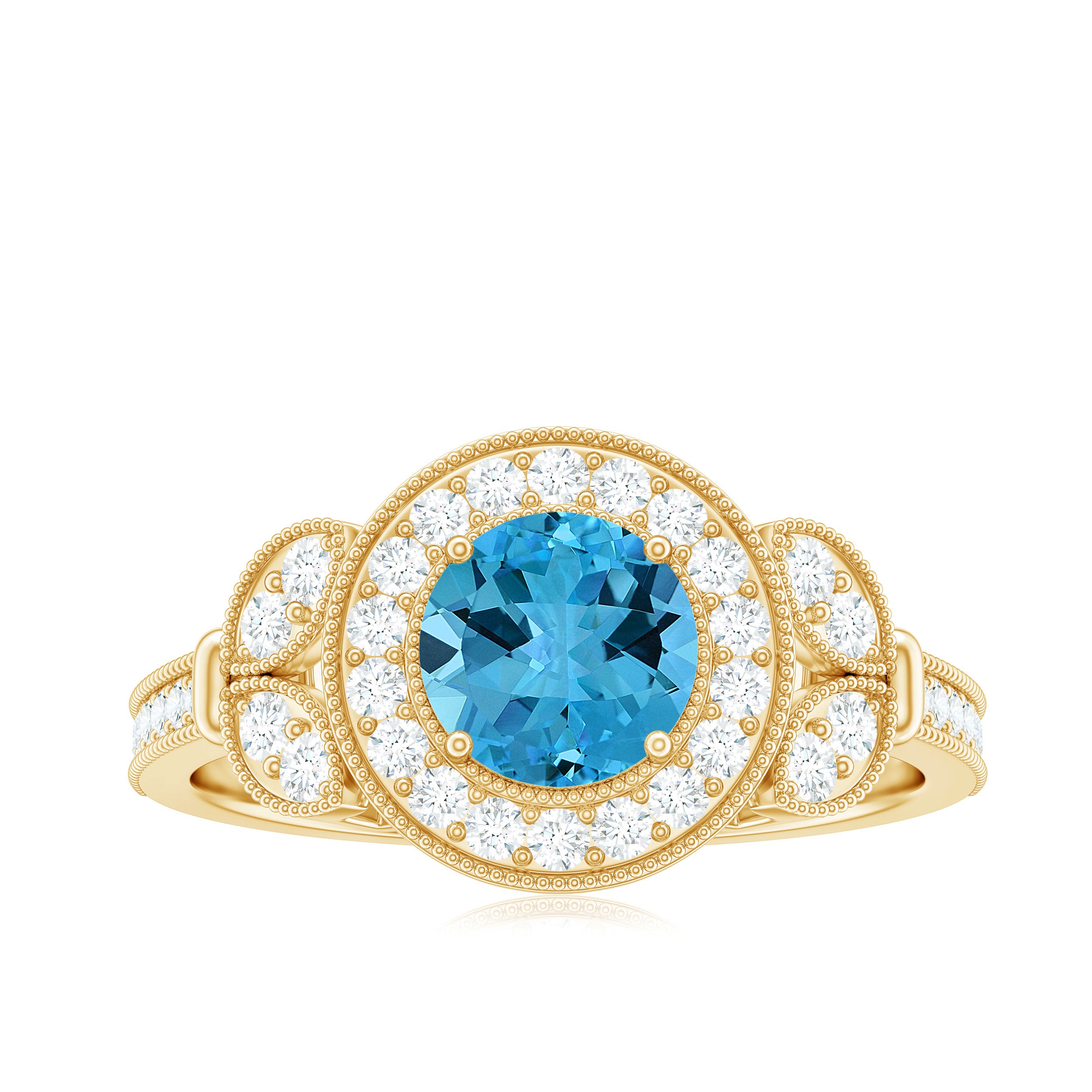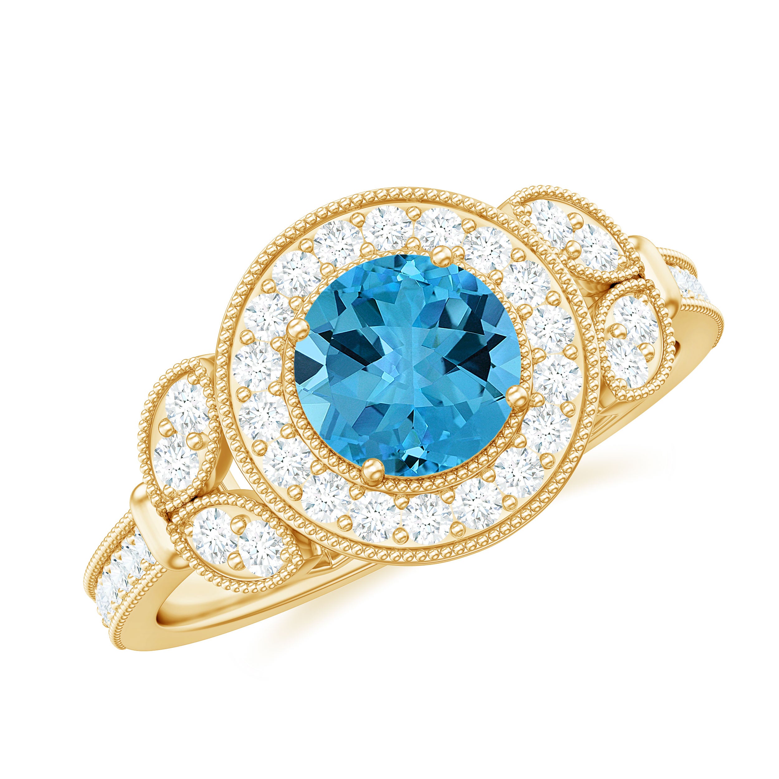 Elevate your style with this elegant yet understated Classic Engagement Ring, which adds a touch of sophistication to any ensemble. The centerpiece of this exquisite vintage style ring is a Round Shape Swiss Blue Topaz, complemented by Diamond Accents and intricate Beaded Detailing. The Swiss Blue Topaz ring is meticulously crafted from high-quality Gold, lending a luxurious and refined aesthetic.