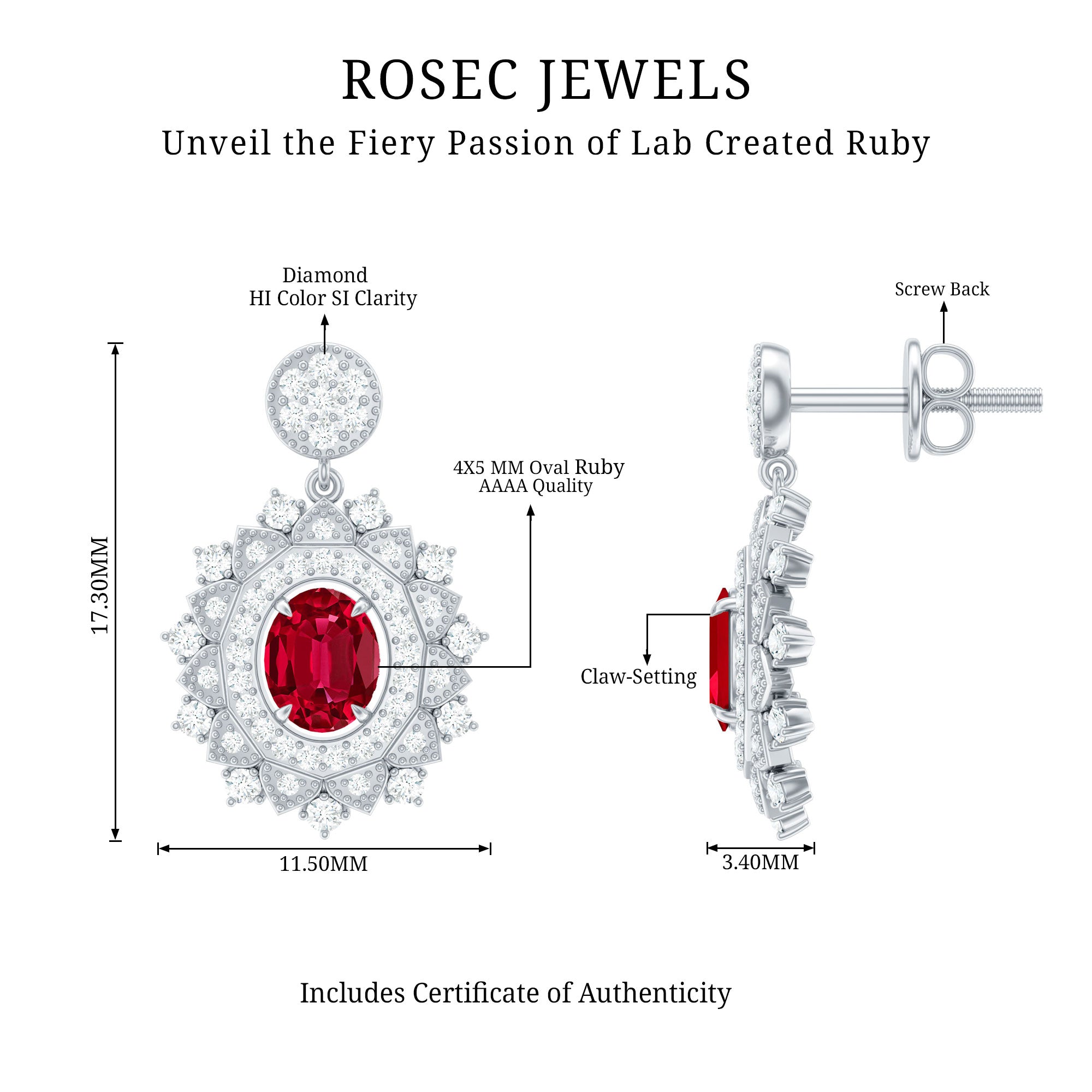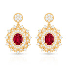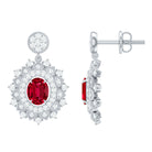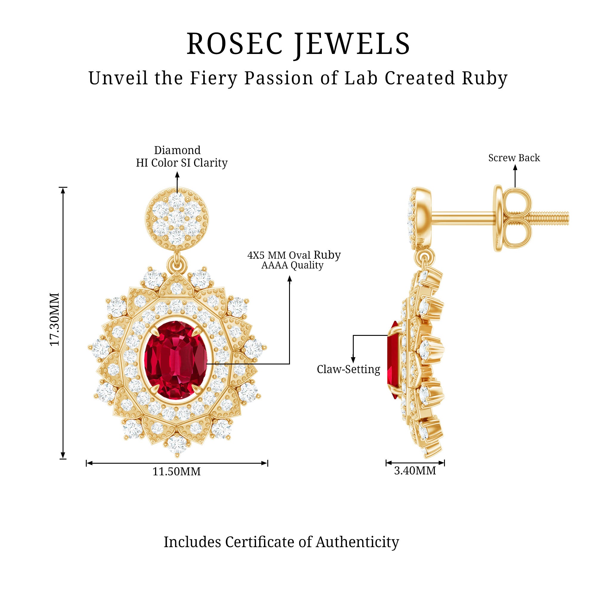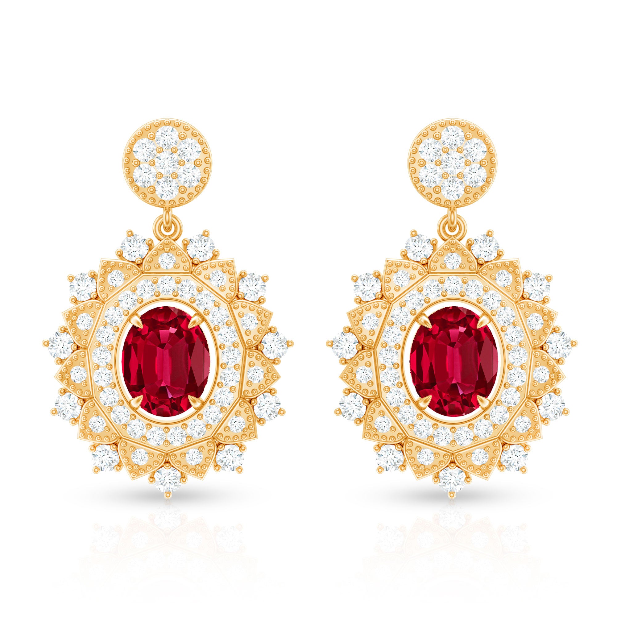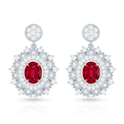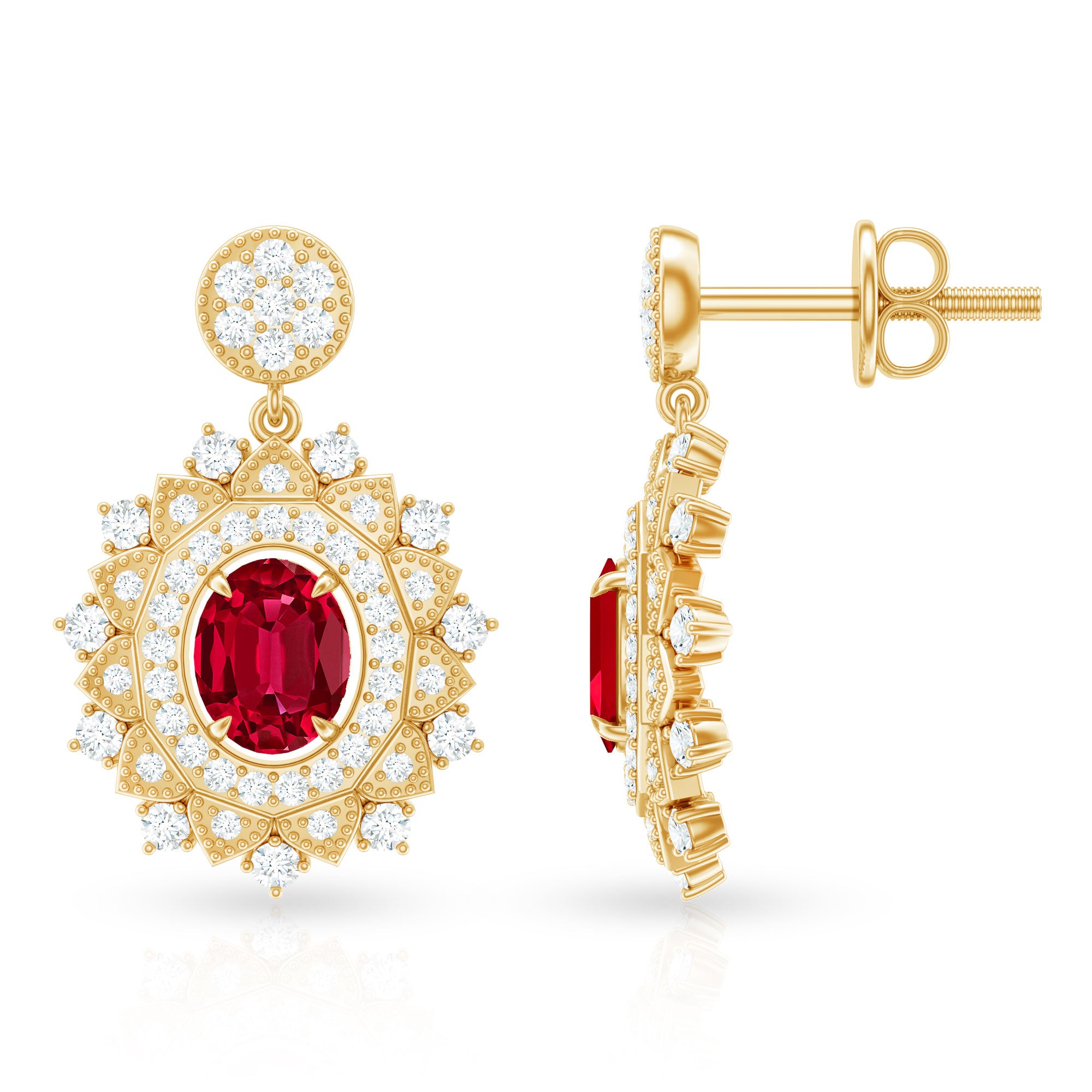 Elegance from another era meets modern sophistication in these Vintage Wedding Earrings, created for the bride who loves timeless beauty with a personal touch. The design features a 4X5 MM oval cut lab created ruby set securely in claw setting. The ruby’s rich color symbolizes love, passion, and strength, making it a perfect choice for weddings and meaningful celebrations. Surrounding the center stone is a dazzling halo of round cut diamonds, carefully arranged to catch and reflect the light beautifully. The intricate petal-like halo design gives these Ruby and Diamond Earrings their signature vintage charm, blending the elegance of classic jewelry with the freshness of modern craftsmanship. Each petal is detailed with tiny beaded accents and sparkling lab diamonds, adding texture and depth to the design while enhancing its antique-inspired feel. A smaller diamond-studded round motif sits gracefully at the top, connecting to the drop and completing the look with refined balance. The screw back closure ensures comfort and a secure fit, letting you wear these Vintage Ruby Earrings with confidence all day and night. Perfect for weddings, anniversaries, or grand occasions, these Ruby Drop Earrings bring an air of romance and sophistication to any look.