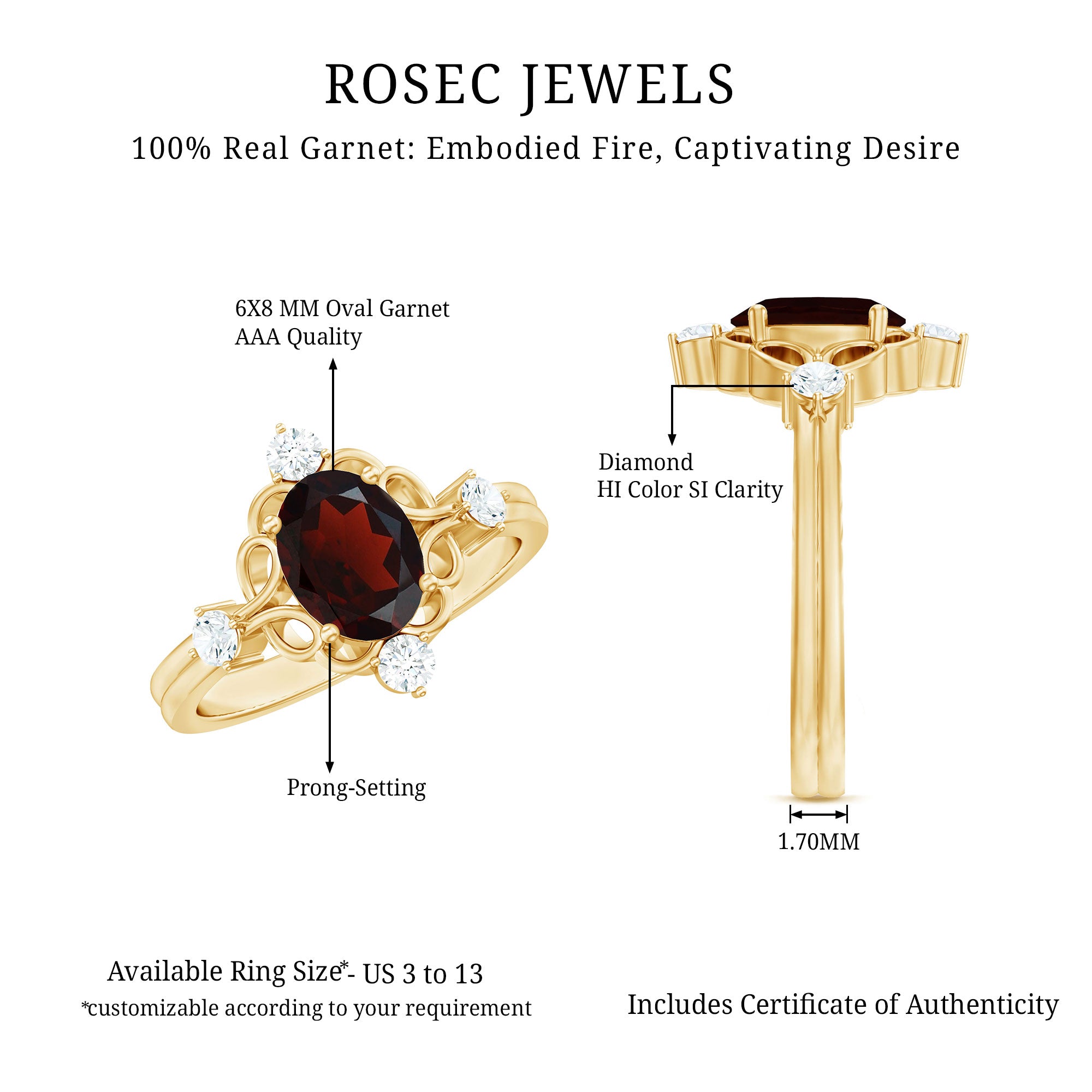 With the timeless charm of a love story that never fades, this Oblong Engagement Ring is a captivating symbol of devotion and elegance. The deep red 6X8 mm Oval Shape Garnet takes center stage, while a dainty Diamond on each side adds a subtle sparkle that enhances its classic beauty. Surrounding the AAA Quality Garnet is an intricate design that evokes vintage sophistication. Its elegant craftsmanship blends the nostalgia of bygone eras with modern refinement, making this Garnet Engagement Ring perfect for proposals, anniversaries or marking any moment that deserves to be cherished forever. Delivered in a signature jewelry box, this Garnet Diamond Ring arrives ready to surprise, delight and become a treasured keepsake. With a variety of ring sizes available, finding the perfect fit is effortless, making this Vintage Looking Engagement Ring a lasting testament to love, devotion and shared memories.