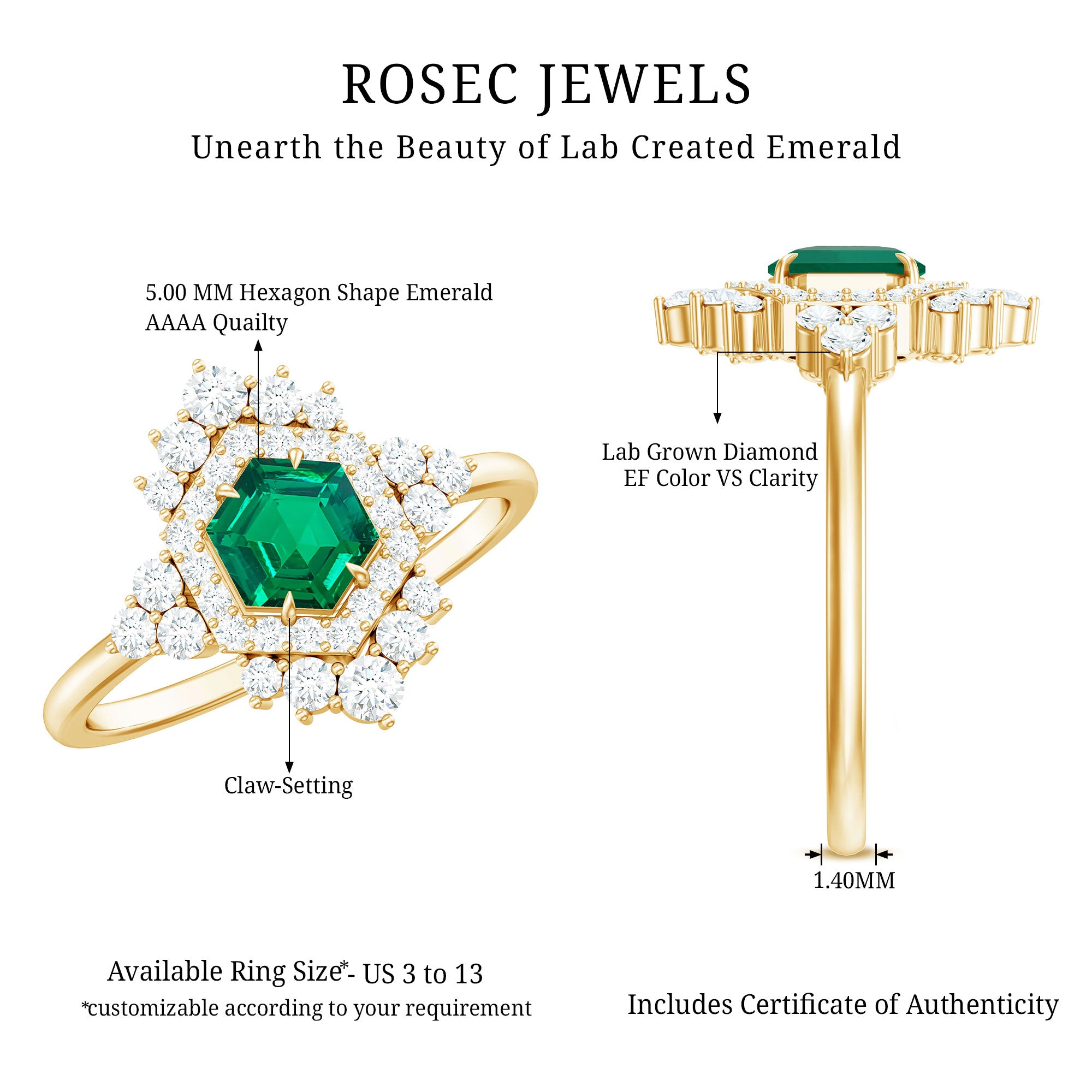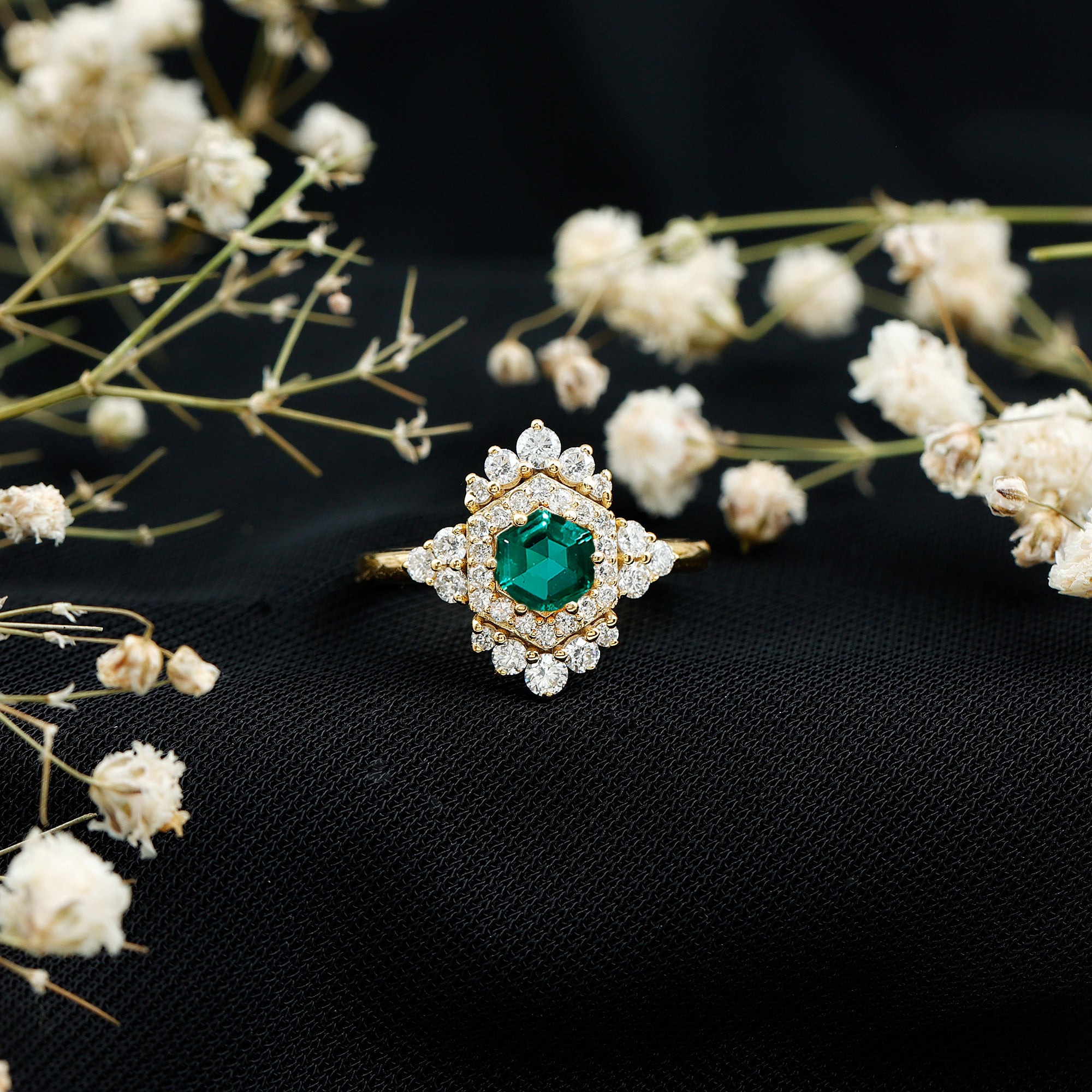 Looking for a ring that blends old-world charm with modern style? This Art Deco inspired Emerald Engagement Ring might just be your perfect match. Designed to stand out, it is crafted in 14K yellow gold plated silver and brings a vintage vibe with a fresh, contemporary twist. At the center is a striking 5 MM hexagon shaped lab created emerald, held securely in claw setting. Surrounding the centerpiece is a halo of round lab grown diamonds, creating a radiant border that adds just the right amount of sparkle. The more round lab diamonds set into the band as a cluster continue the flow of sparkle, enhancing the ring’s presence without overwhelming the design. Every detail, from the precise placement of the stones to the polished finish of the band, reflects thoughtful craftsmanship. It is a piece that feels both refined and artistic, perfect for anyone who loves jewelry with a little extra character. Whether you are choosing it as an engagement ring or a statement piece for your personal collection, this Emerald and Diamond Ring is made to turn heads. With its unique shape, clean lines, and glowing elegance, this Vintage Emerald Ring promises to be more than just a ring, it is a conversation starter, a keepsake, and a small dose of luxury you will love wearing every day.