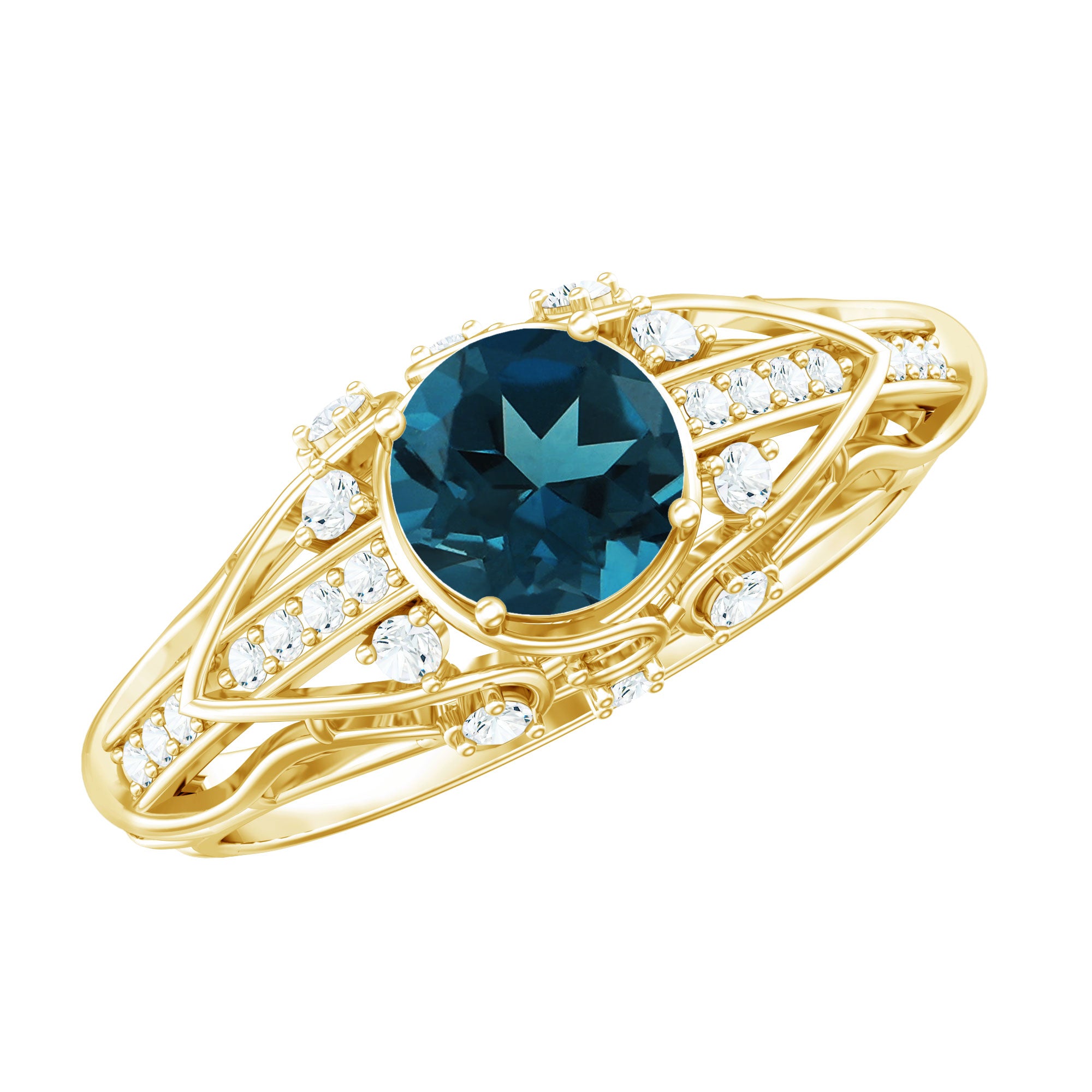 This vintage-looking London blue topaz and diamond engagement ring is designed for those who appreciate rich color and heirloom-inspired detailing. The deep blue topaz center introduces a bold yet composed presence, contrasted by surrounding diamonds that frame the stone with refined brilliance.