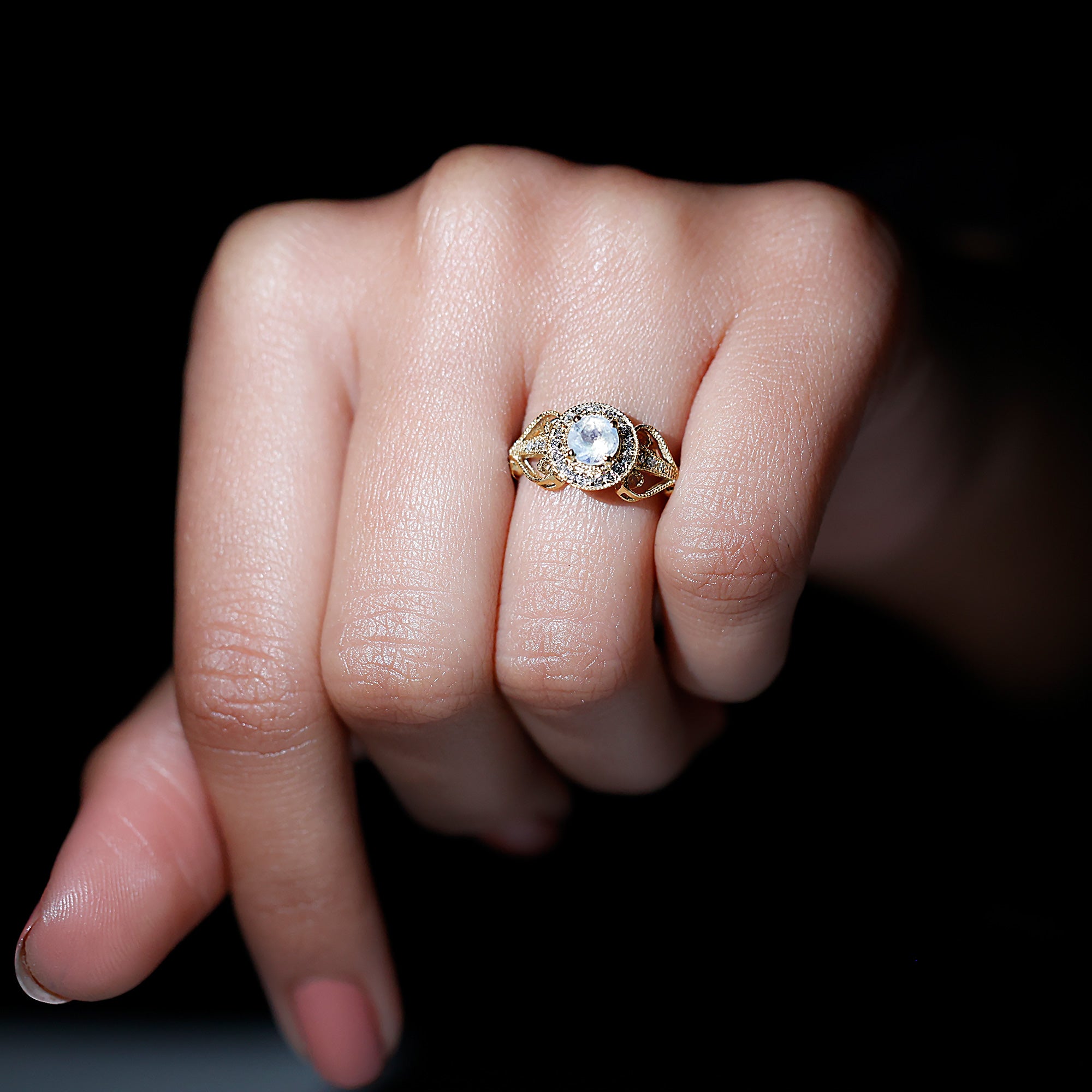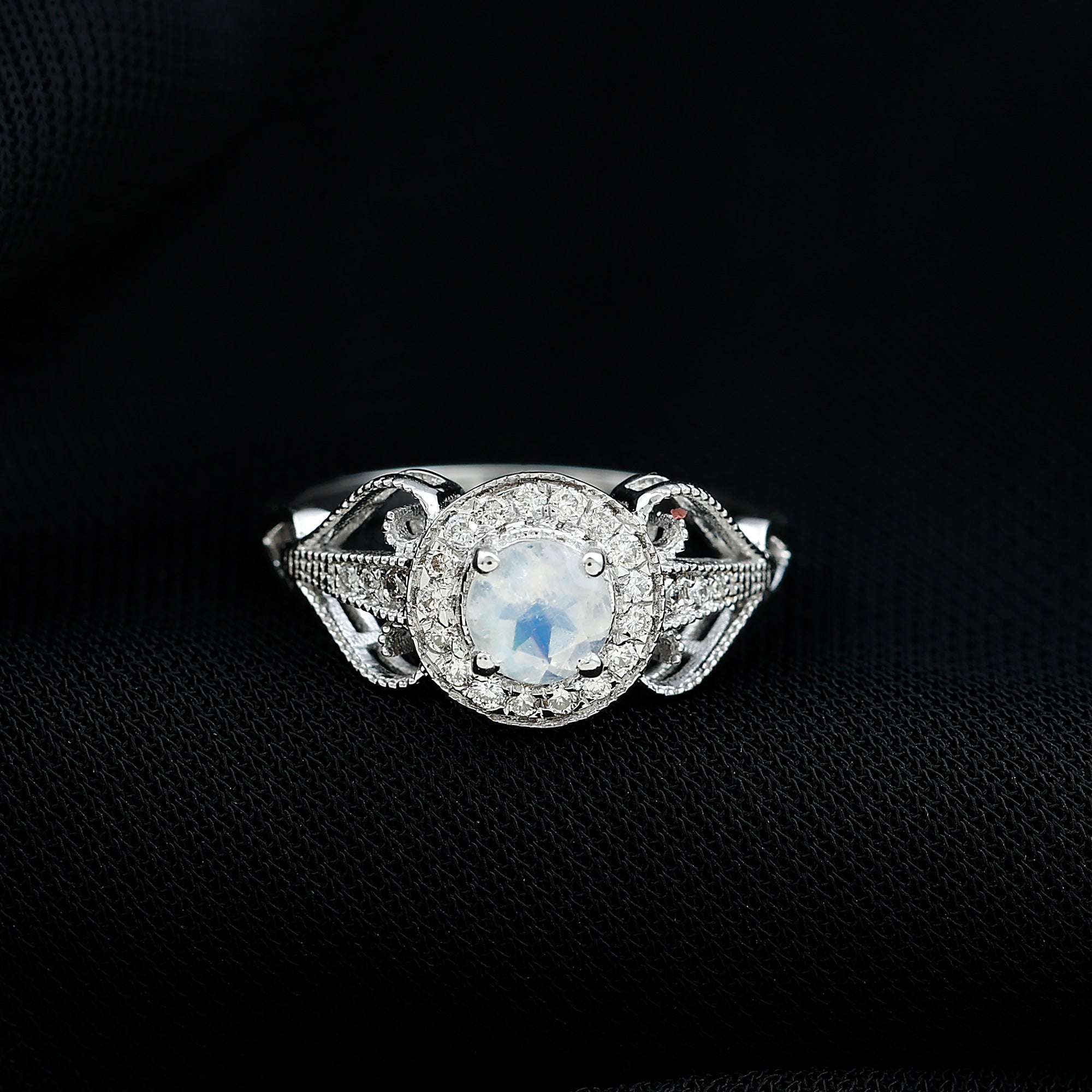 The brightness of Moonstone makes this vintage ring more appealing. The Moonstone Engagement Ring is embellished with Round Diamond Accent, glistening on the shank beautifully. The Moonstone Diamond Engagement Ring is accentuated with Beaded Gold, make your significant feel more precious with this Moonstone Gold Ring.