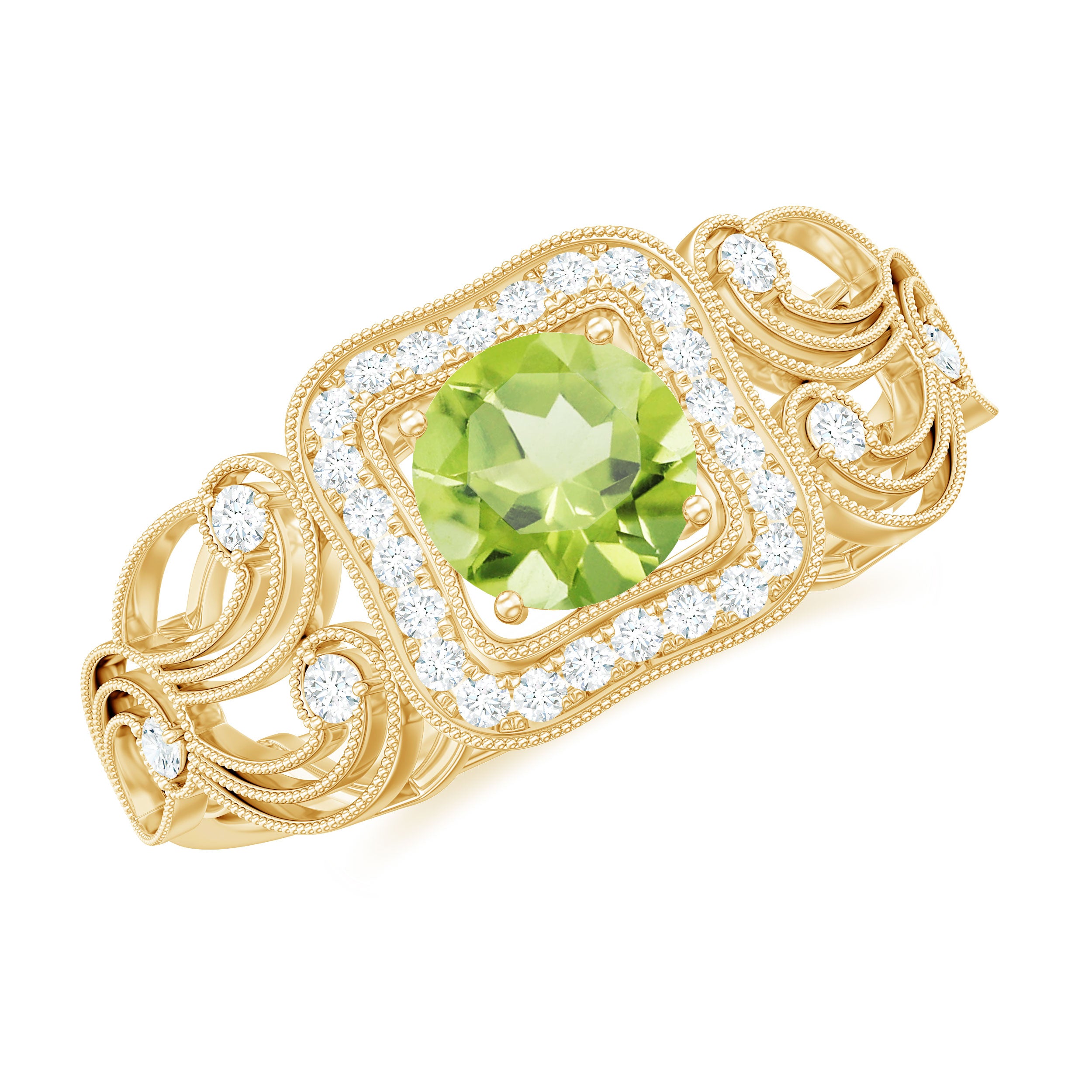 An Amazing and Fabulous Vintage Engagement Ring is a perfect gift for your lady. This Engagement Ring is decorated with Round Shape Peridot in the center and a Round Diamond in a halo and Side Stones. Milgrain floral design set with Diamond magnifies the piece. This Peridot Engagement Ring is mounted in Gold Metal.