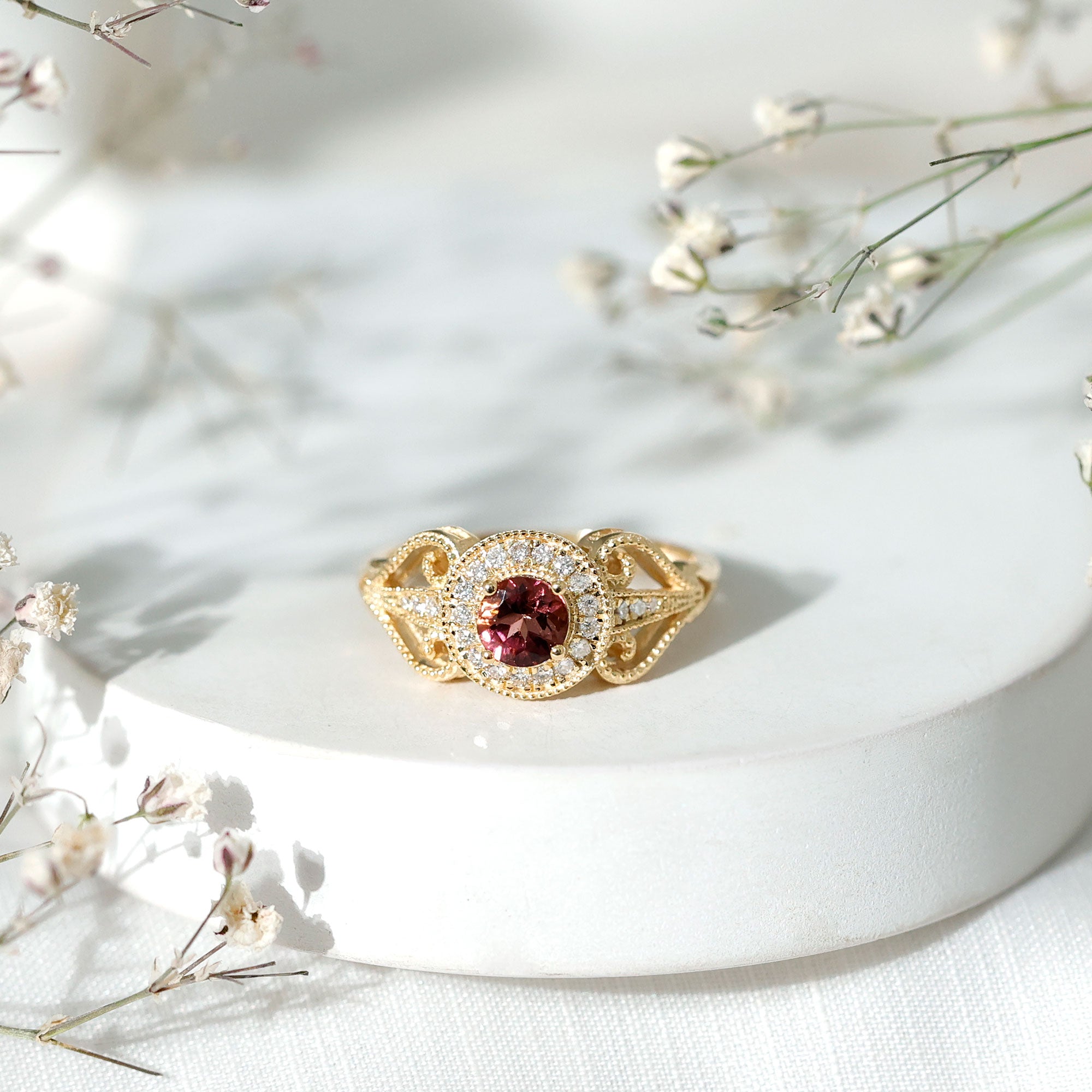 Vintage Pink Tourmaline Diamond Engagement Ring with Gold Beaded Detail