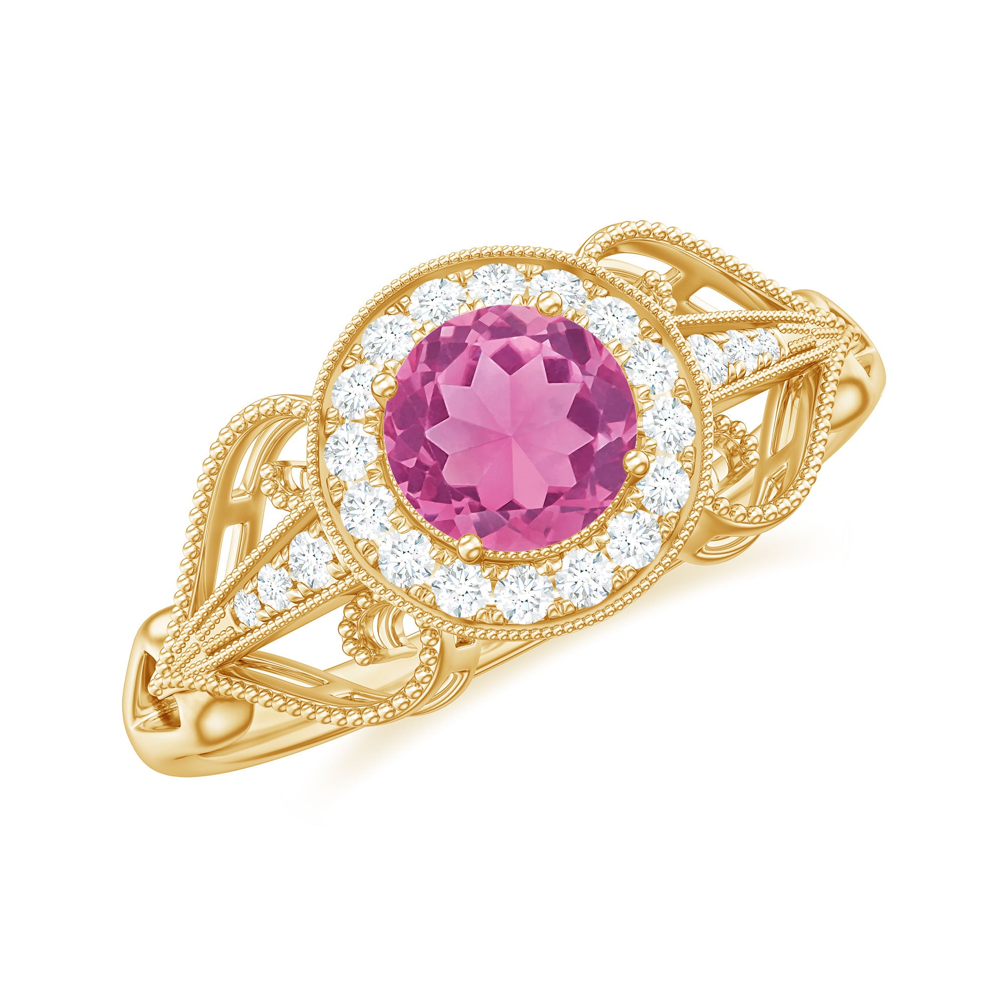 The Vintage Pink Tourmaline Diamond Engagement Ring with Halo brings together soft color and intricate detail in a design inspired by classic heirloom styles. The pink tourmaline center creates a romantic focal point, while a surrounding diamond halo enhances its presence with refined brilliance. It is a distinctive choice for those seeking an engagement ring that feels both expressive and timeless.