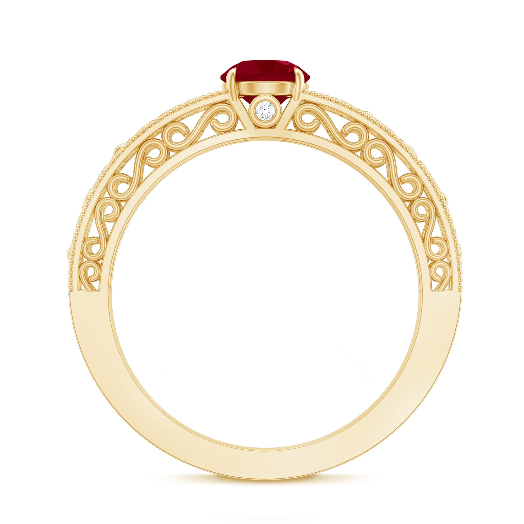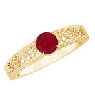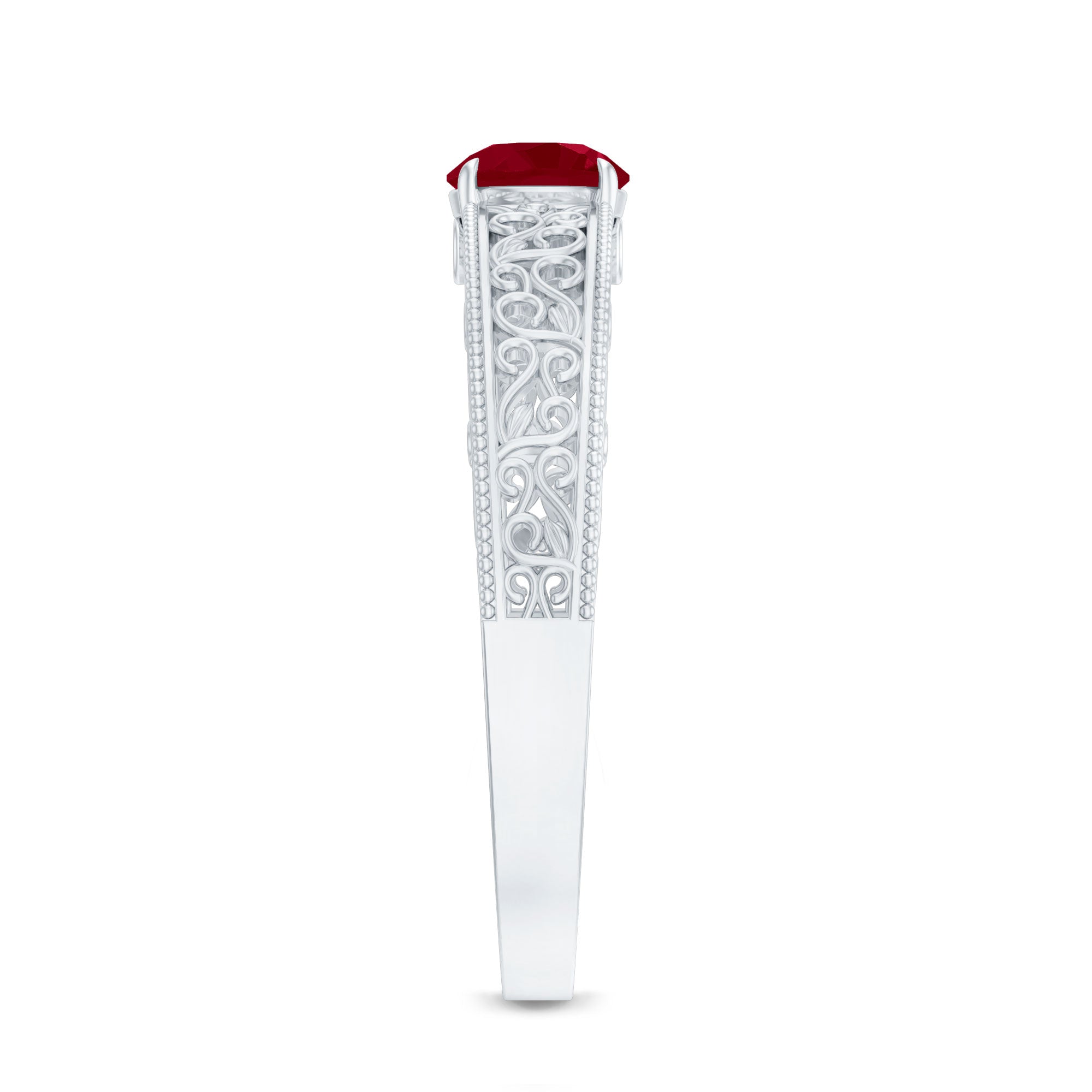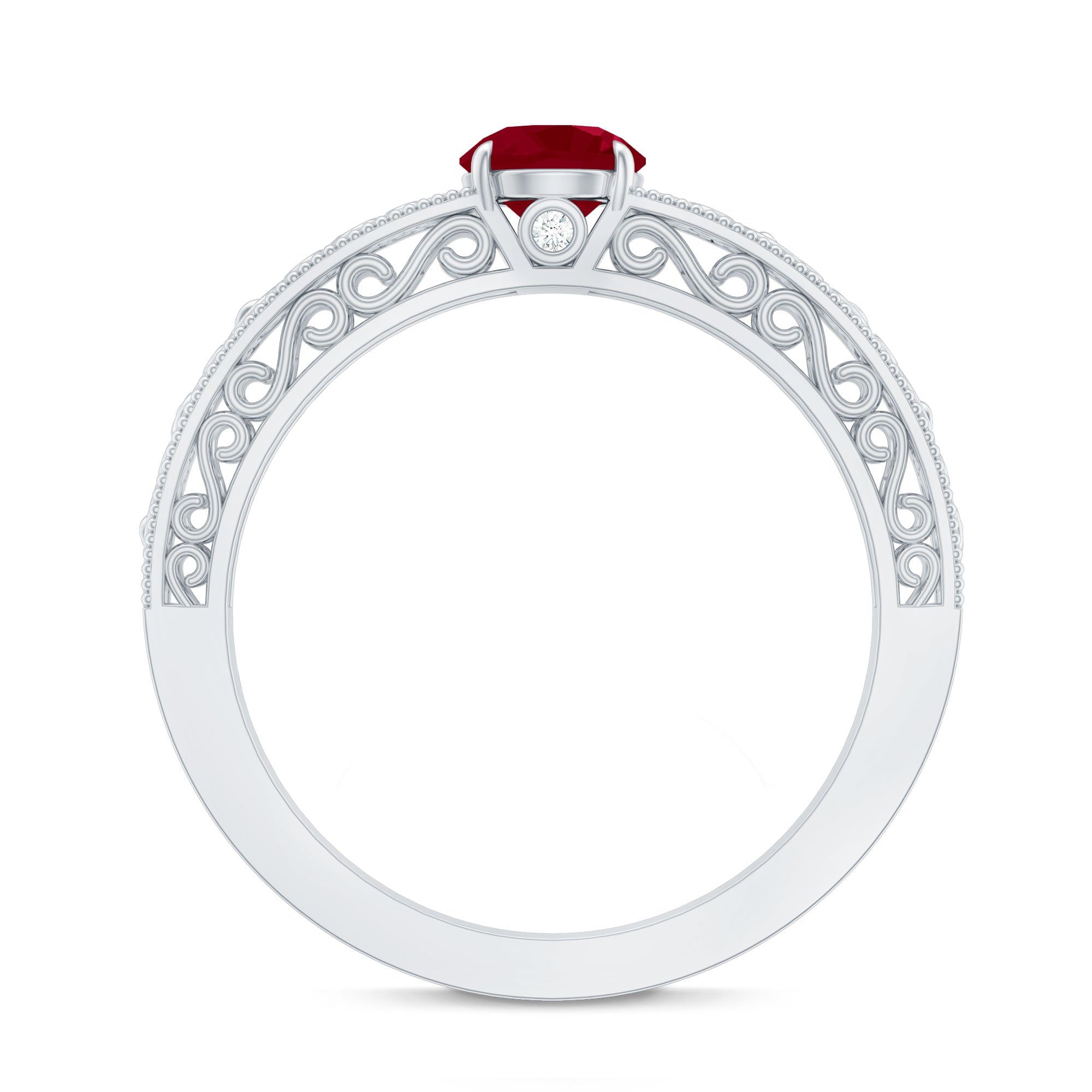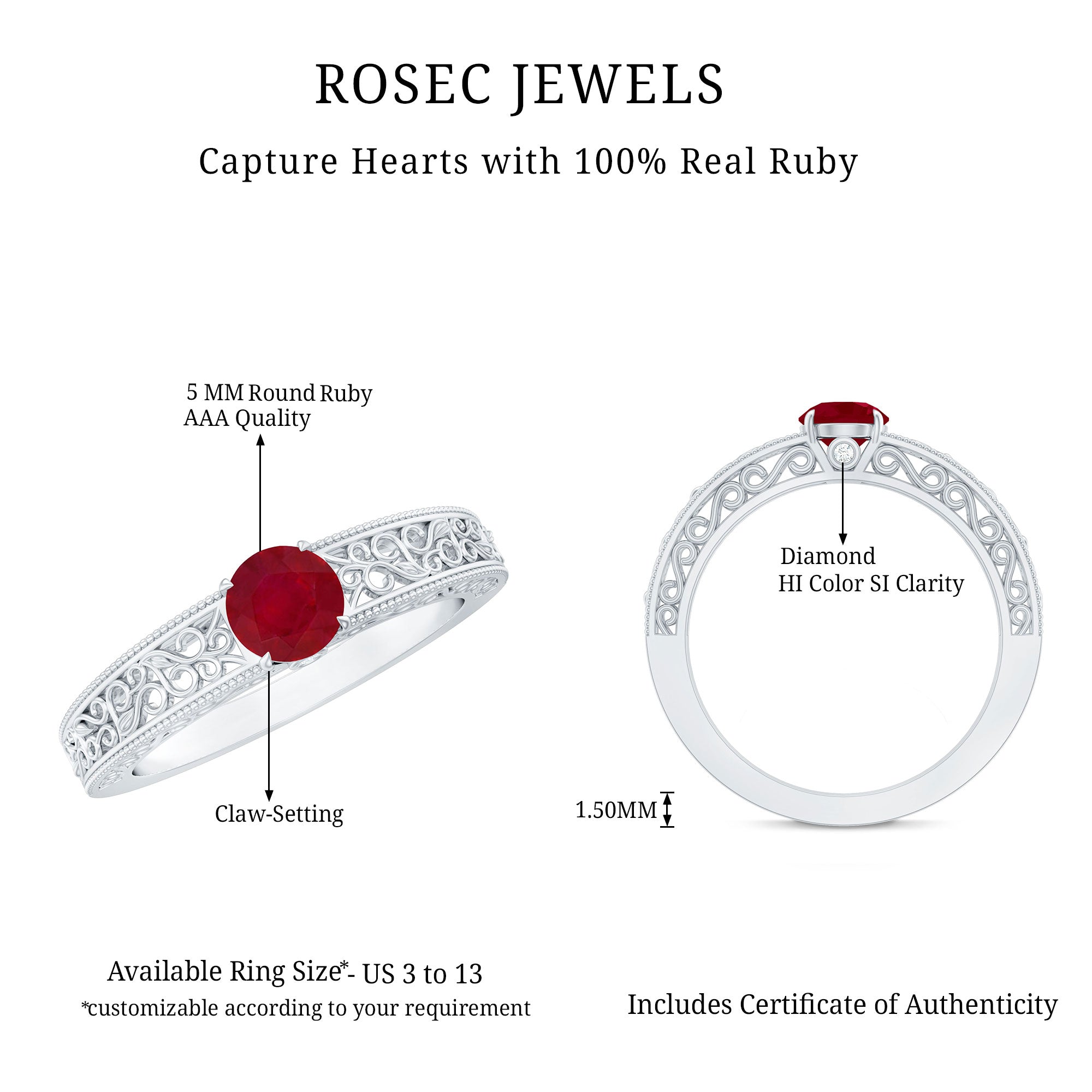Start your journey of Love with this Beautiful Ruby Engagement Ring. It is embellished with Round Shape Ruby in Prong Setting with Surprise Diamond. Adorn with Filigree design on the half of the shank to give it a vintage look. Buy this enchanting Ruby Solitaire Engagement Ring for the love of your life and make her eyes glitter.