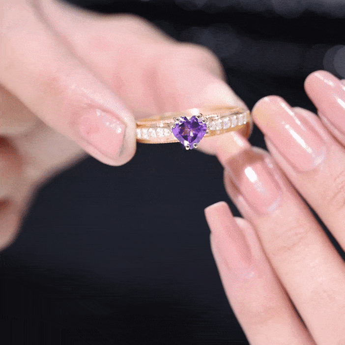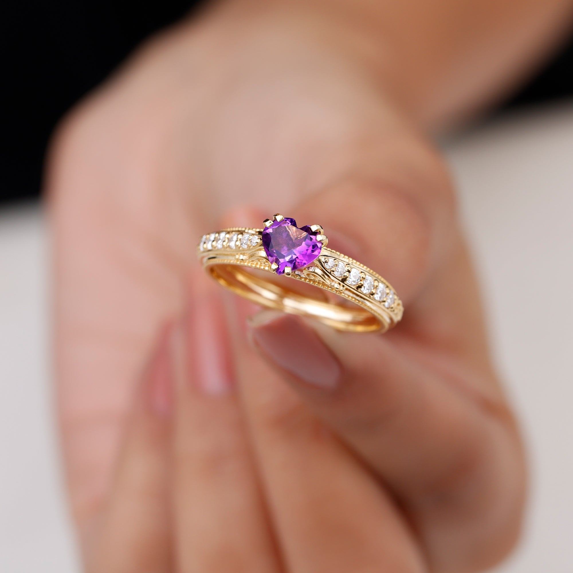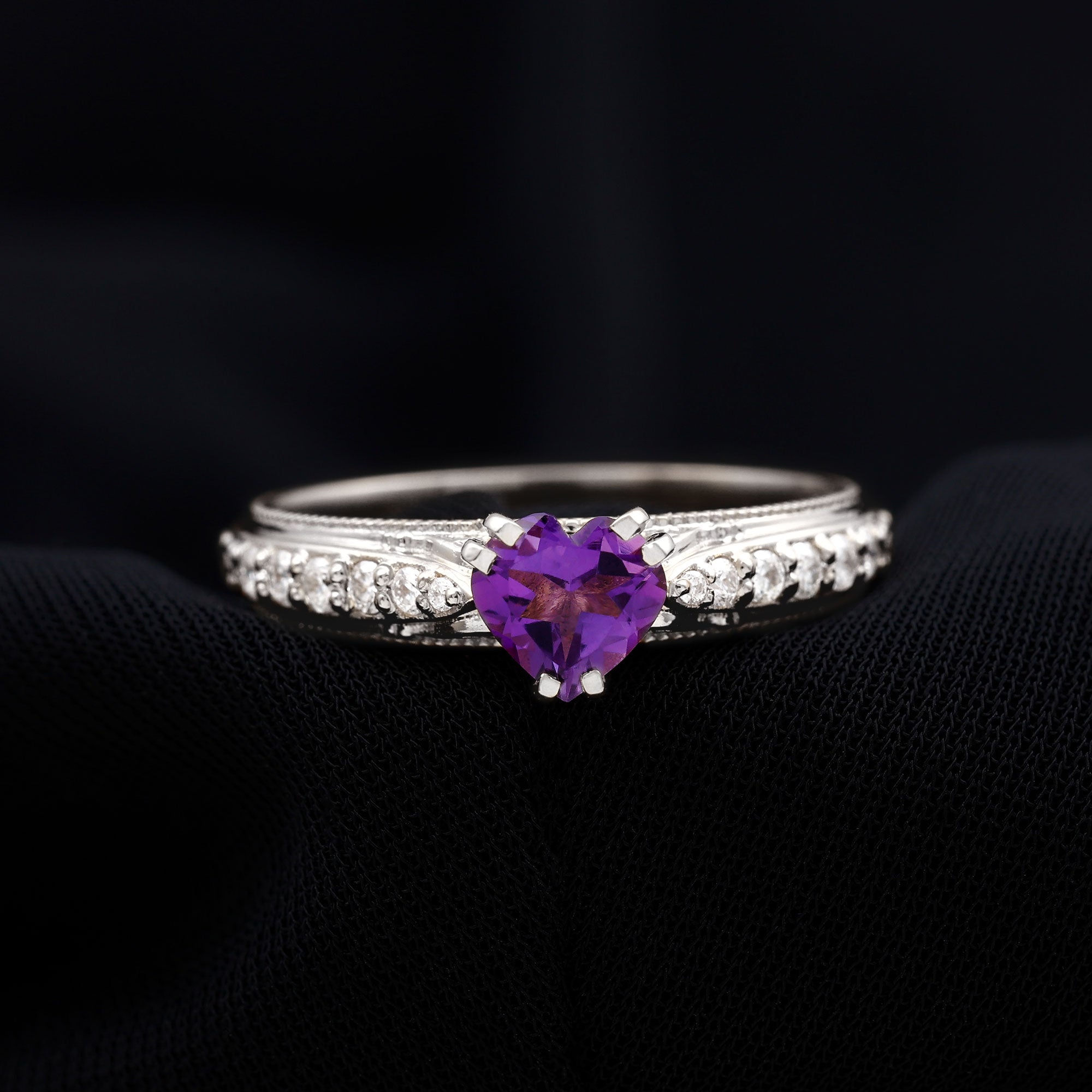Emanate an additional vibrancy through the allure of the exquisite Heart Engagement Ring. This mesmerizing Solitaire Ring is beautified with heart shape amethyst gemstone in a double square prong setting, the band is decorated with dainty round Diamond stones and metal beaded detailing. An impeccable gift for your cherished one, designed to evoke an extraordinary sense of significance.