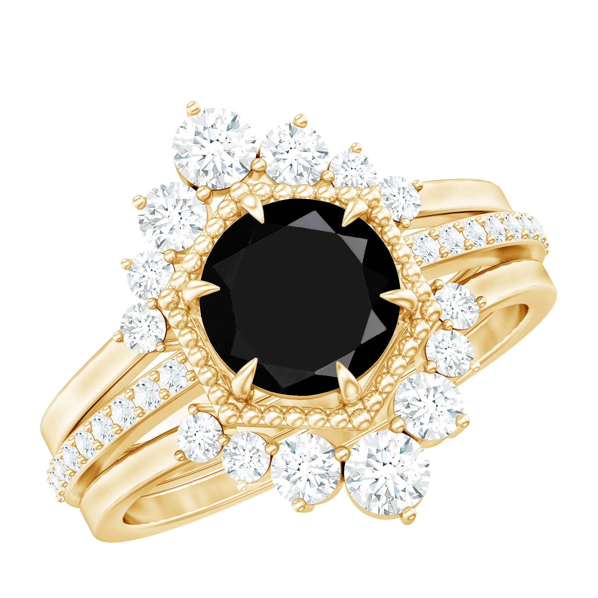 Make a stunning statement of love with this 3 Piece Wedding Ring Set, designed for those who adore romance with a touch of vintage soul. At the center of the Solitaire Engagement Ring, an elegant 8 mm Round Shape Black Spinel set in Claw Setting takes the spotlight, glowing with a deep, dramatic beauty that feels both timeless and bold. The Vintage Inspired Engagement Ring is framed with delicate Beaded detailing, adding an old-world charm that whispers of classic love stories. Tiny Moissanite stones line the band, catching the light with every movement and adding a dreamy sparkle. Completing the set, two beautifully Curved Enhancer Rings are adorned with Round Moissanite stones, perfectly hugging the center ring to create a layered look that feels rich and meaningful. Worn together or separately, this Black Spinel Engagement Ring with Enhancer allows love to be expressed in many beautiful ways. Crafted with care and available in various ring sizes, this Vintage Wedding Ring Set is made for comfort, elegance and everyday romance. Ready to gift in a signature jewelry box, this Wedding Bridal Ring Set is perfect for proposals, anniversaries or simply celebrating a love that feels rare, powerful and endlessly captivating.