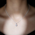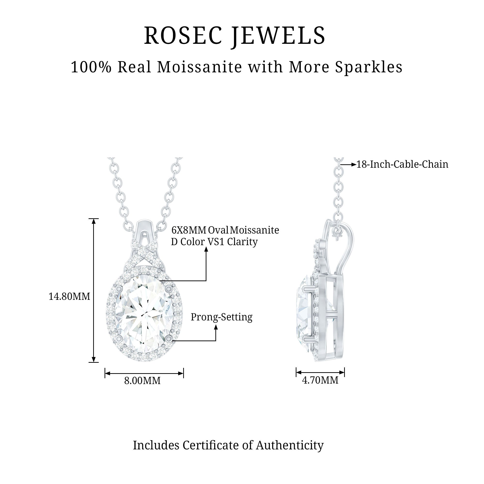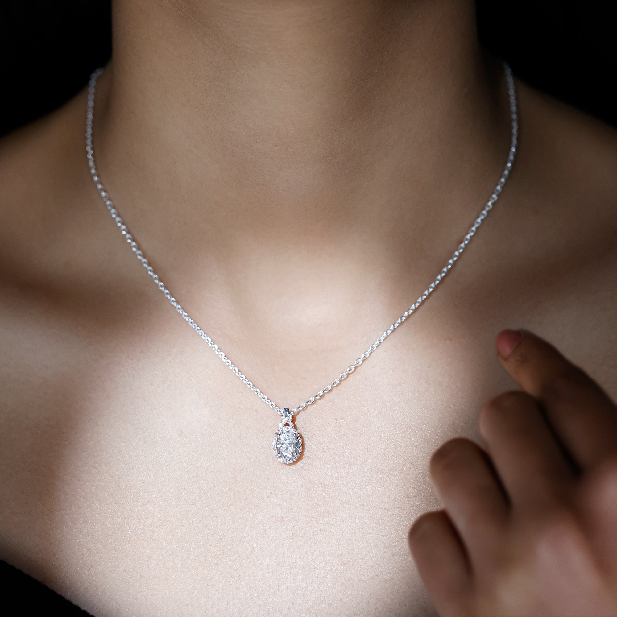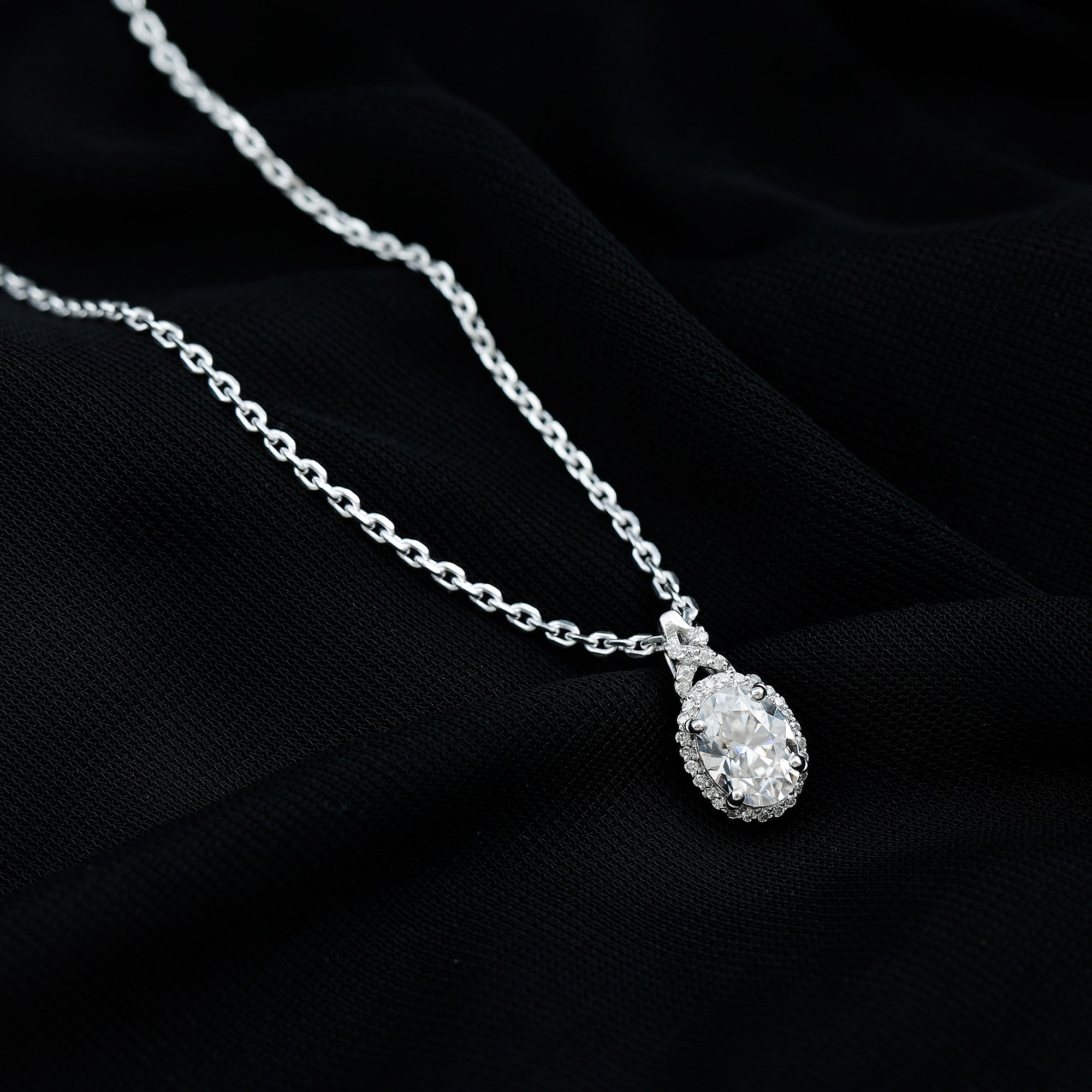 This Moissanite Pendant exudes shimmer, perfect for completing the look for the special day. The pendant features a 6X8 MM Oval Shape Moissanite of D-VS1 Quality Securely placed in Prong Setting and decorated with a halo of Smaller stones that amplify the beauty of the center stone. This Classic Pendant Necklace is a sustainable and budget-friendly addition to your jewelry collection and can also be presented to your lady love on a special occasion. This Halo Pendant dangles with a sturdy cable chain that allows adjustment according to your choice. This 1 Carat Necklace can be worn solely as a statement or can be layered with other necklaces.