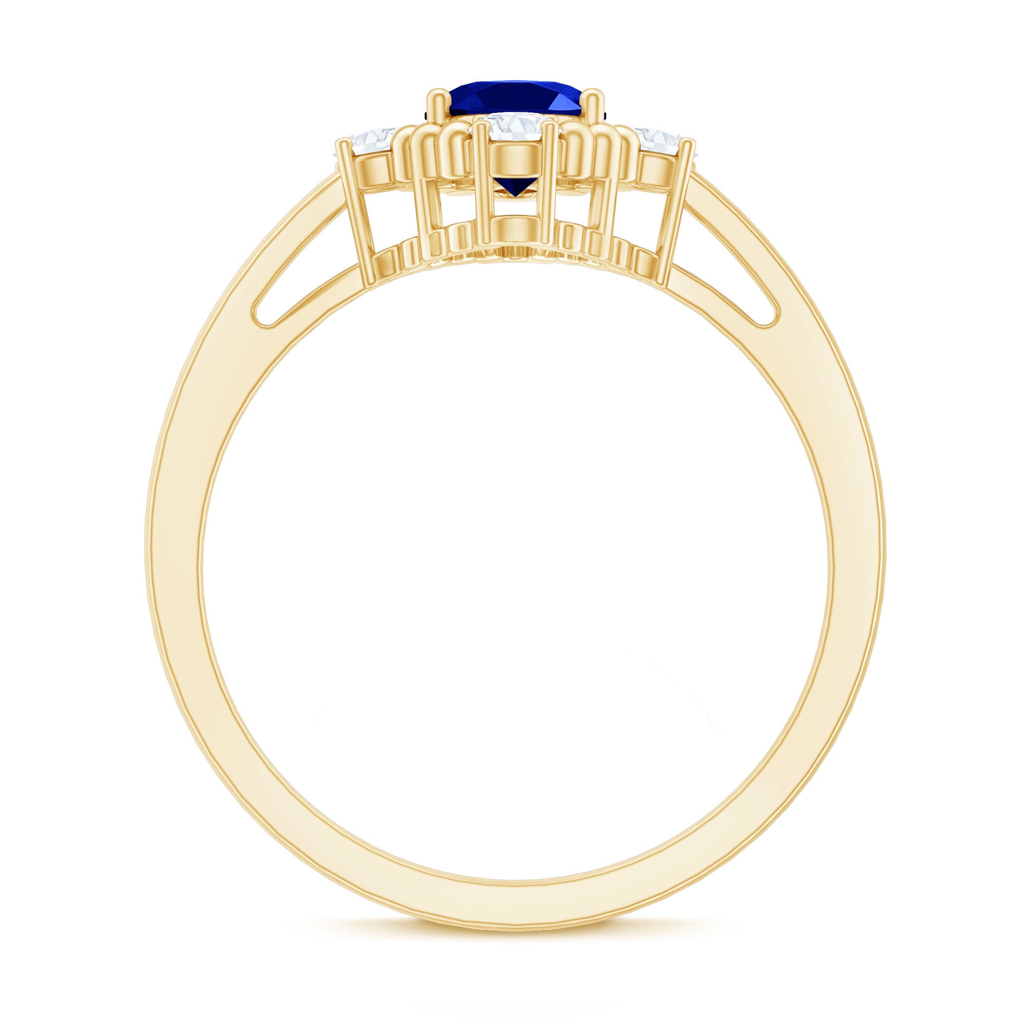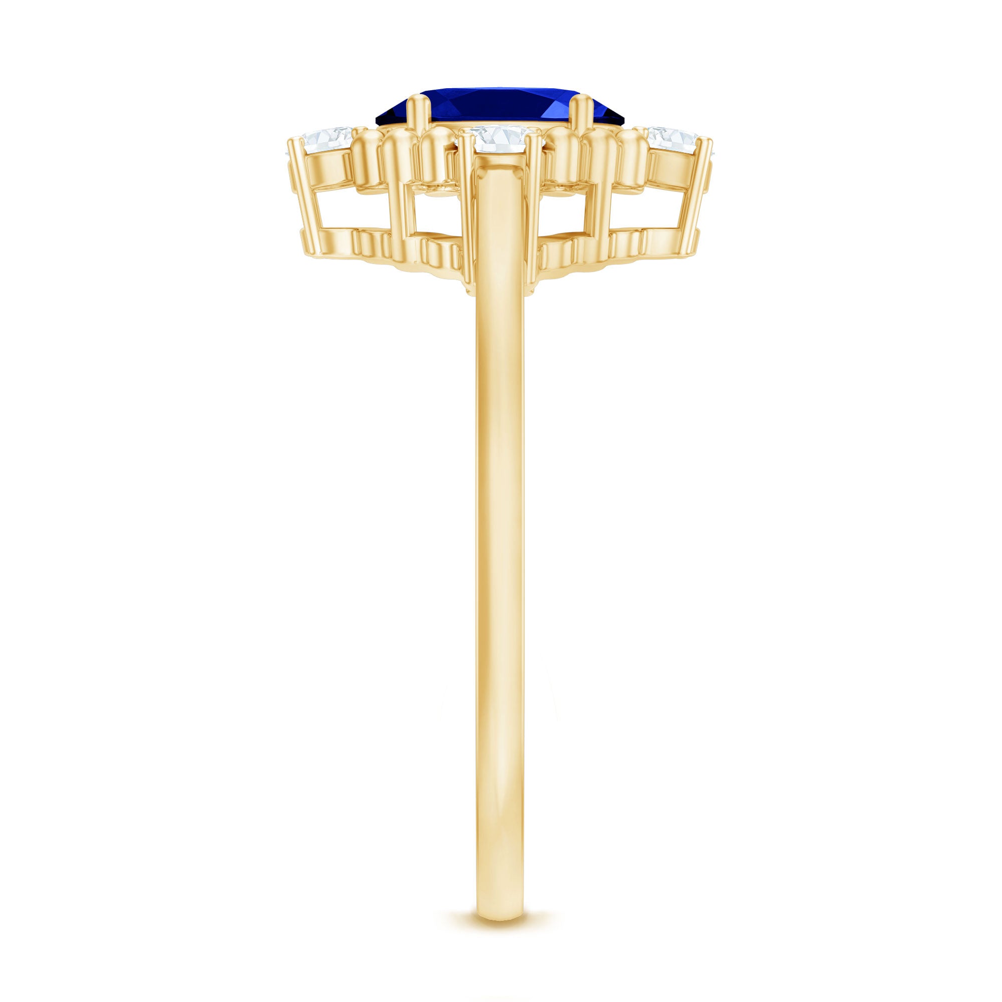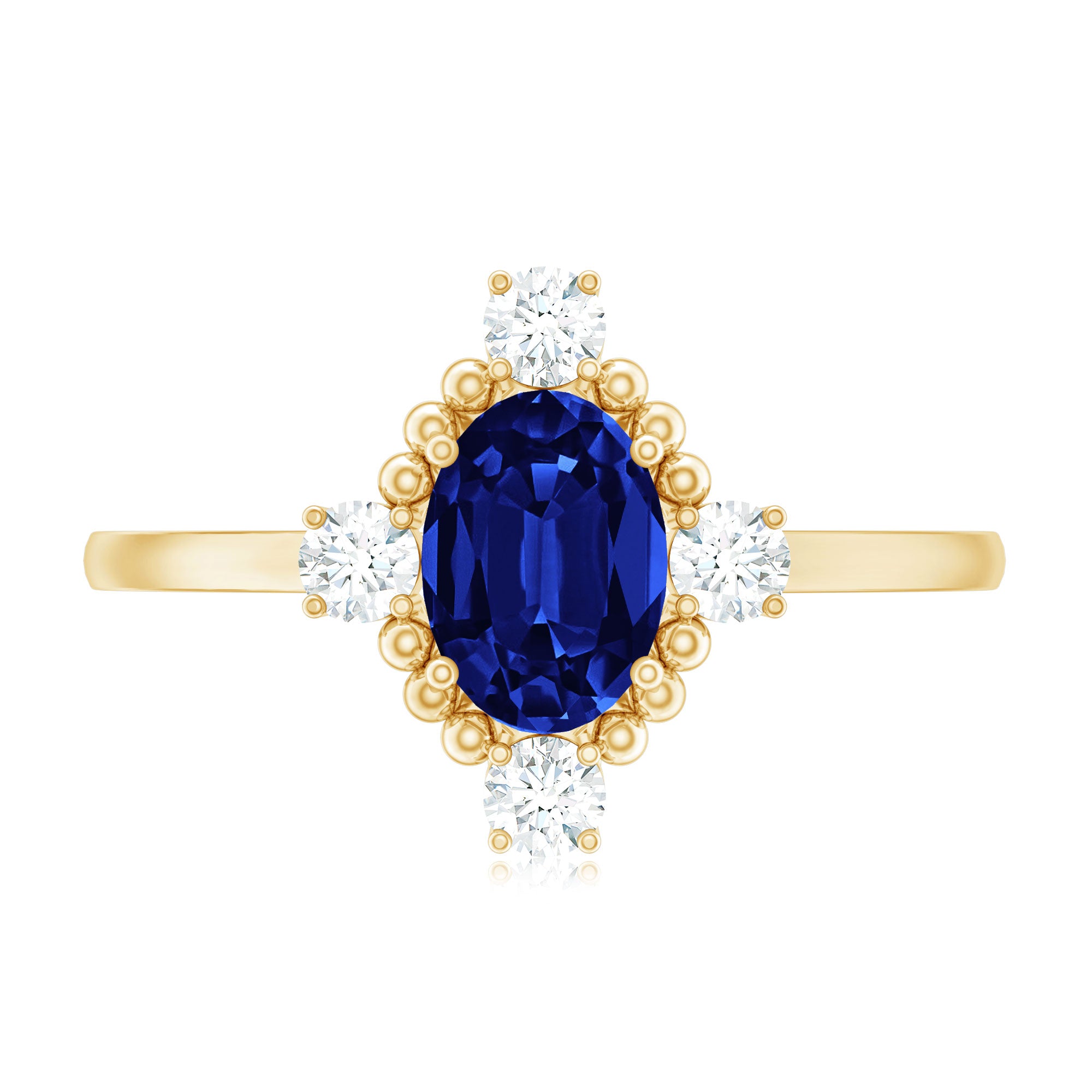 This vintage-inspired engagement ring features an oval-cut created blue sapphire solitaire, surrounded by round Diamond and beaded gold detailing. The elegant combination of the created blue sapphire and the brilliant Diamond creates a timeless and sophisticated look that is perfect for a special occasion such as an engagement or anniversary. The vintage style and attention to detail make it a piece of jewelry that will be treasured for years to come.