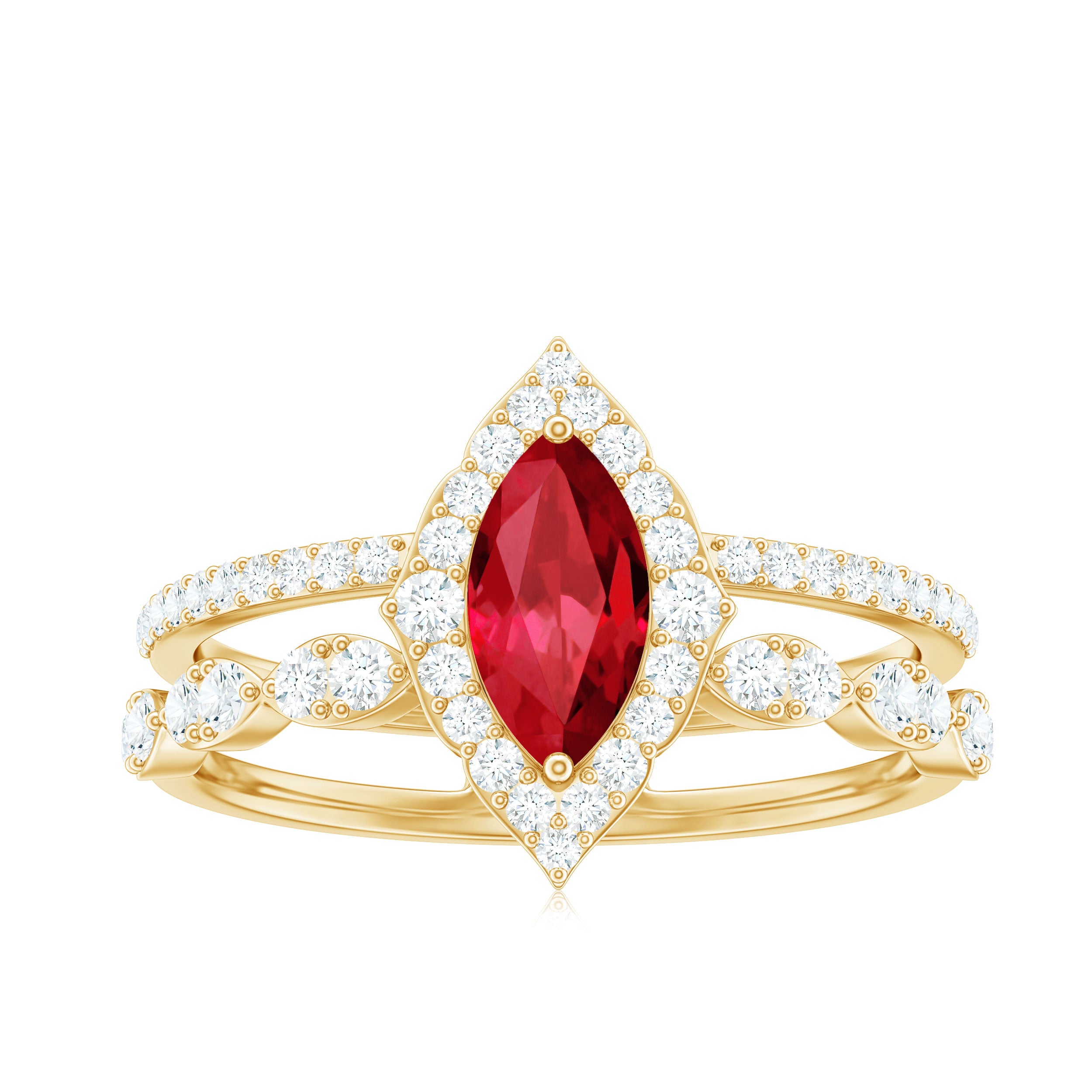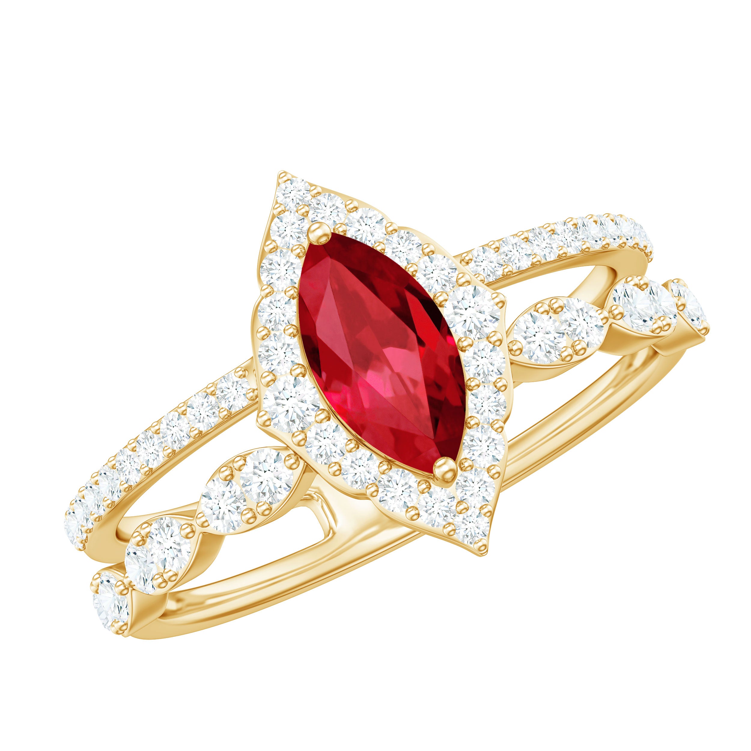 Give your special woman a ring that speaks of love, elegance, and timeless beauty. The Vintage Inspired Engagement Ring from Rosec Jewels is handcrafted with care and features a stunning 4X8 MM marquise shaped lab created ruby at its center. The ruby sits securely in a 2-prong setting, surrounded by a halo of real diamonds arranged in a lovely flower shape. The sparkling diamonds enhance the ruby’s glow, creating a perfect balance between vintage charm and modern brilliance. Every detail is designed to make the Marquise Engagement Ring stand out beautifully while still feeling comfortable to wear every day. Adding to its charm, the double band is finely studded with shimmering diamonds, giving the Vintage Ruby Ring extra sparkle and sophistication. The smooth and secure design ensures a comfortable fit, while the overall look stays elegant and classy. Crafted in premium precious metal, you can choose from different color and purity options to match your taste. Presented in our signature luxury box, this Double Band Ring is a heartfelt promise of love, crafted to be treasured for a lifetime.