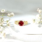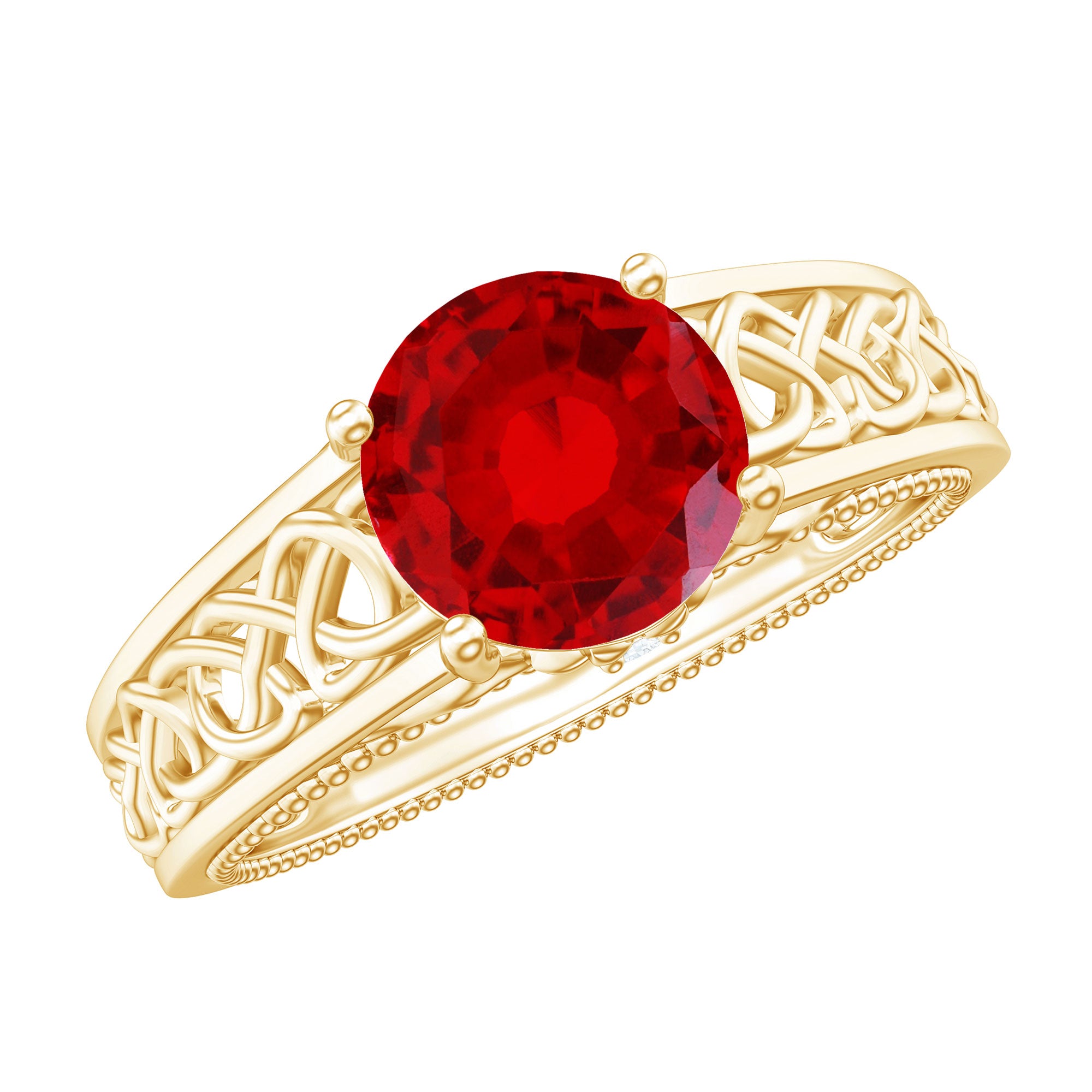 Surprise your special someone with this alluring Band Ring. Adorned with a 7 MM Round Shape created ruby in a prong setting, it is crafted from solid gold for a touch of elegance. This solid gold ring will add a mesmerizing touch to any jewelry collection.