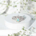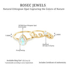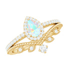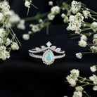 Capture timeless romance with this Vintage Inspired Wedding Bridal Ring Set, where classic elegance meets captivating color. The Teardrop Engagement Ring features a stunning 5X7 mm Pear Shape Ethiopian Opal as a centerpiece, surrounded by a sparkling Diamond halo that amplifies its natural glow. Flanked by delicate side stones, the Opal shines with an irresistible allure, drawing the eye to its unique, iridescent charm. Complementing the Engagement Ring is a gracefully crafted V Shaped Wedding Band, adorned with sparkling Diamond stones and intricate Beaded Detailing, adding texture and sophistication that perfectly hugs the finger. This Opal Engagement Ring Set blends vintage inspired artistry with modern refinement, creating a set that feels both nostalgic and refreshingly unique. Whether you are saying I do or celebrating a milestone, this Teardrop Engagement Ring and Wedding Band is designed to be a lasting symbol of the depth and vibrancy of your love. Available in various ring sizes and presented in a chic jewelry box, this Engagement and Wedding Ring Set is ready to make your special moment unforgettable. Let this exquisite combination of the mystical beauty of opal and diamond brilliance tell your forever story in the most enchanting way.