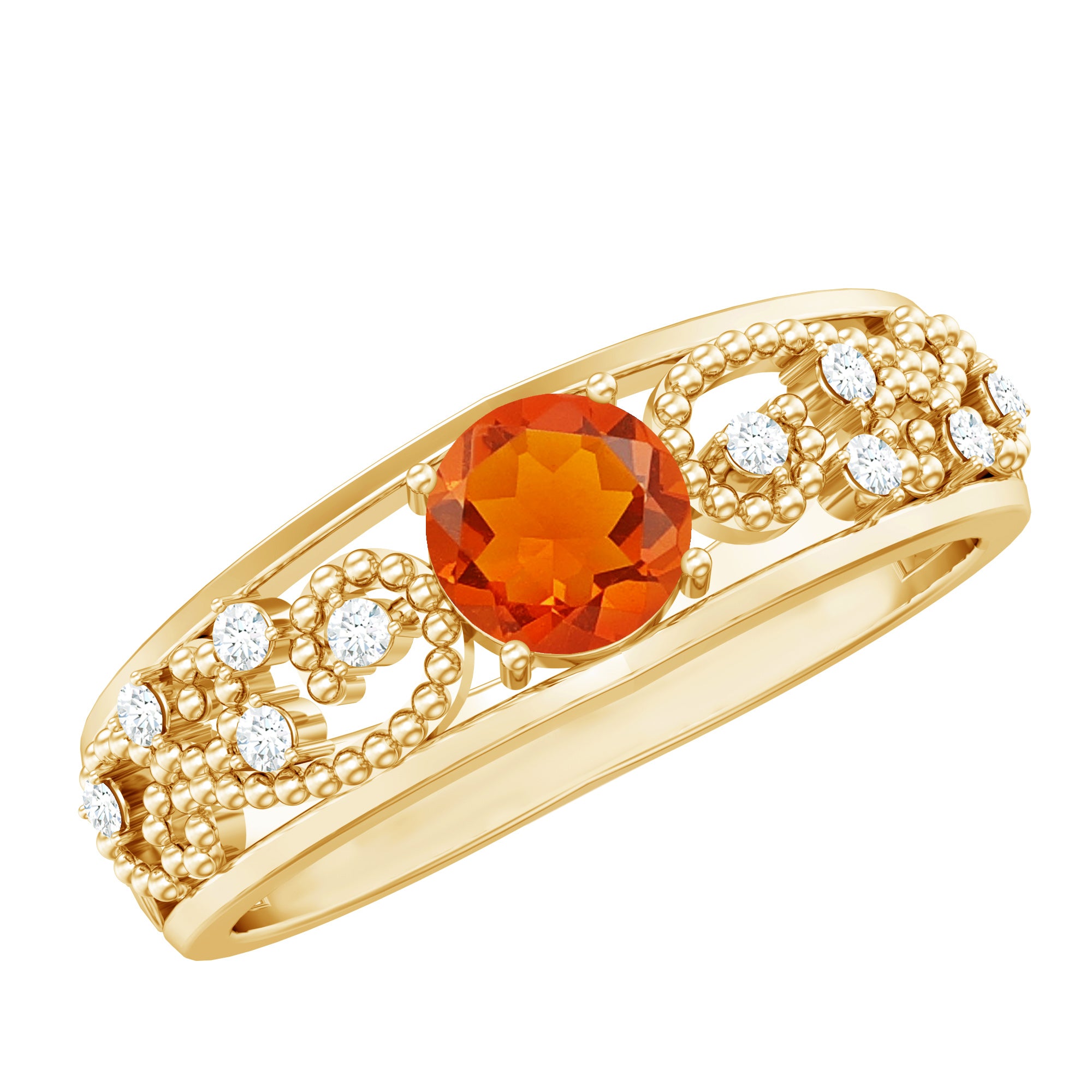 Vintage Style Fire Opal Solitaire Band Ring with Diamond and Beaded Detailing