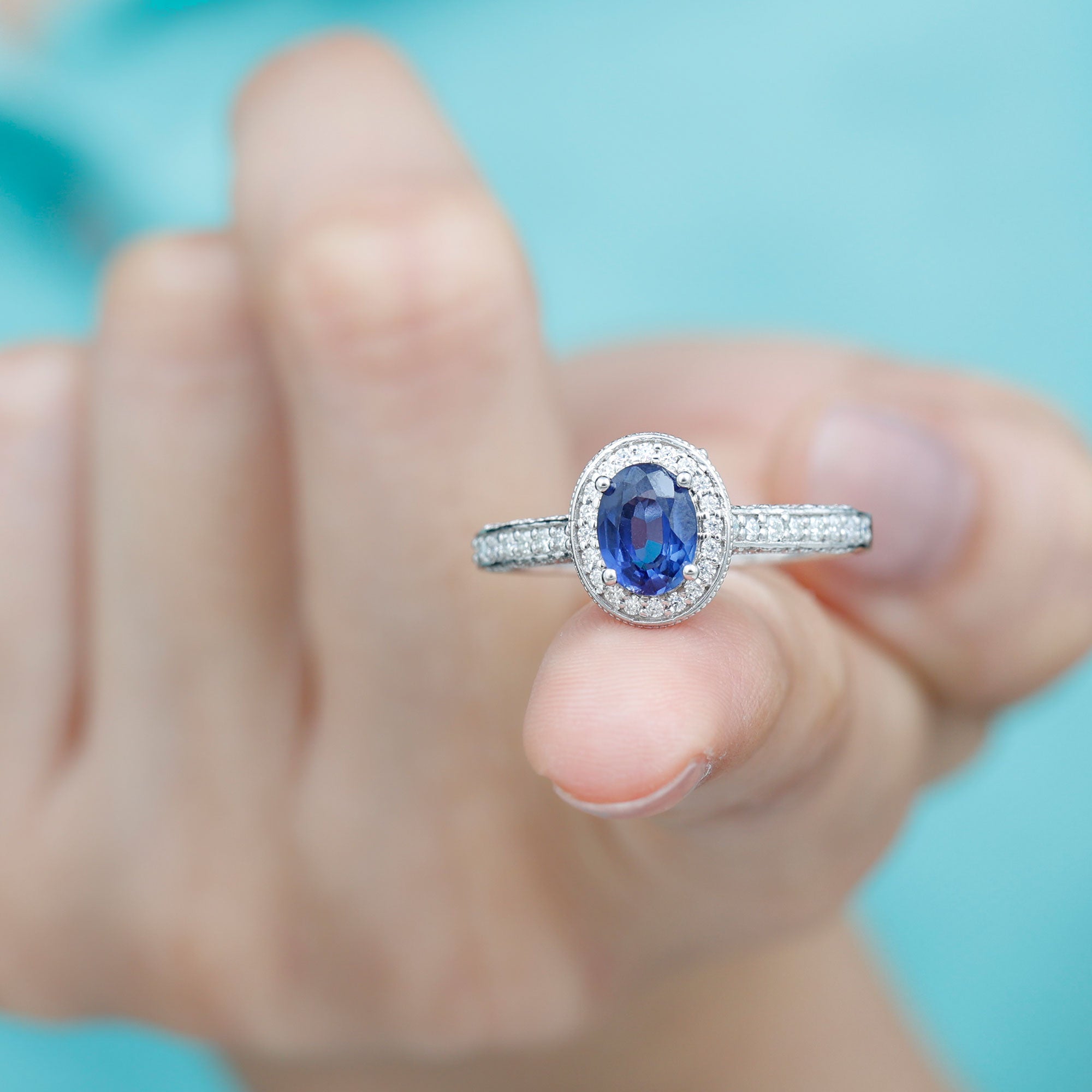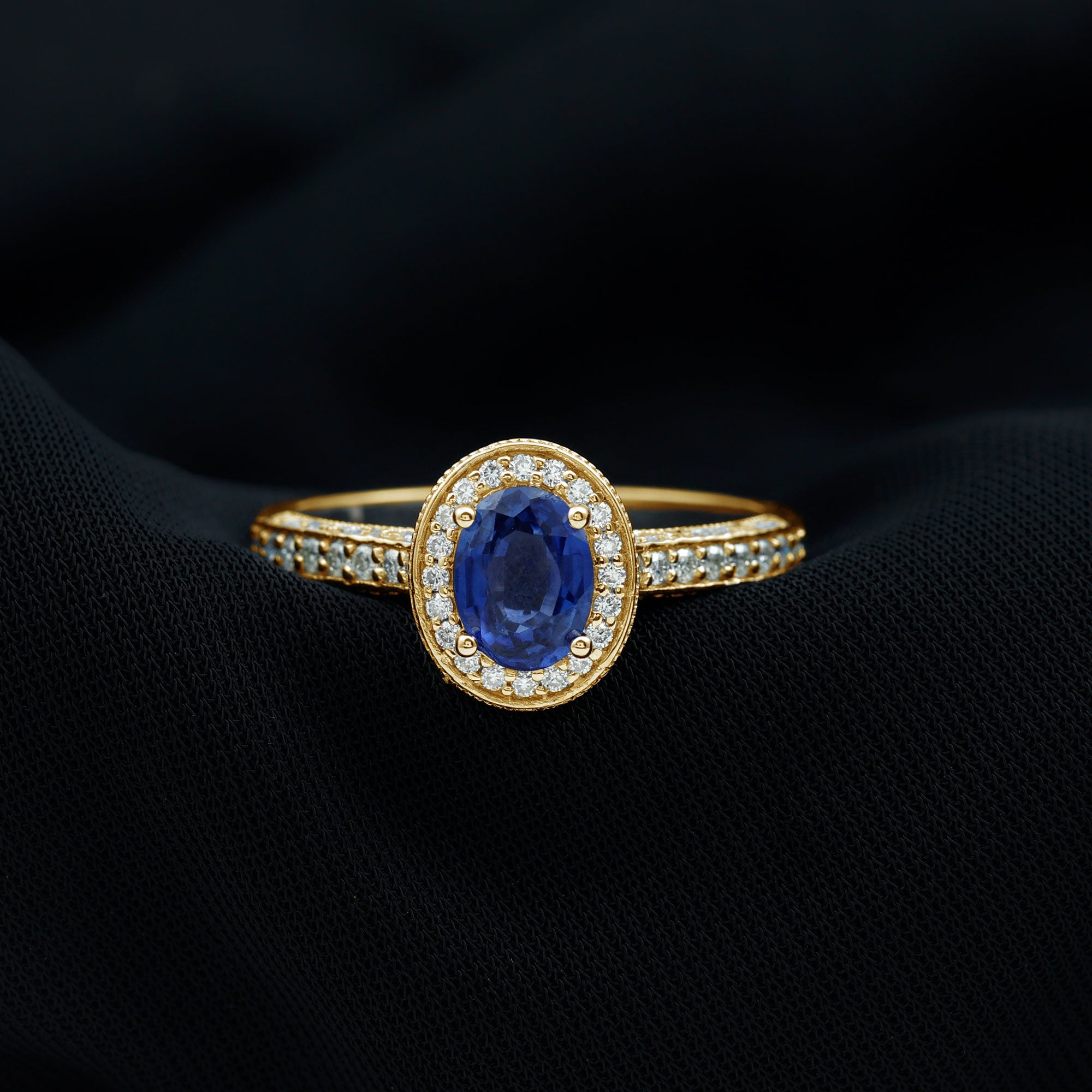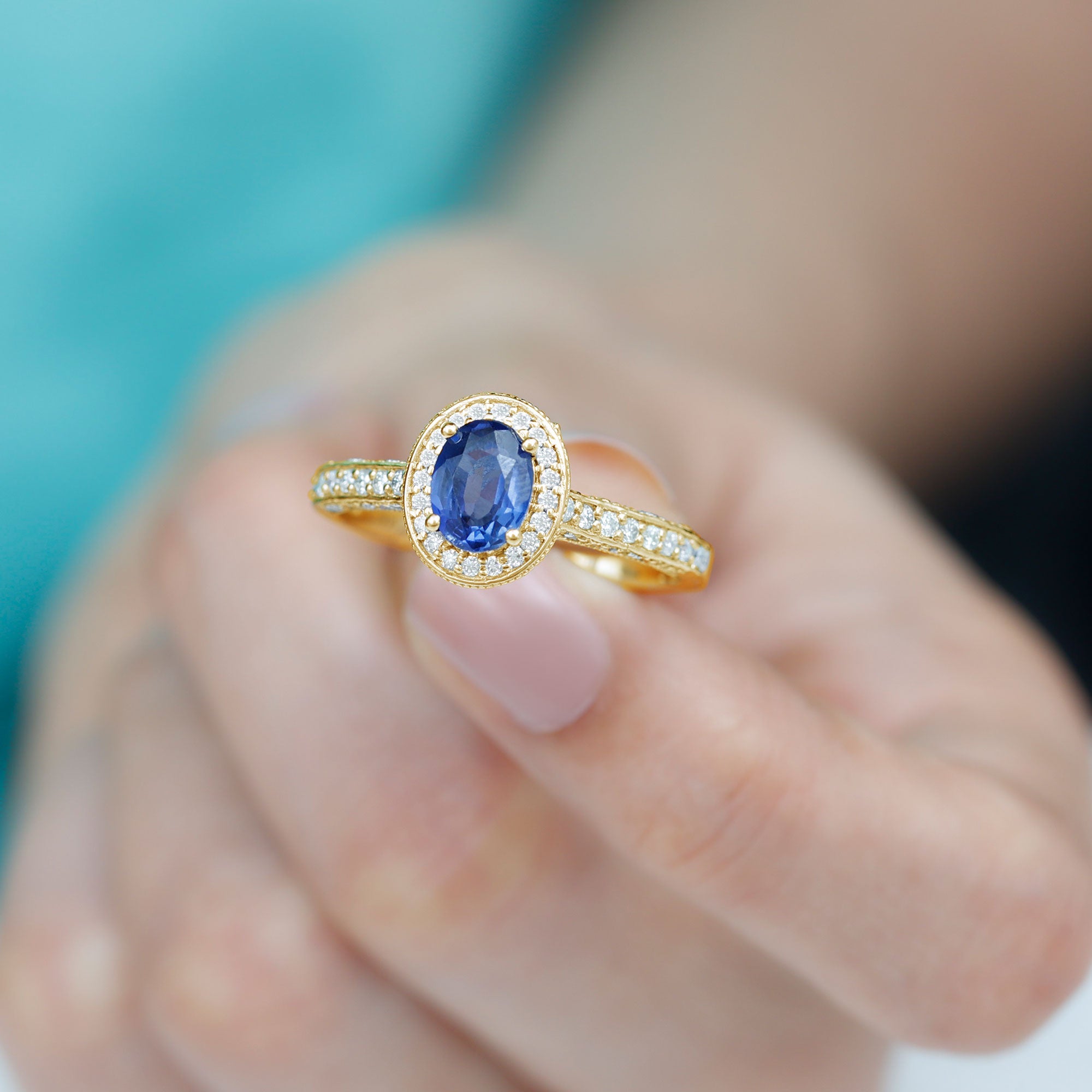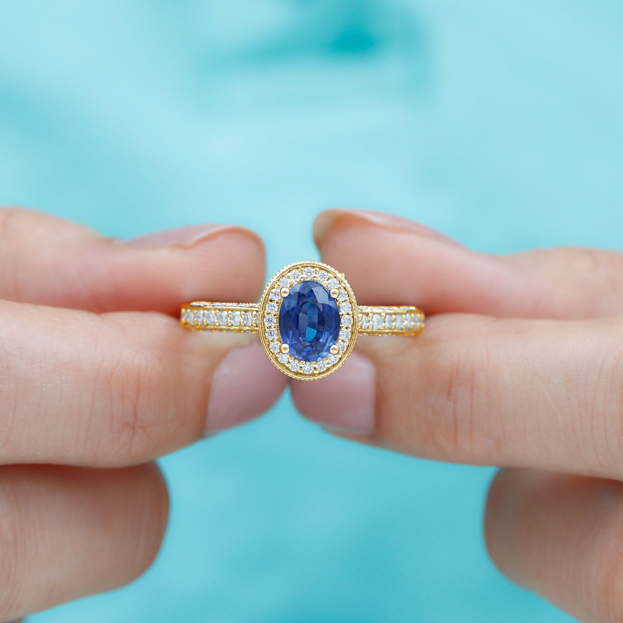 Enhance your engagement with the allure of this Vintage-inspired Ring. The center of attention is the Oval Cut Lab Created Blue Sapphire, elegantly set in a prong setting, adorned with Diamond gemstones, and complemented by delicate Milgrain details. Crafted with precision, this Vintage Engagement Ring is a timeless and sophisticated choice, making it the perfect symbol of your everlasting love and commitment.