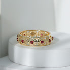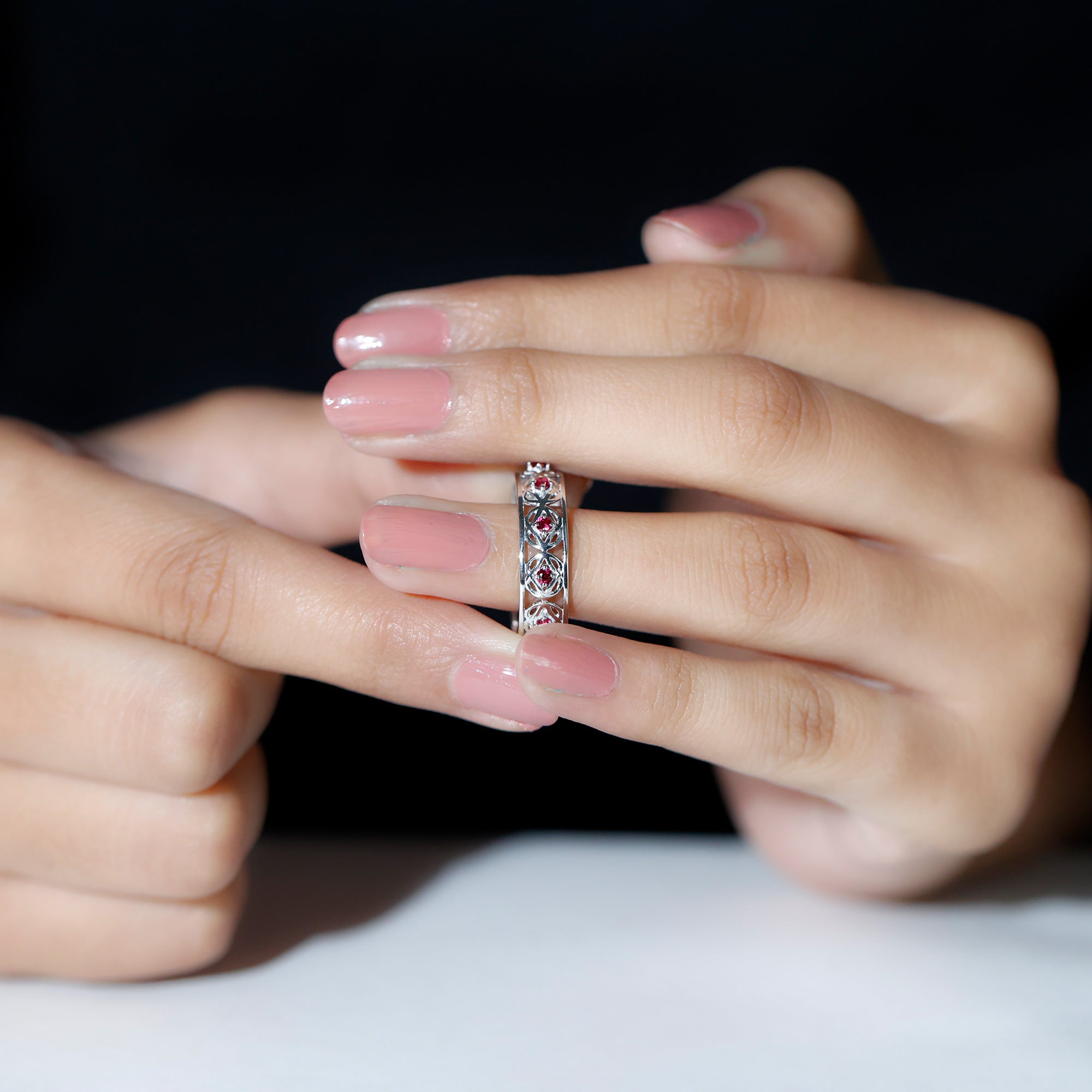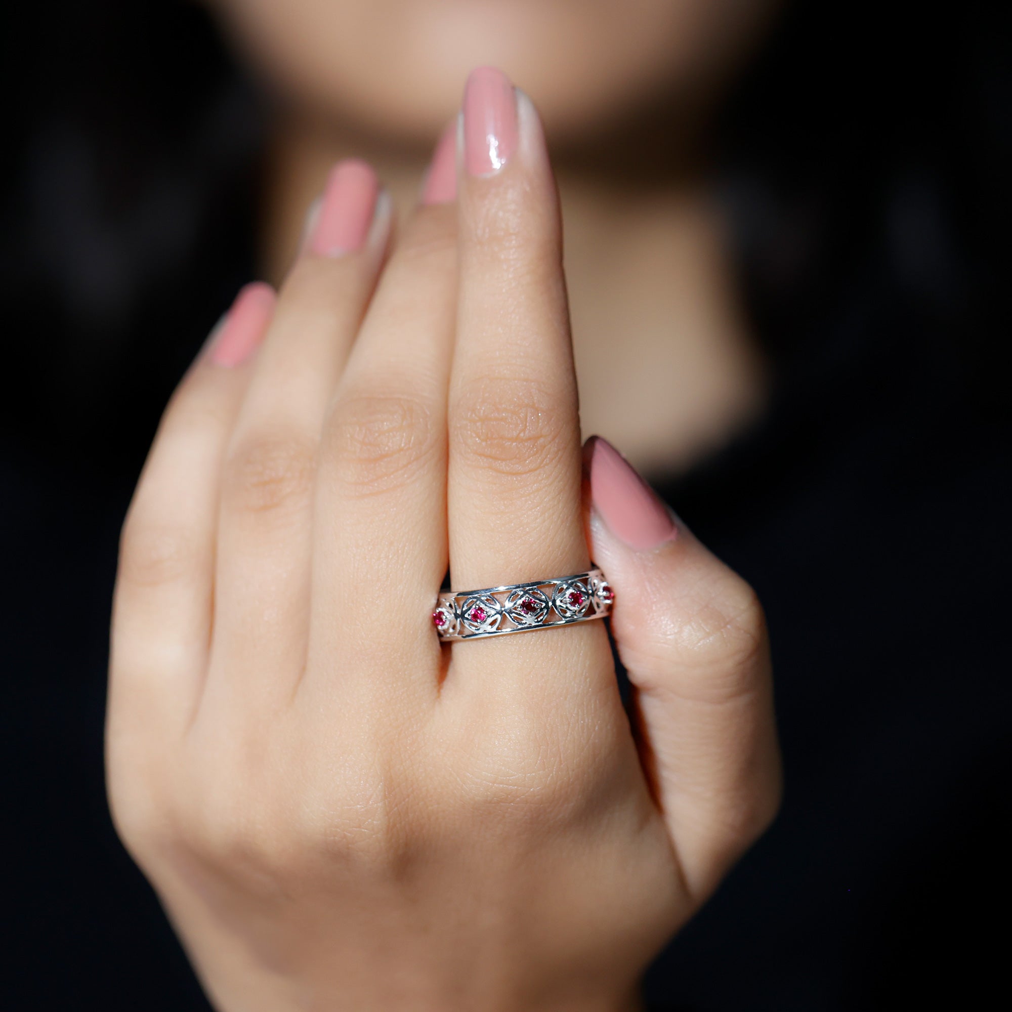 For your beloved partner, embrace the essence of nature with our Lab Created Ruby Eternity Ring. Adorned with Round Created Ruby in a secure 4 Prong Setting, this Vintage Celtic Ring exudes timeless allure. Its a piece to cherish eternally. With Rosec Jewels, relish the opportunity to indulge in meticulously handcrafted jewelry that lets you adorn yourself with utmost elegance.