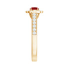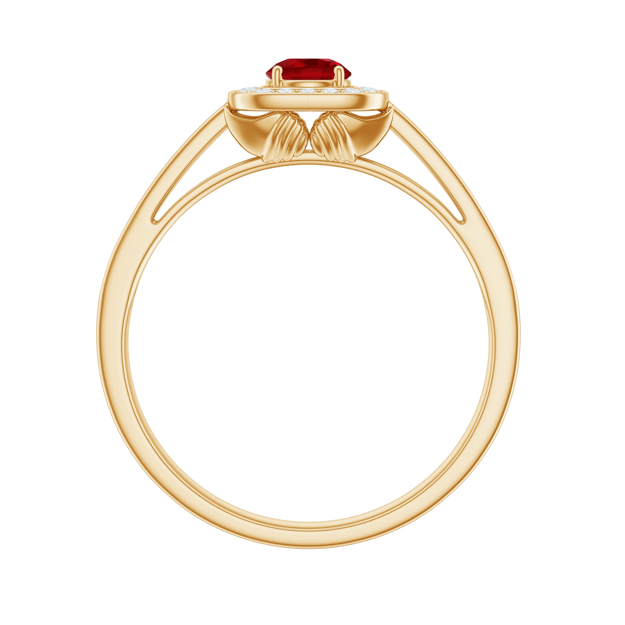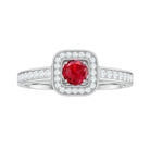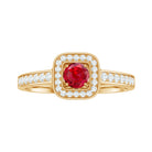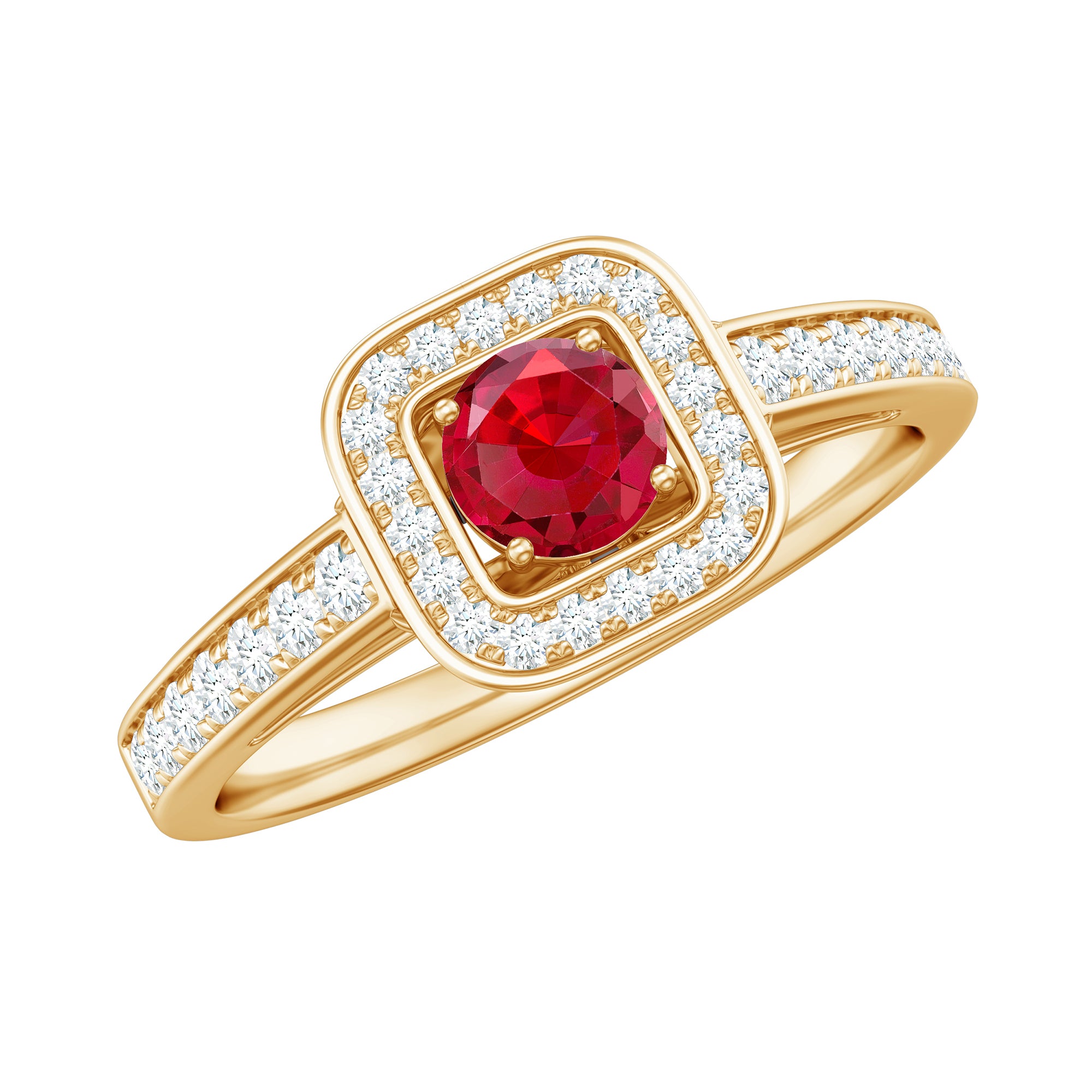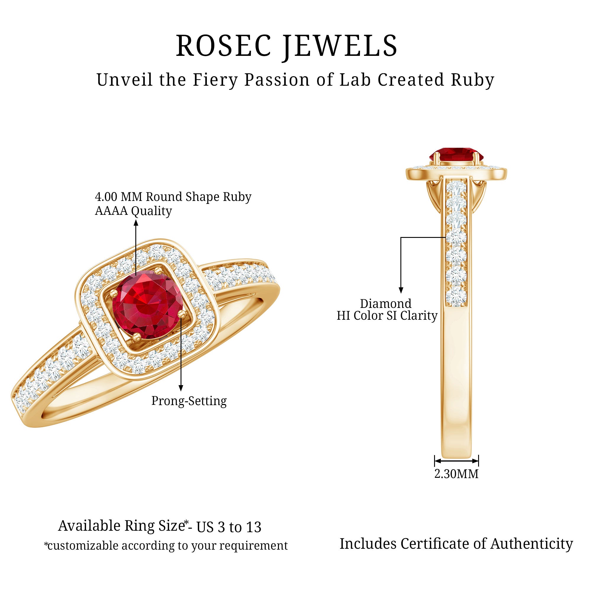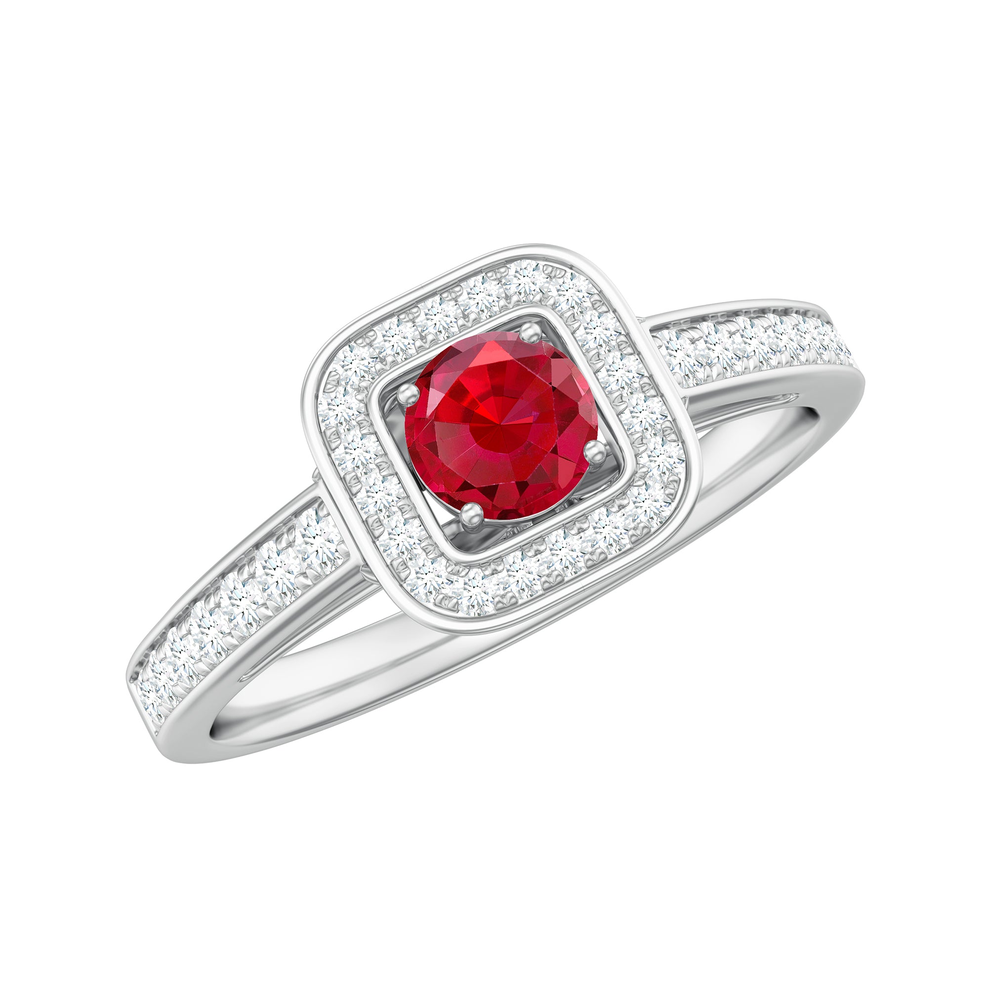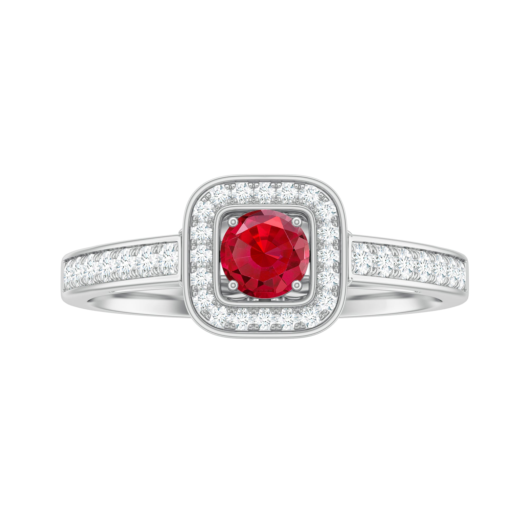 When timeless beauty meets romantic detail, you get a ring that is sure to turn heads and win hearts. Designed to stand out in the sweetest way, this Lab Grown Ruby Engagement Ring brings all the charm and sparkle you could want. At the center of the ring is a 4 MM round cut lab created ruby set in prong setting. It is surrounded by a unique square shaped halo of round diamonds, giving the design a perfect mix of timeless design and vintage style. The extra side diamonds along the band add even more brilliance, making the whole piece shimmer from every angle. With its elegant halo and classic band, it brings an old-world feel that never goes out of style. Whether you are proposing, marking a big moment, or simply giving a gift that matters, this Ruby and Diamond Engagement Ring makes it unforgettable. Crafted with care and attention, the stones are certified and go through strict quality checks, so you know you are getting something that not only looks beautiful but also lasts beautifully. This Vintage Halo Ring is a piece that is made to be worn, loved, and remembered. Elegant and easy to wear every day, this Ruby Vintage Ring is a little piece of your story, captured in sparkle and style.