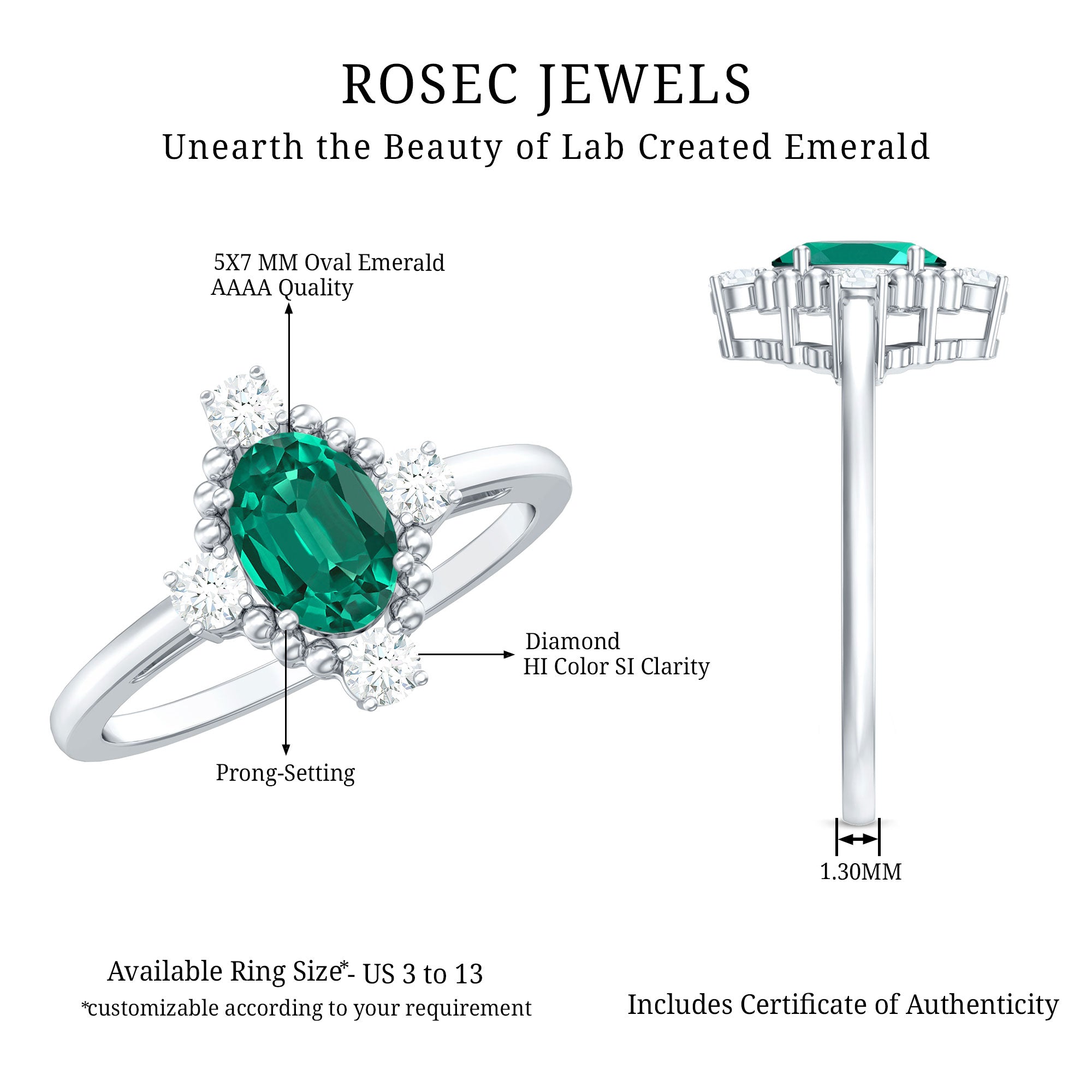 A reminiscent of bygone romance, this Vintage Looking Engagement Ring makes a perfect choice for anyone who want an engagement ring with a touch of history for their special day. At the center of this romantic design is a stunning 5X7 mm Oval Shape Lab Created Emerald of AAAA Quality in Prong Setting, glowing with rich green color. The Lab Emerald is surrounded by a vintage inspired design. Dazzling HI-SI Diamond stones are carefully placed around the design, adding sparkle and elegance. This Oval Engagement Ring blends old-world charm with modern values. The Lab Created Emerald stone is ethically sourced and known for its lush green color. Whether you are drawn to the vintage aesthetic or simply want a ring that stands out from the crowd, this Lab Emerald Diamond Engagement Ring is a true statement of love and individuality. Graceful and full of meaning, this Lab Emerald Solitaire Ring is a piece of jewelry that will make anyone fall in love.