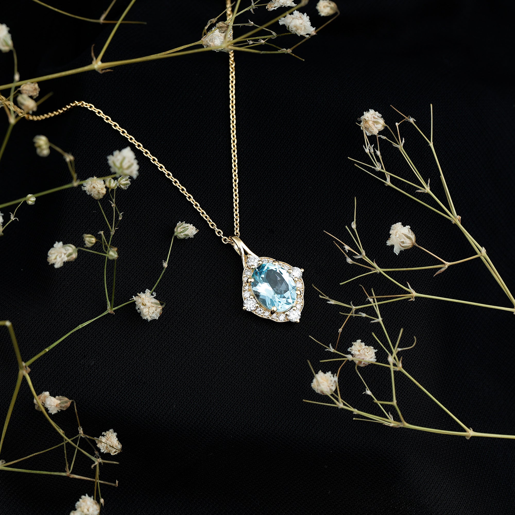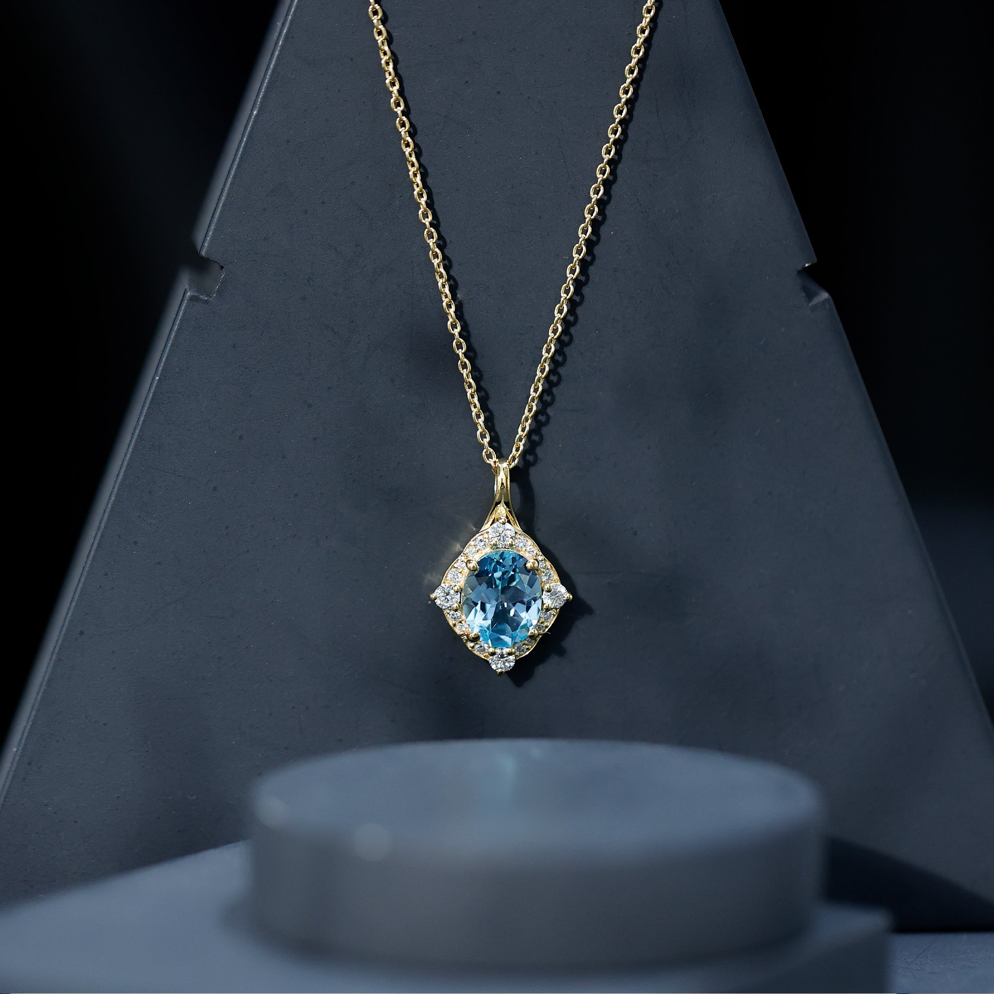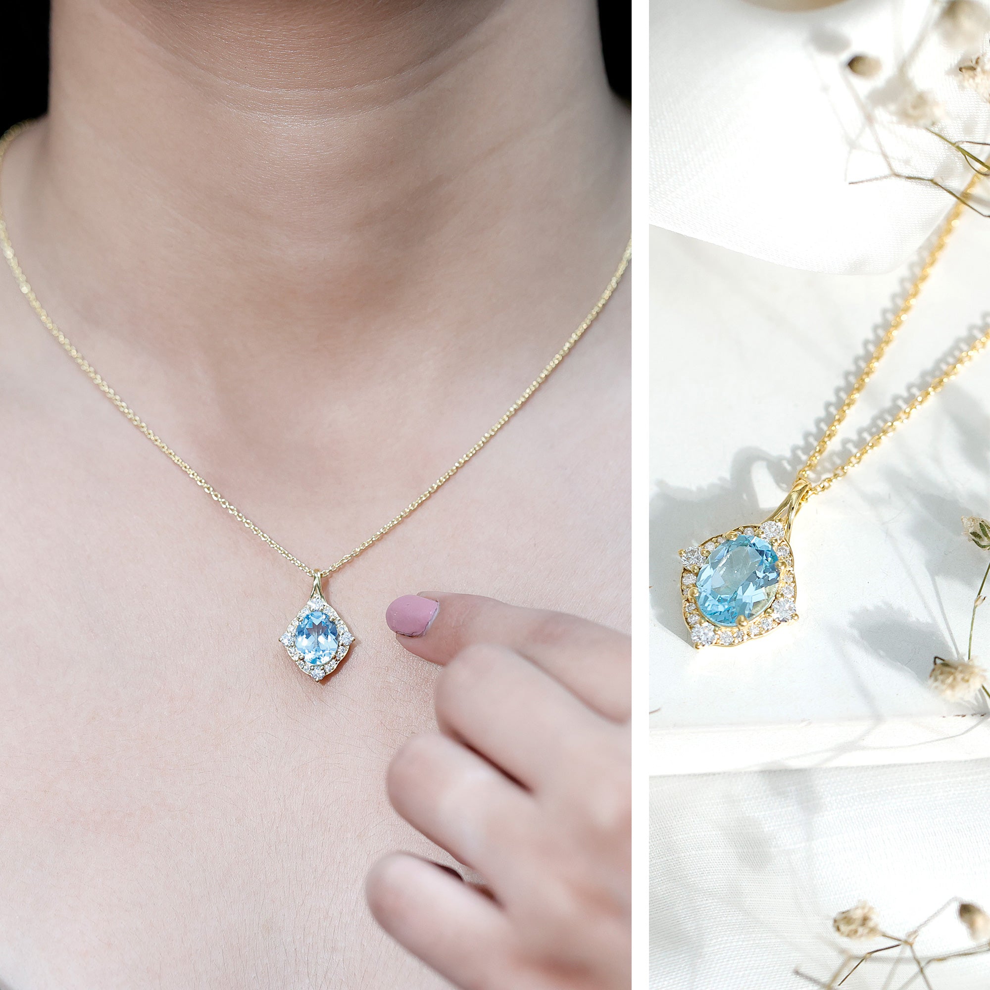 Drawing inspiration from vintage art design, this Sky Blue Topaz Necklace is designed to bring a fresh and calming beauty to your jewelry collection. Handcrafted in 14k yellow gold plated silver, this piece features an 8X10 MM oval shaped Sky Blue Topaz at the center, set in secure prong setting. Surrounding the center stone is a halo of round brilliant cut lab grown diamonds, arranged in a vintage inspired design that gives the Oval Shaped Necklace a timeless, romantic feel. The combination of sparkling diamonds and the sky blue topaz gemstone creates a lovely contrast that feels both graceful and eye-catching. This Vintage Art Deco Necklace hangs from a matching chain and sits comfortably around the neckline, making it easy to wear every day or on special occasions. The AAA quality Sky Blue Topaz and EF-VS quality lab created diamonds make it not only beautiful, but also a piece you can treasure for years to come. Arriving in a beautifully packaged jewelry box, this Blue Topaz and Diamond Necklace is ready to gift or keep for yourself, a thoughtful gesture, a timeless design, and a little sparkle you will love every time you wear it.