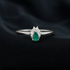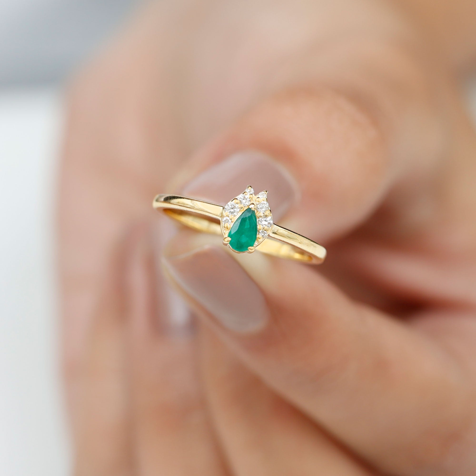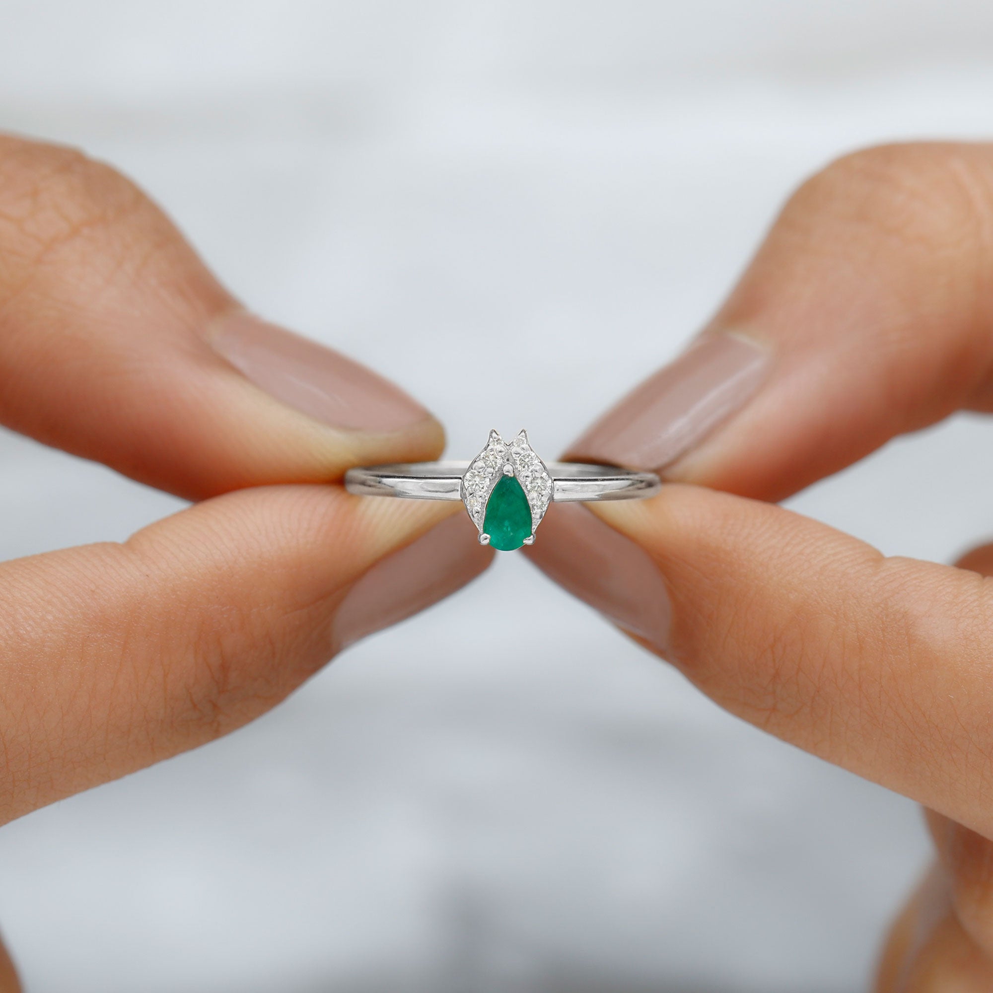A beautiful symbol of love and devotion, this Emerald and Diamond Ring is a timeless way to show your promise and commitment. At the heart of the Minimalist Promise Ring shines a 3X5 MM pear shaped emerald, set securely in prong setting. Flanking it are round brilliant cut diamonds that sit in a unique frame, adding a soft sparkle that perfectly complements the emerald’s rich hue. The combination of the emerald’s vibrant green and the diamond’s bright shine creates a lovely balance of color and light that feels both classic and modern. Perfect as a promise ring, a gift of friendship, or a token of lasting love, this Emerald Promise Ring is a heartfelt way to express your feelings. Its delicate design and graceful charm make it a piece she will treasure for years to come. Every stone in this Pear Shaped Ring is expertly crafted, and it comes with a certificate for quality and authenticity, so you can be confident in its lasting beauty. Available in a variety of ring sizes, it is designed to fit comfortably while maintaining its elegant look.