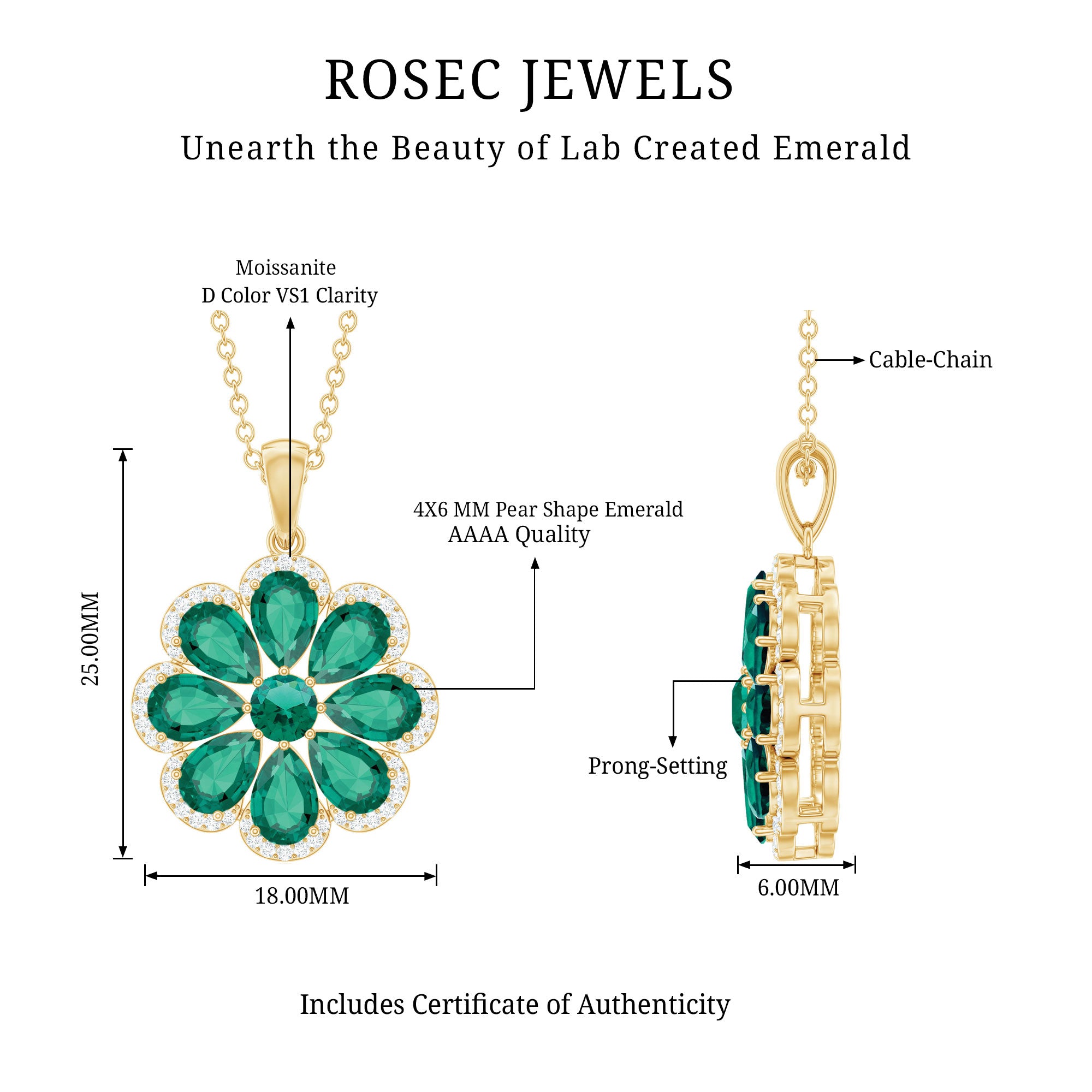 A whisper of nature’s beauty brought to life, this Lab Created Emerald Flower Necklace captures the enchantment of a blooming garden wrapped in fine jewelry artistry. At its heart lies a brilliant round lab created emerald, surrounded by pear cut emeralds that unfold like delicate petals. Completing the design, a halo of dainty round moissanite stones adds a radiant sparkle, enhancing the pendant’s shape with a soft brilliance. Crafted with precision and intention, this Emerald Pendant Necklace is as meaningful as it is beautiful. Every gemstone is ethically lab created, offering an eco-friendly alternative without compromising on quality or elegance. The harmonious blend of AAAA quality lab made emeralds and D-VS1 quality moissanite creates a piece that stands out effortlessly, perfect for elevating both everyday wear and special occasions. Suspended from a sleek chain, this Floral Pendant Necklace rests gracefully along the neckline, adding a touch of sophistication and a hint of vibrant color to any ensemble.
